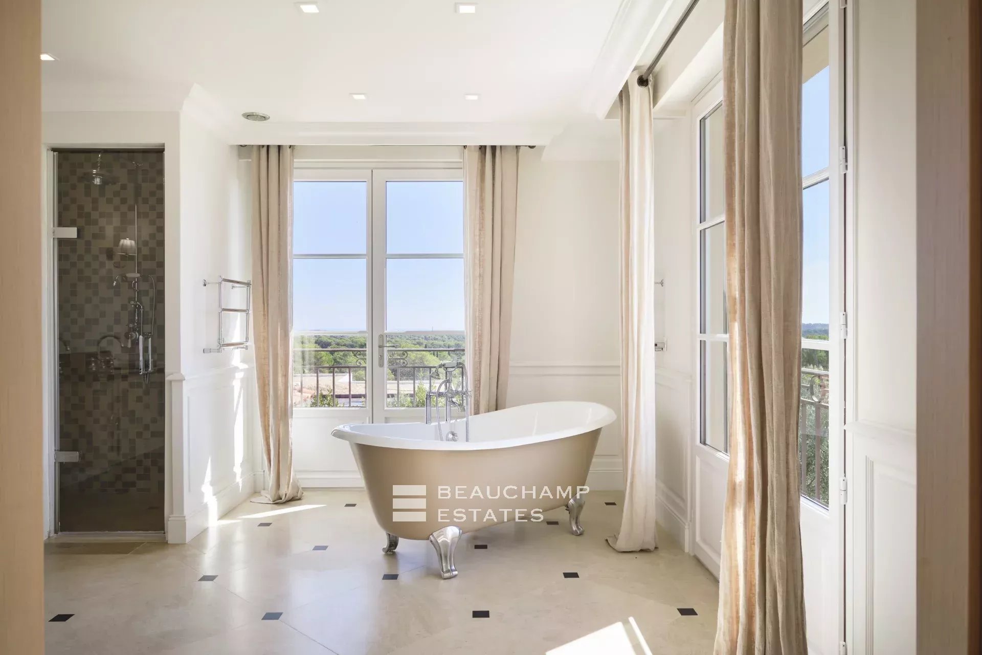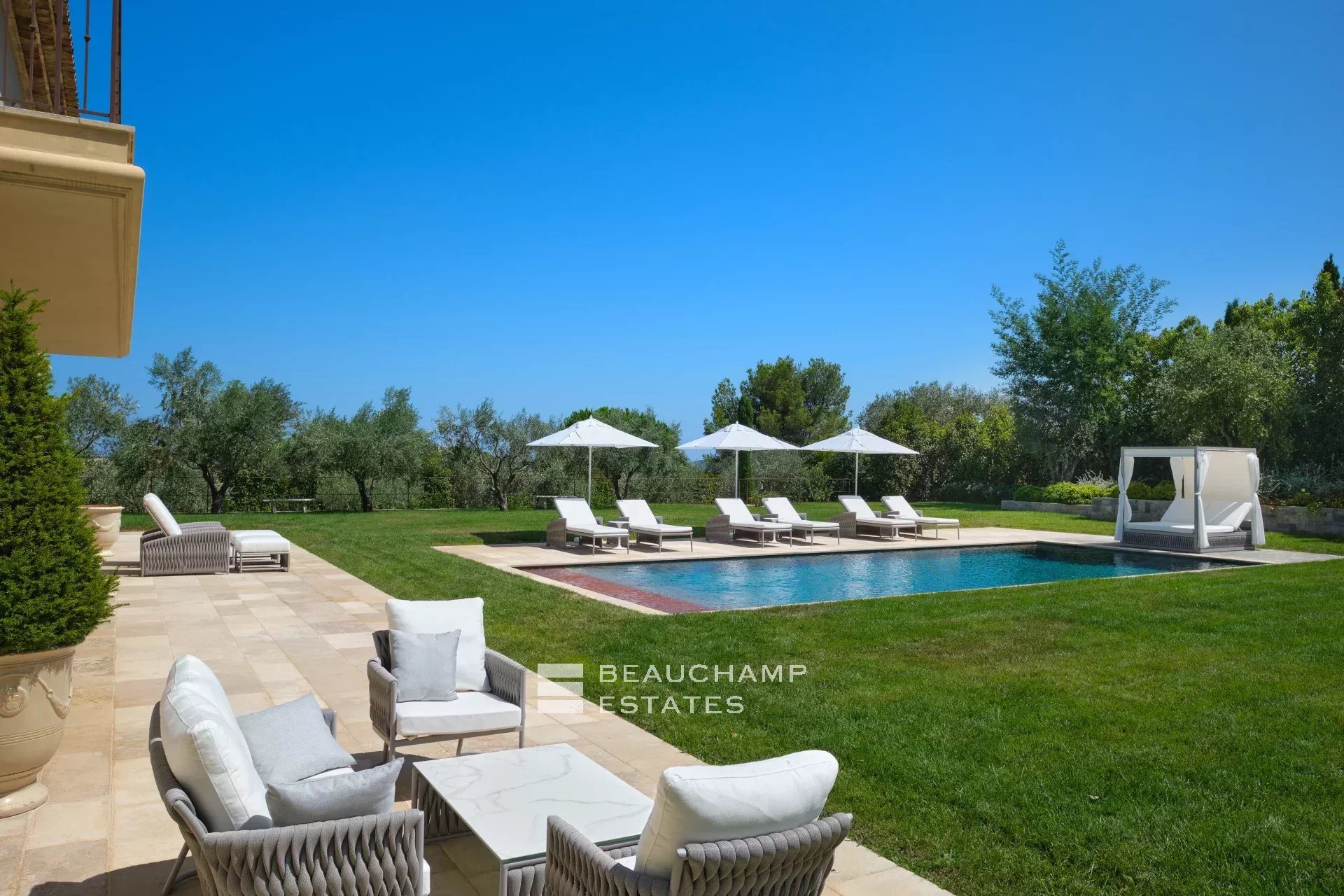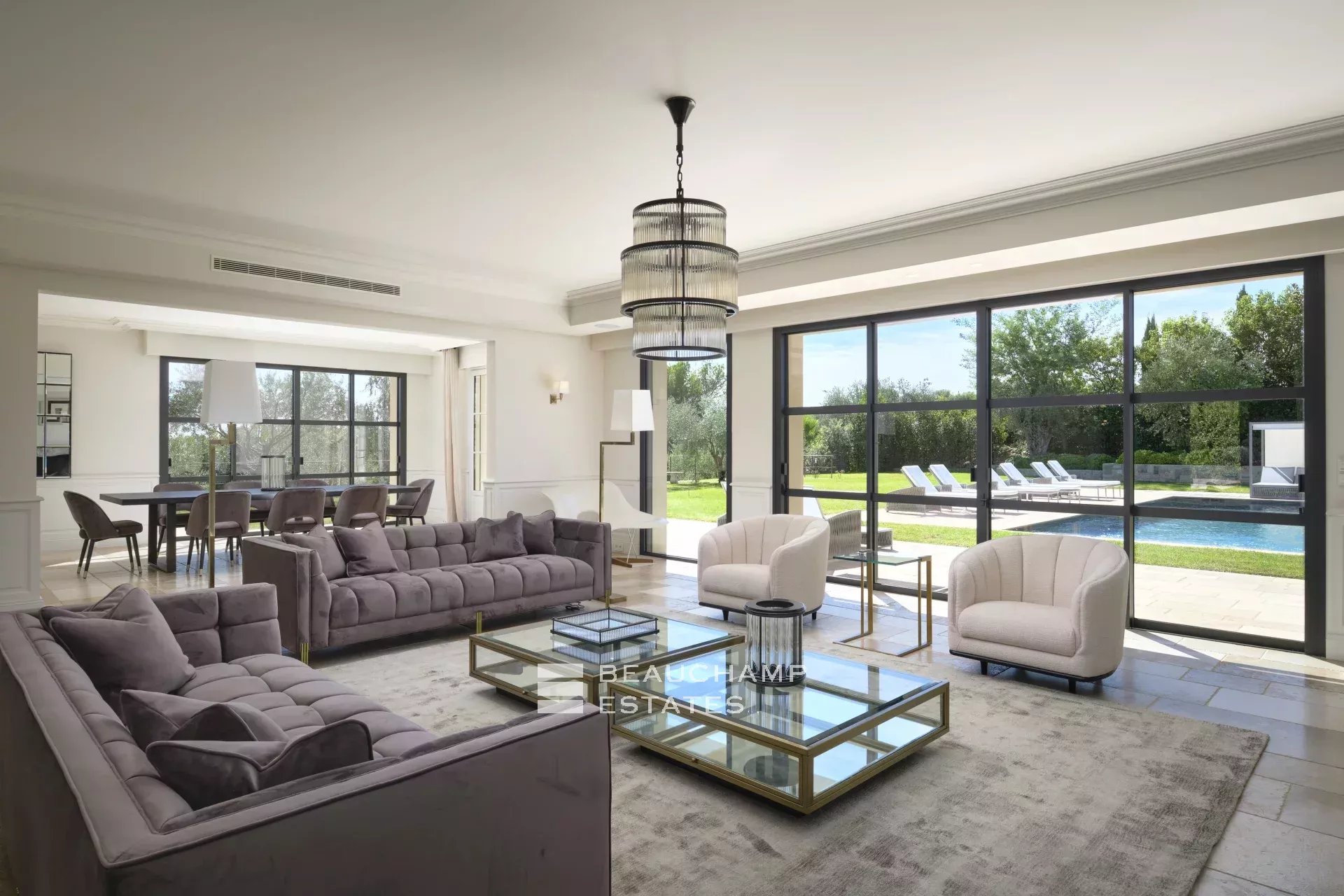 Sur l'une des collines les plus recherchées de Mougins, cette bastide récente d’environ 480 m² s’étend sur un terrain plat et paysagé de 3296 m², à proximité des golfs, des écoles internationales et de Cannes.