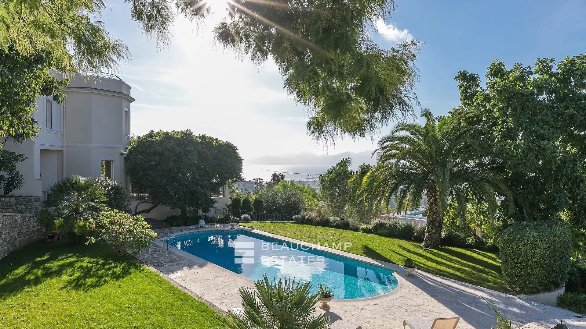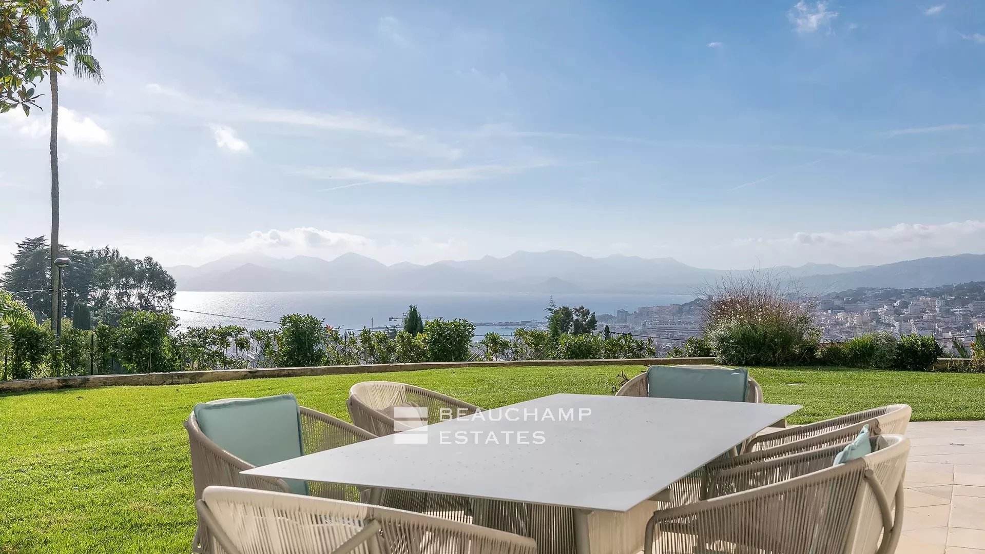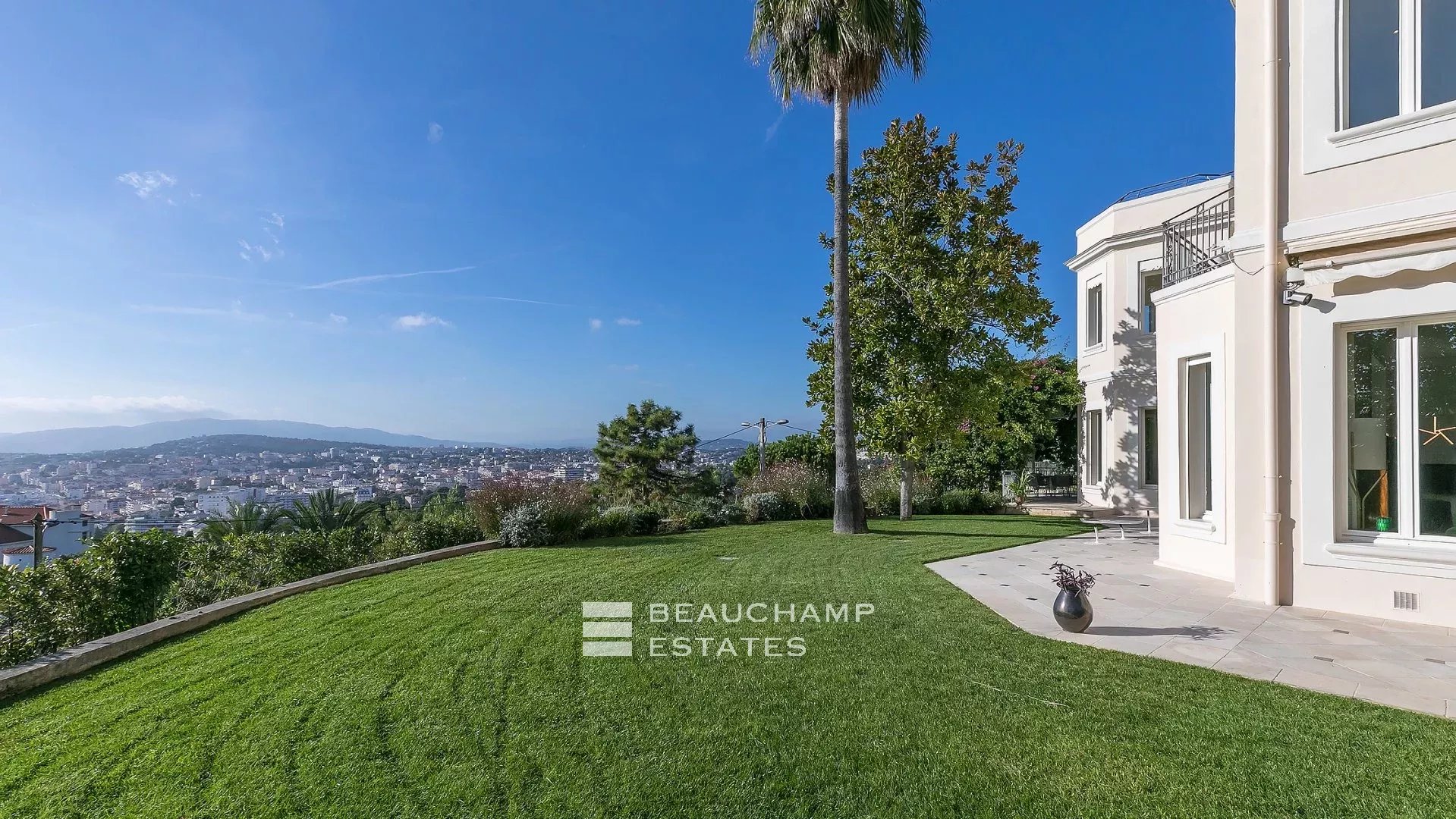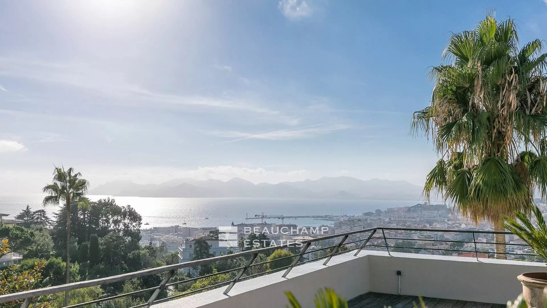 La demeure, bâtie sur la partie supérieure de la Californie, domine la Baie de Cannes et propose de somptueuse vues sur la mer, le vieux port et le massif de l'estérel, et ce à seulement 15 mn à pied (en descendant) de La Croisette et 20 mn du Palais des Festivals.