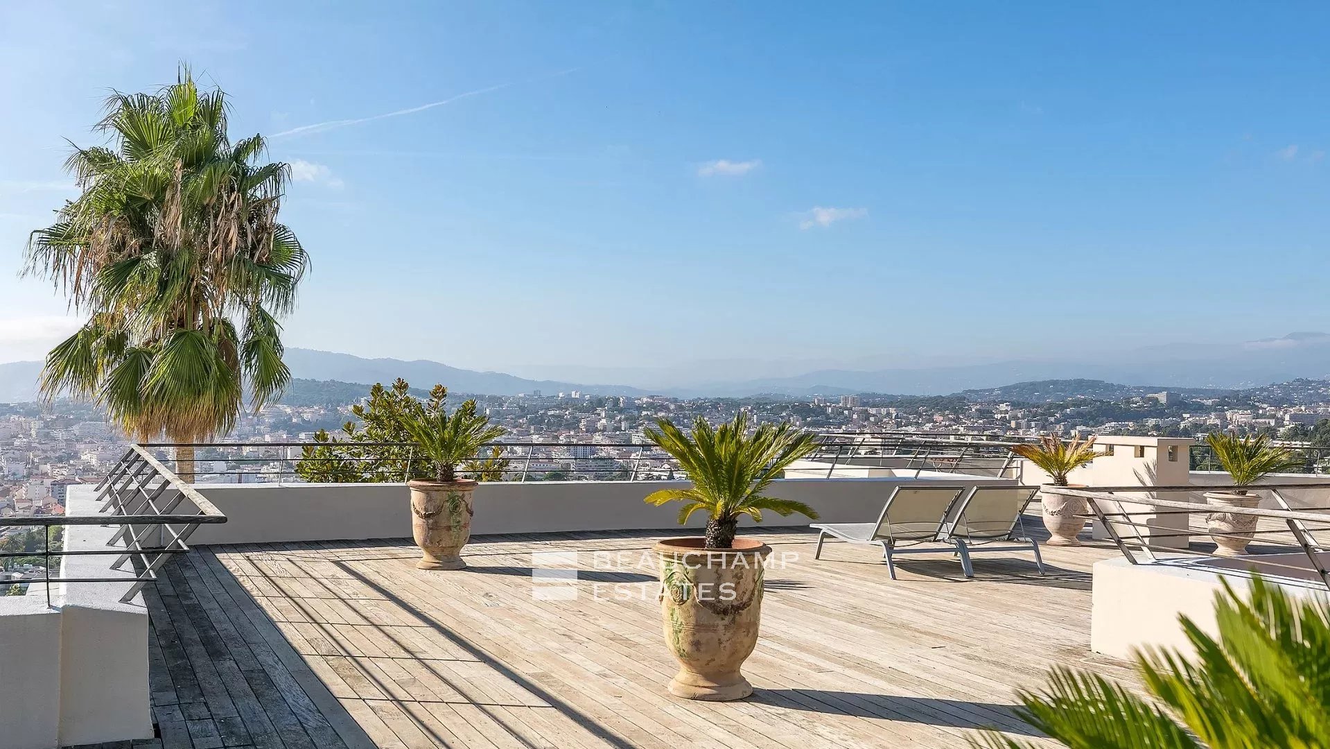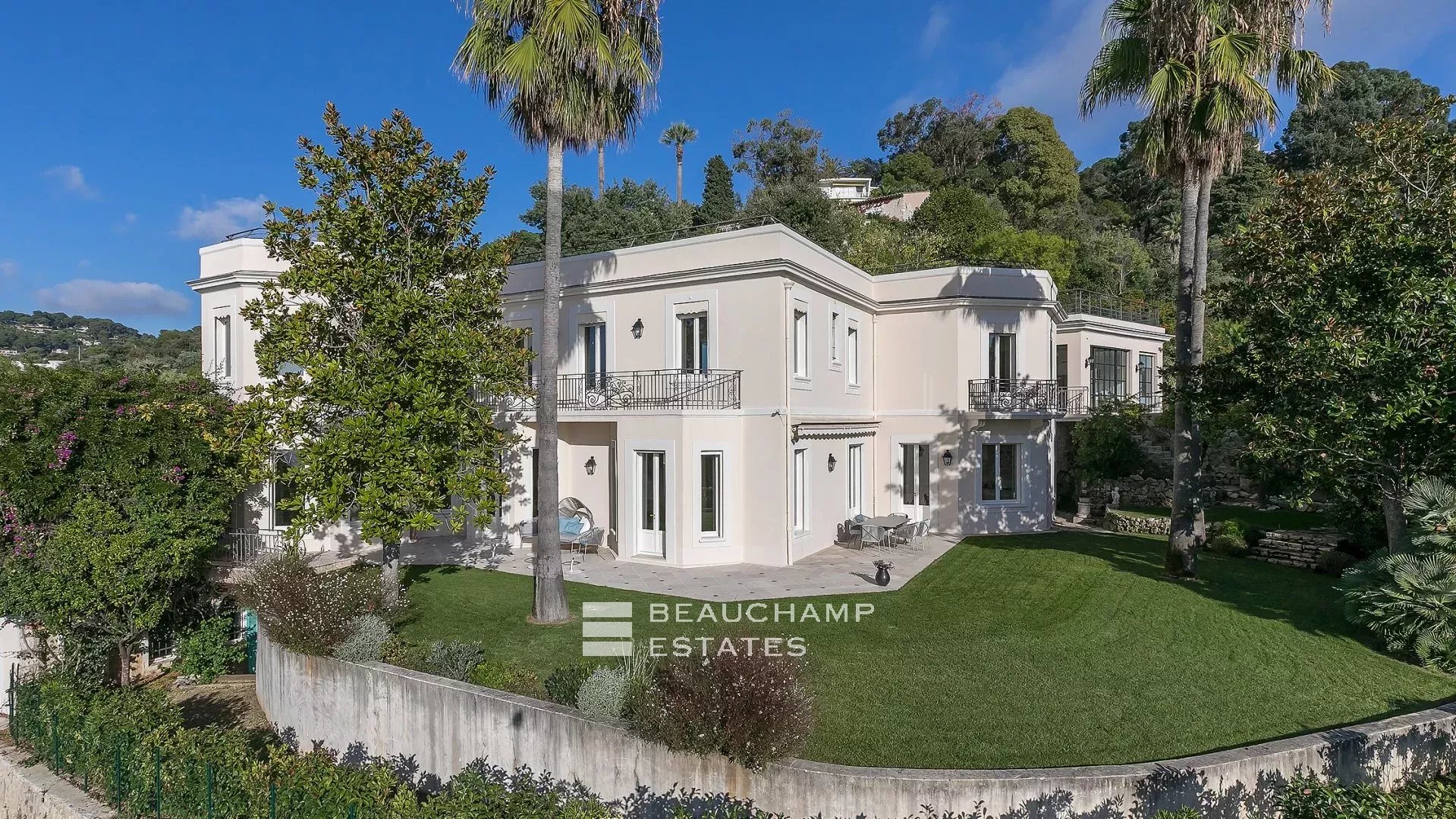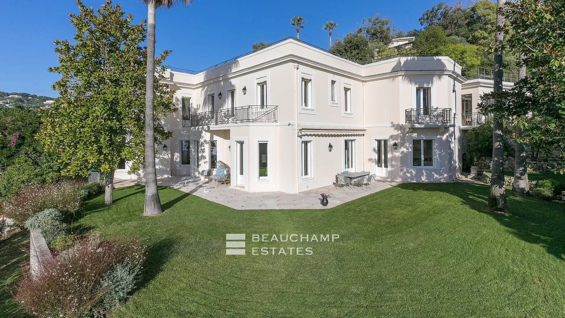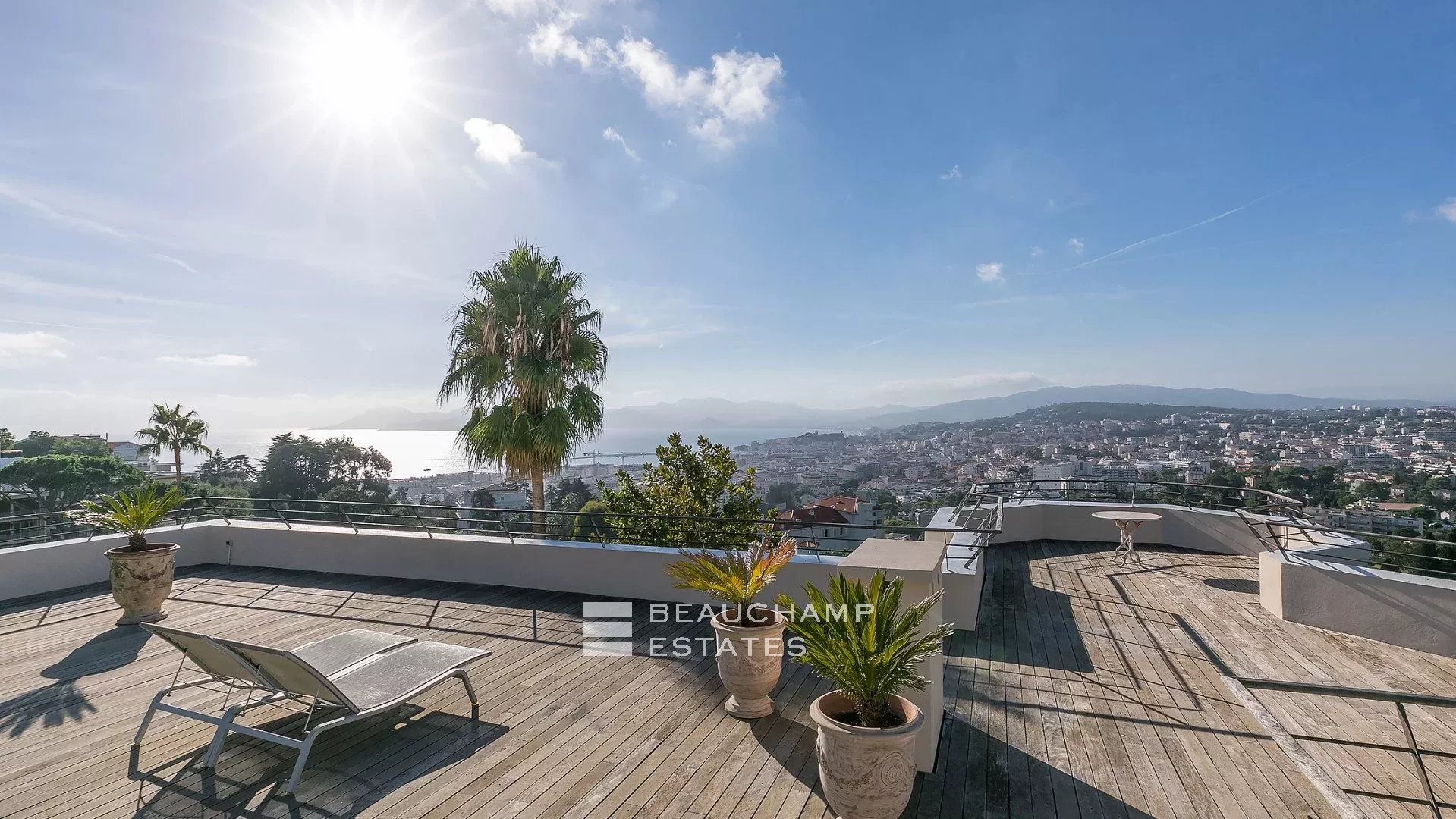La demeure, bâtie sur la partie supérieure de la Californie, domine la Baie de Cannes et propose de somptueuse vues sur la mer, le vieux port et le massif de l'estérel, et ce à seulement 15 mn à pied (en descendant) de La Croisette et 20 mn du Palais des Festivals.
