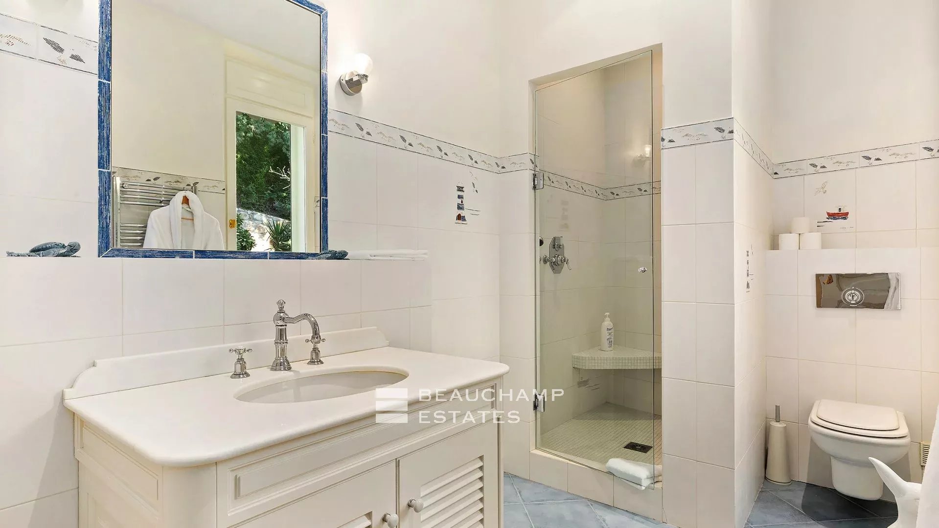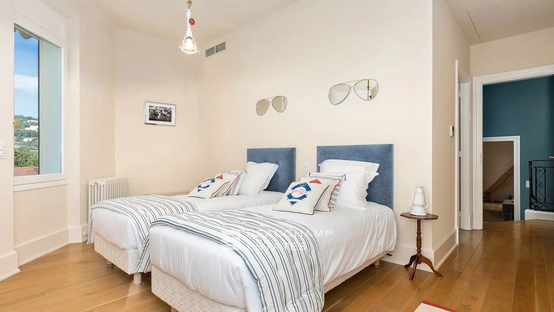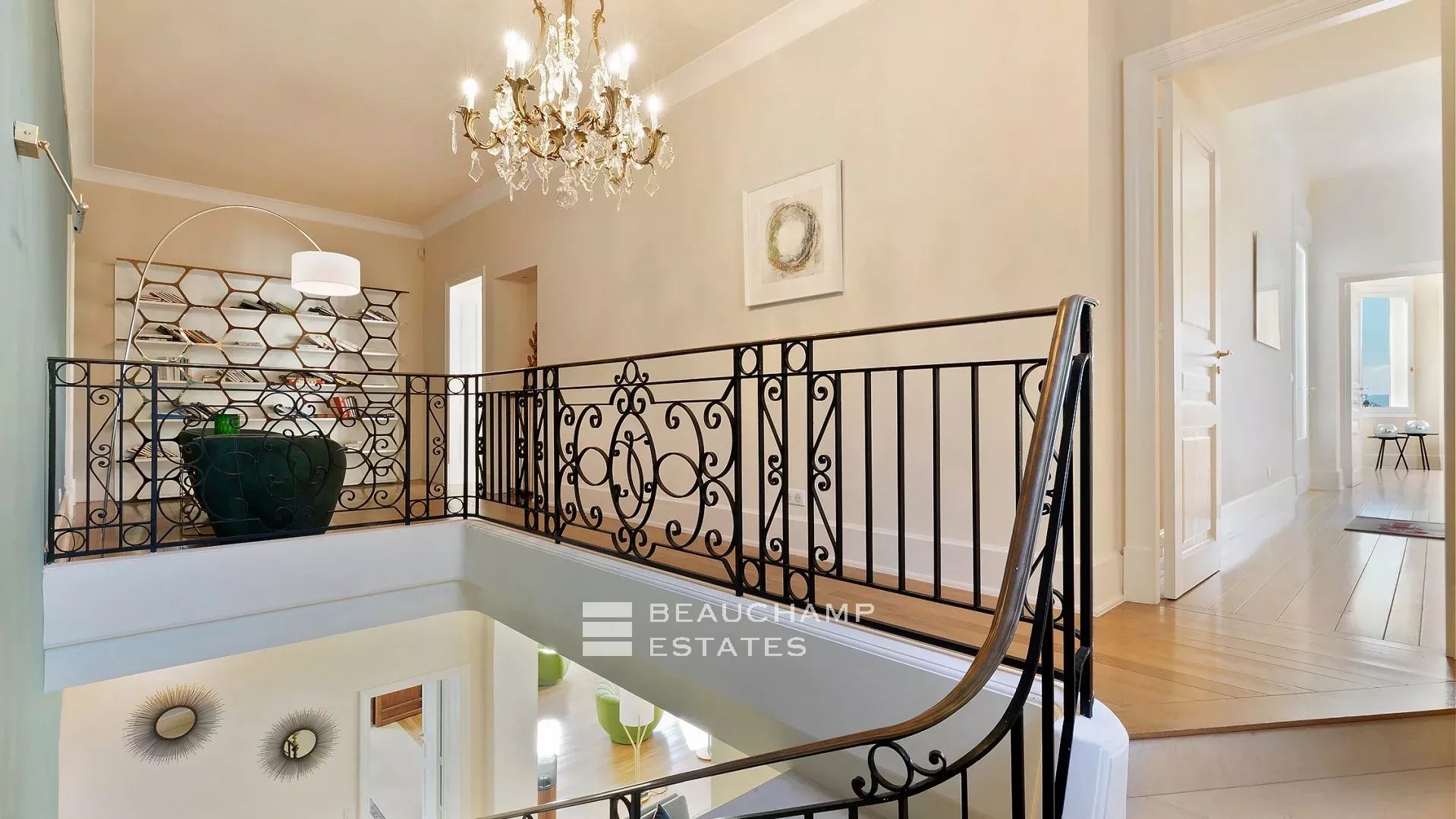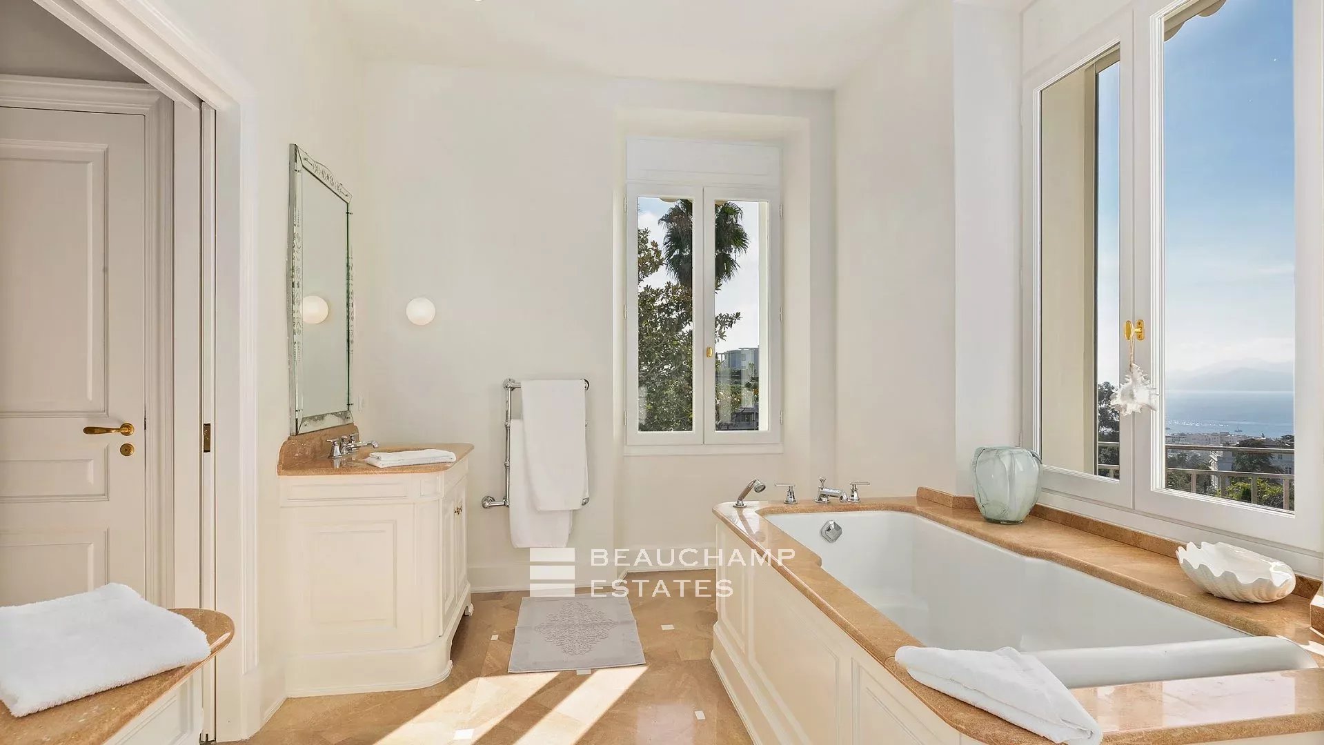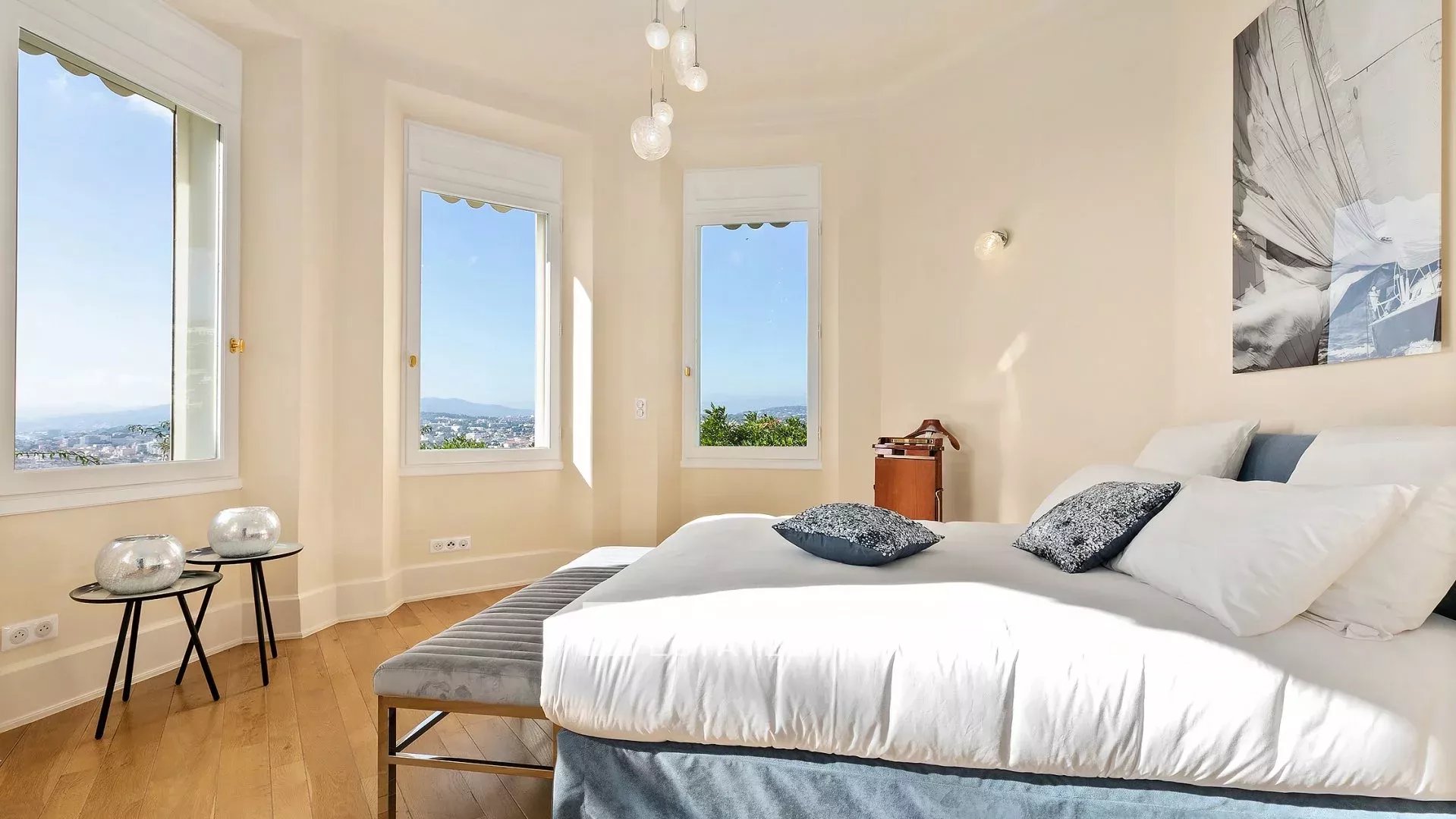 La demeure, bâtie sur la partie supérieure de la Californie, domine la Baie de Cannes et propose de somptueuse vues sur la mer, le vieux port et le massif de l'estérel, et ce à seulement 15 mn à pied (en descendant) de La Croisette et 20 mn du Palais des Festivals.