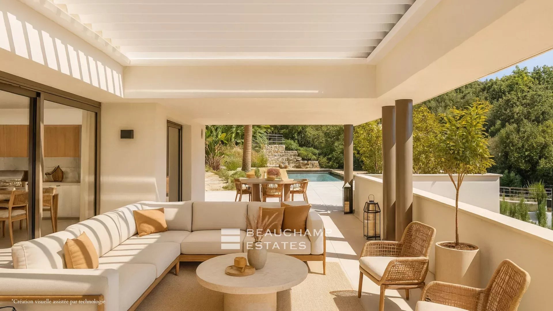 Les extérieurs ont été aménagés dans un esprit contemporain et méditerranéen offrant une piscine, un sauna, un pool house.