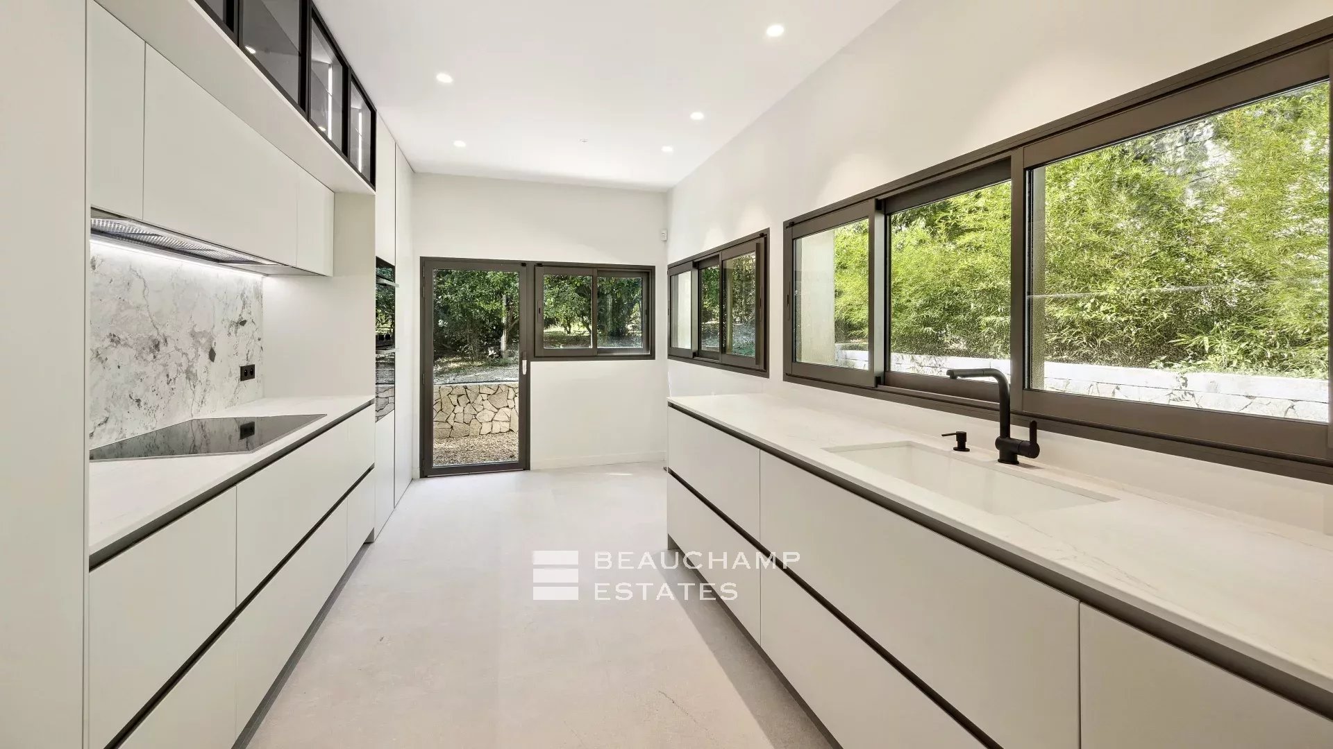 Cette villa contemporaine d'une superficie de 377 m2 avec vue mer a été entièrement rénovée et bénéficie de prestations haut de gamme.