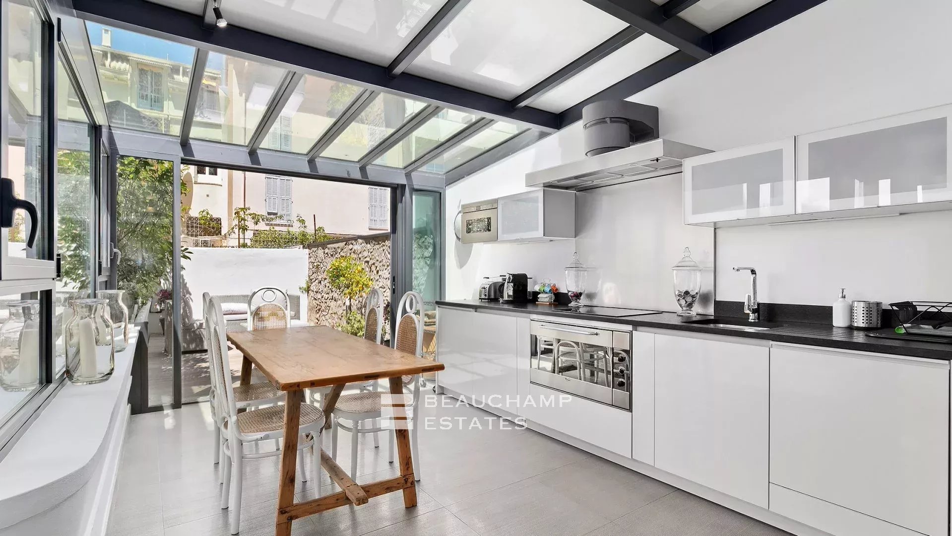 Il se compose d'un séjour donnant accès à la terrasse d'environ 23m2, d'un espace salle à manger, d'une agréable cuisine dotée d'une verrière et entièrement équipée, d'une chambre de Maître en suite avec salle de douche et toilette, deux chambres en suite avec salle de douche, et d'un toilette invités.