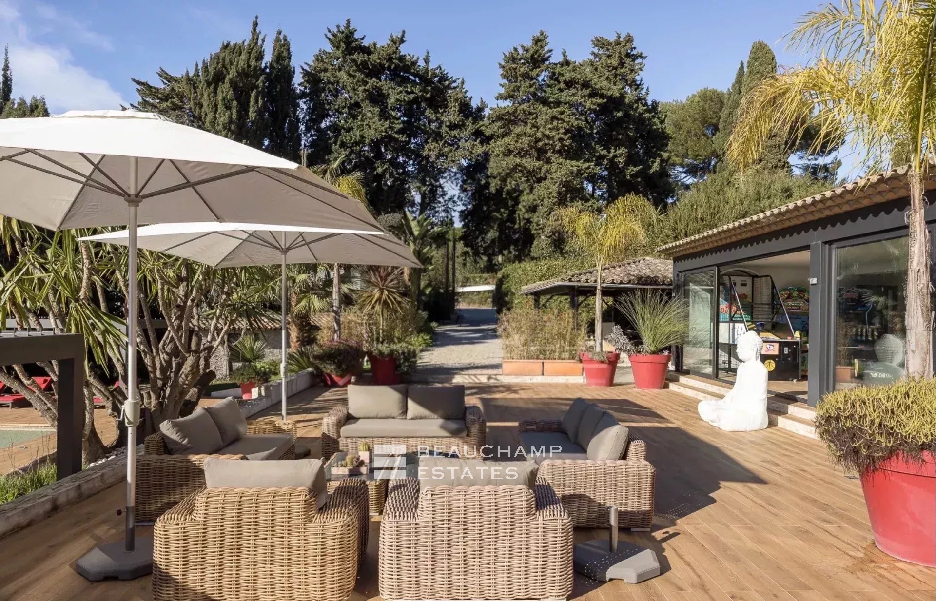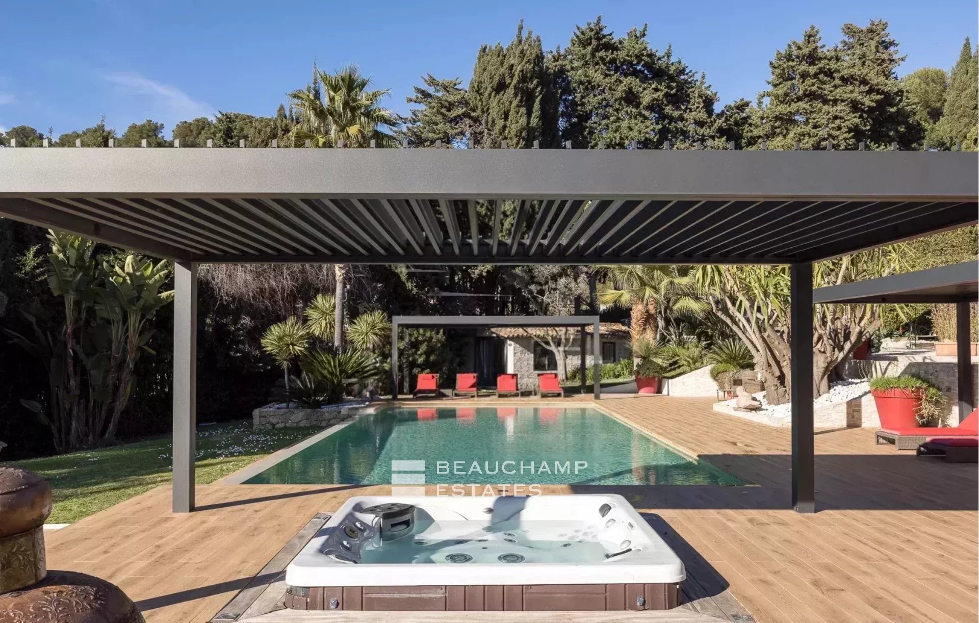 Située dans l’un des quartiers les plus résidentiels de Cannes, exposée sud/ouest, sans vis à vis et bénéficiant d’une remarquable vue sur la mer, cette belle propriété de style provençal moderne, entièrement rénovée, offre de beaux espaces de réception, très lumineux se prolongeant sur une terrasse, le jardin et la piscine, ce qui lui confère un confort rarement égalé. 7 chambres dont deux indépendantes avec salles de bains ou douche viennent compléter ses atouts. Beau jardin d’environ 2 485 m² entièrement paysagé, piscine, jacuzzi, abri pour 2 voitures. Idéal maison de famille.
