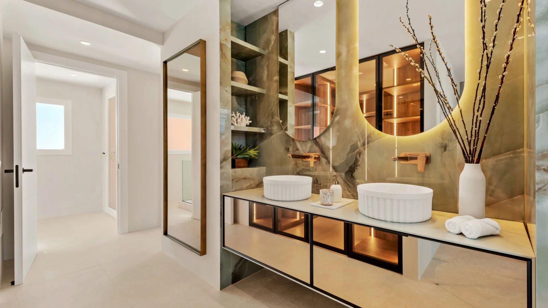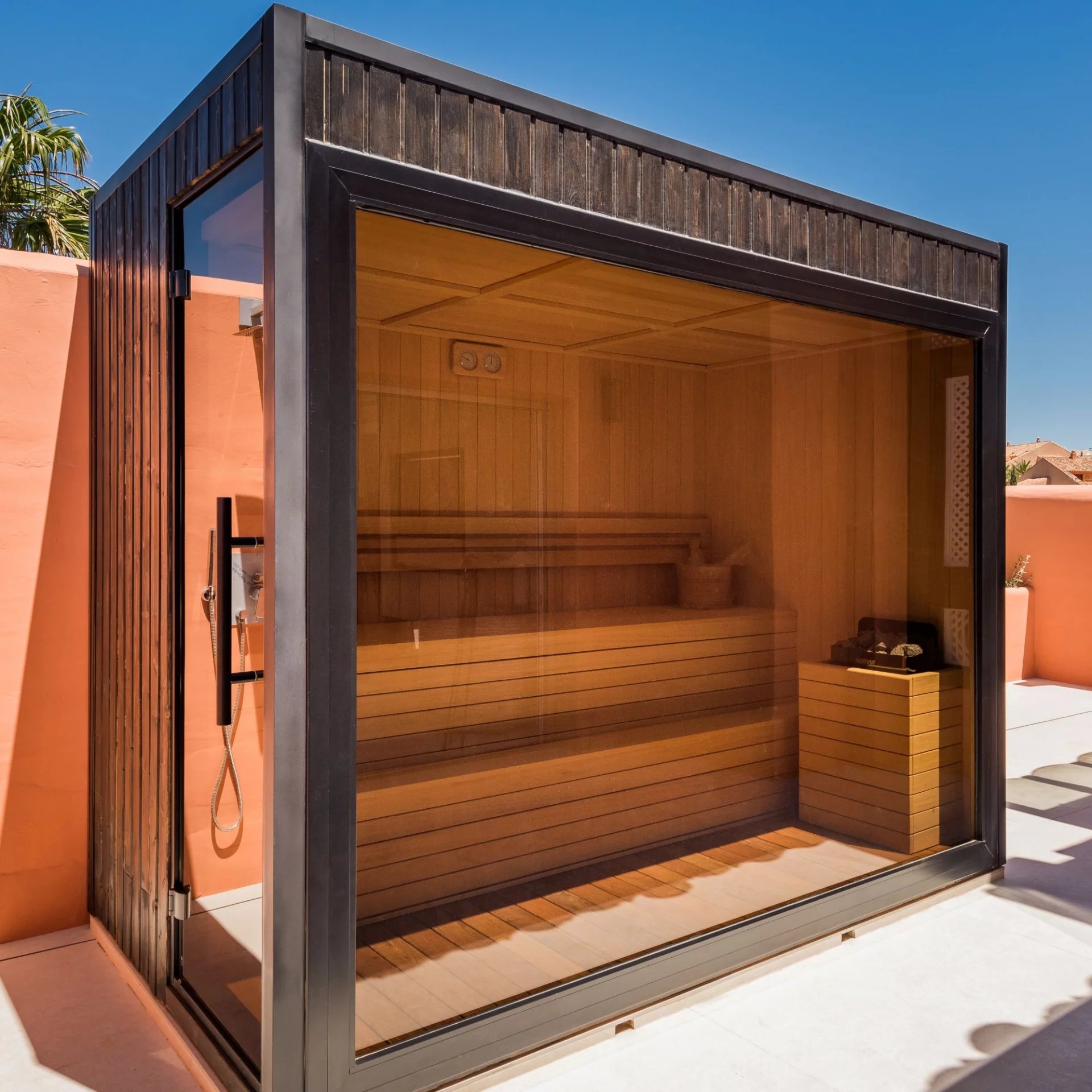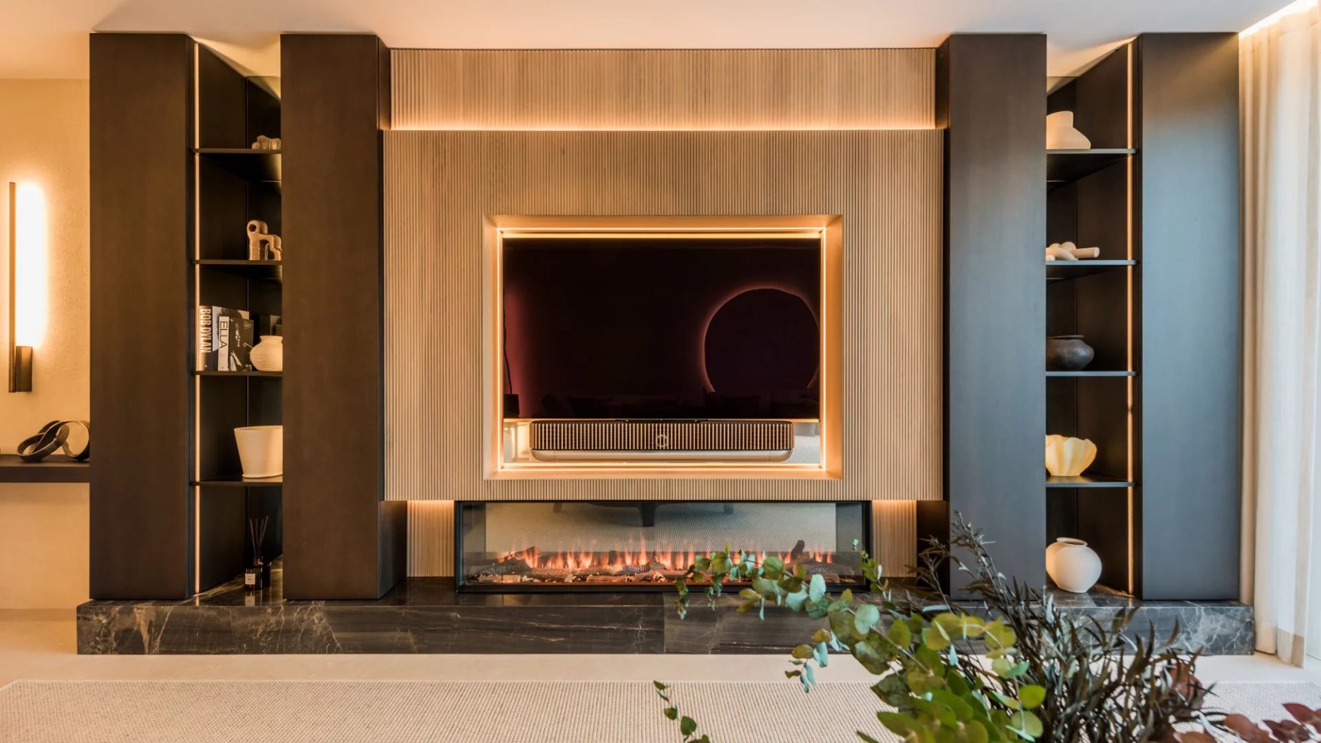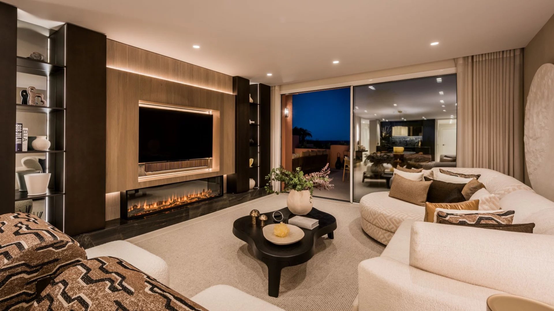 La propriété présente des finitions haut de gamme, notamment des sols élégants, une cuisine design Siematic équipée d'appareils Gaggenau, une cheminée électrique, des armoires sur mesure et un système audio Bang & Olufsen. Les espaces extérieurs sont aménagés avec des meubles Kettal exclusifs, créant ainsi une atmosphère propice à la détente. Le chauffage par le sol assure un confort tout au long de l'année dans l'ensemble de la maison.