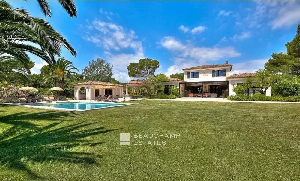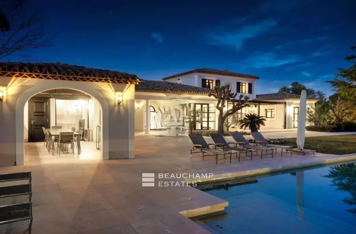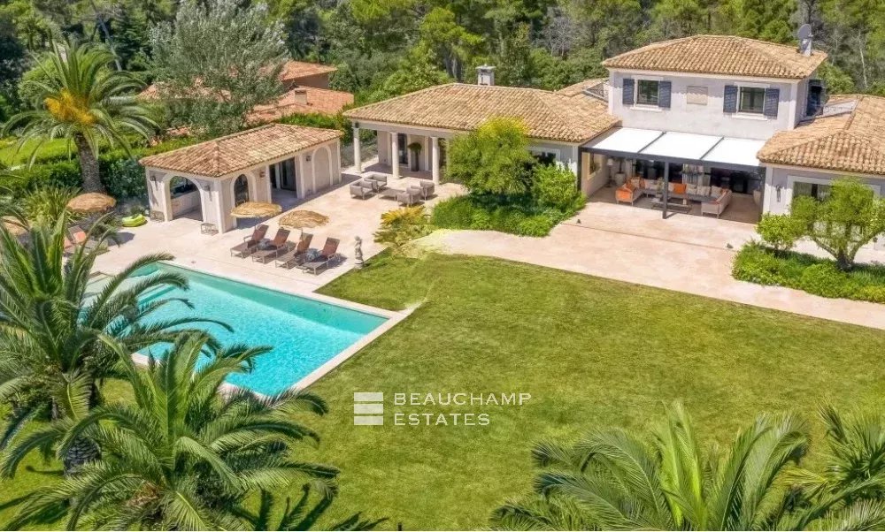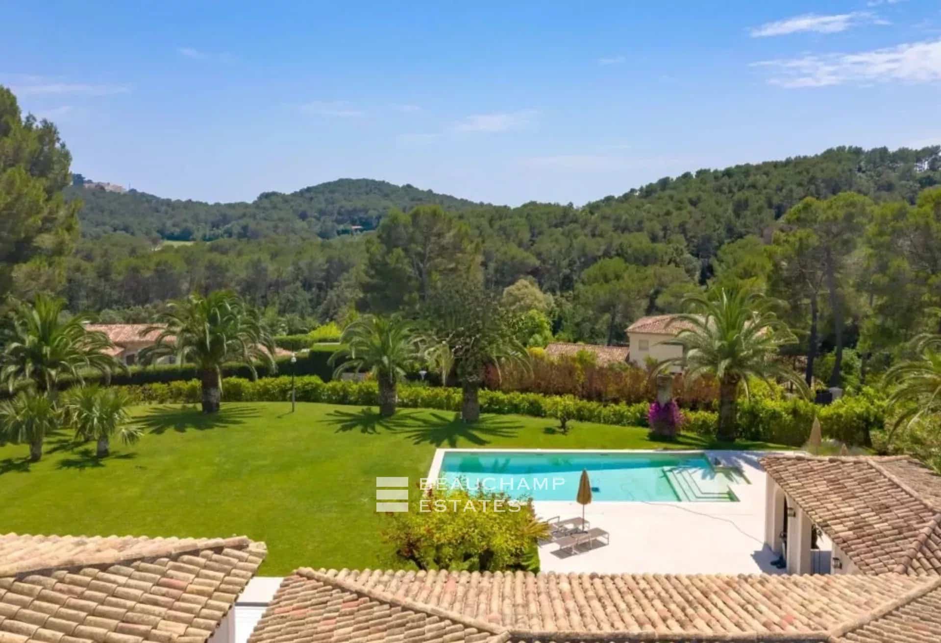 Dans un cadre enchanteur, cette luxueuse villa familiale profite d'un emplacement idéal : 5 min de deux des plus beaux golfs de la région, et d'un club de tennis, 25 min de l'aéroport de Nice et 15 min de Cannes.