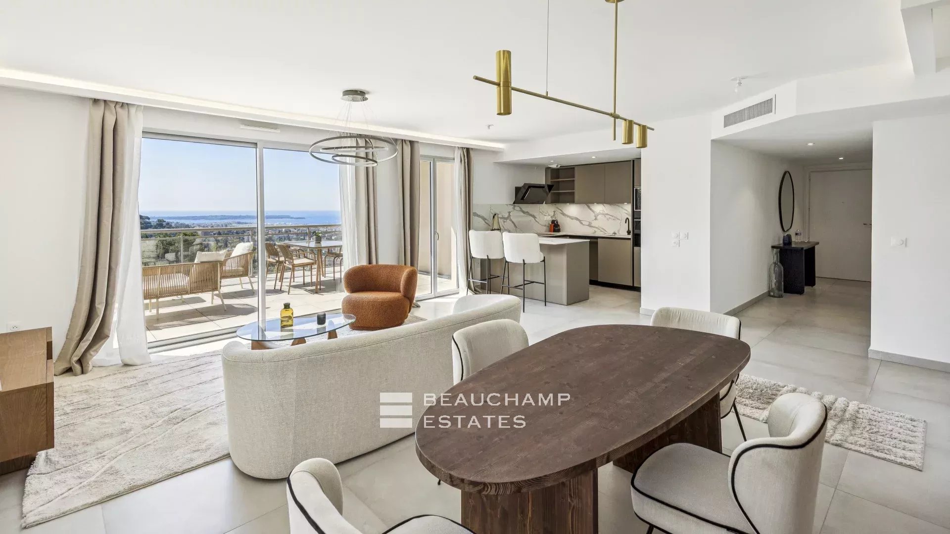 Situé sur les hauteurs du Cannet, à 10 minutes de Cannes, bel appartement 4 pièces en dernier étage d'environ 116 m2 qui offre une vue mer panoramique et se compose d'un vaste séjour avec cuisine ouverte, trois chambres avec salle de douche/bain et toilettes et une toilette invités, une grande terrasse d'environ 25 m² et deux balcons.