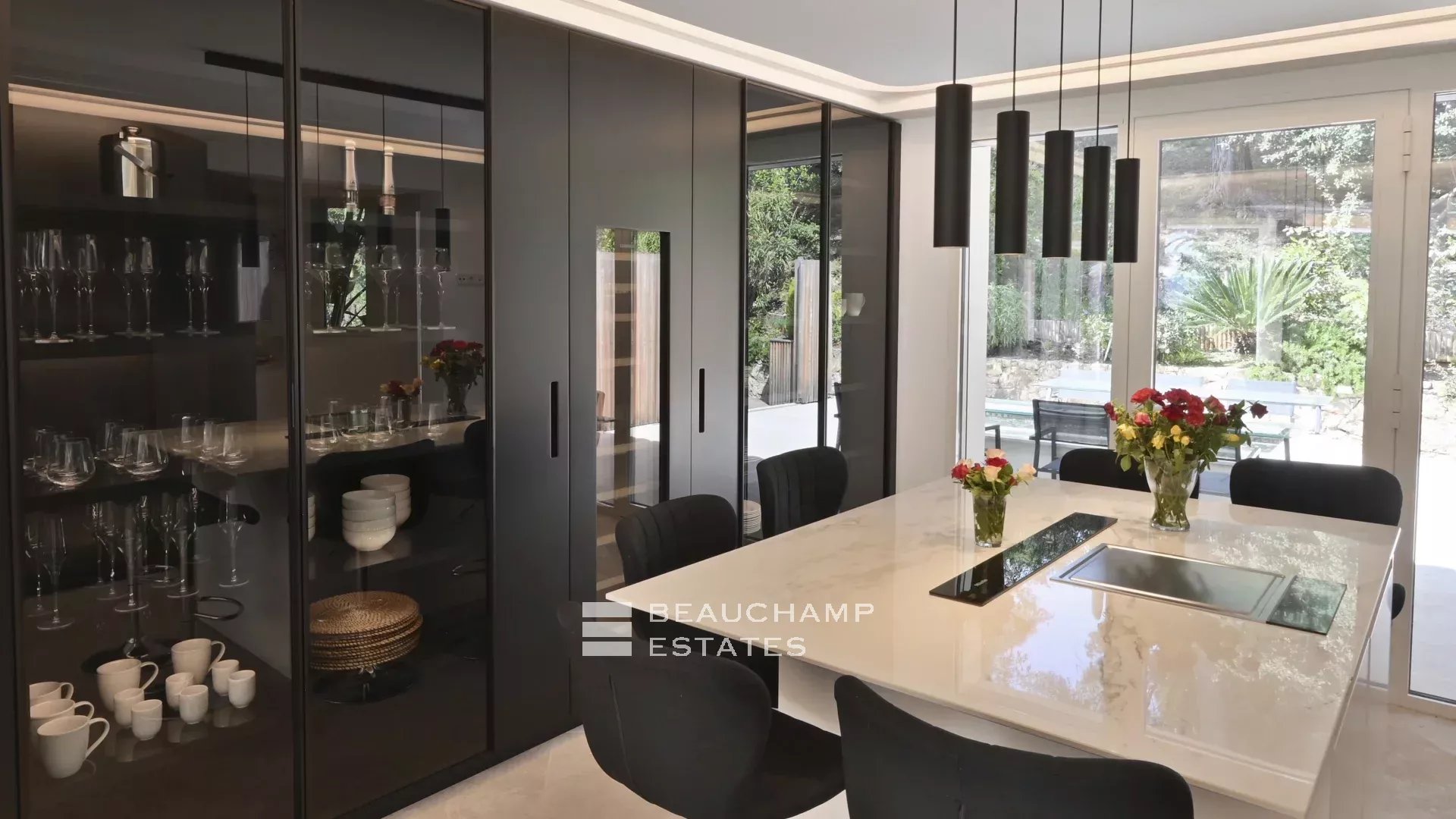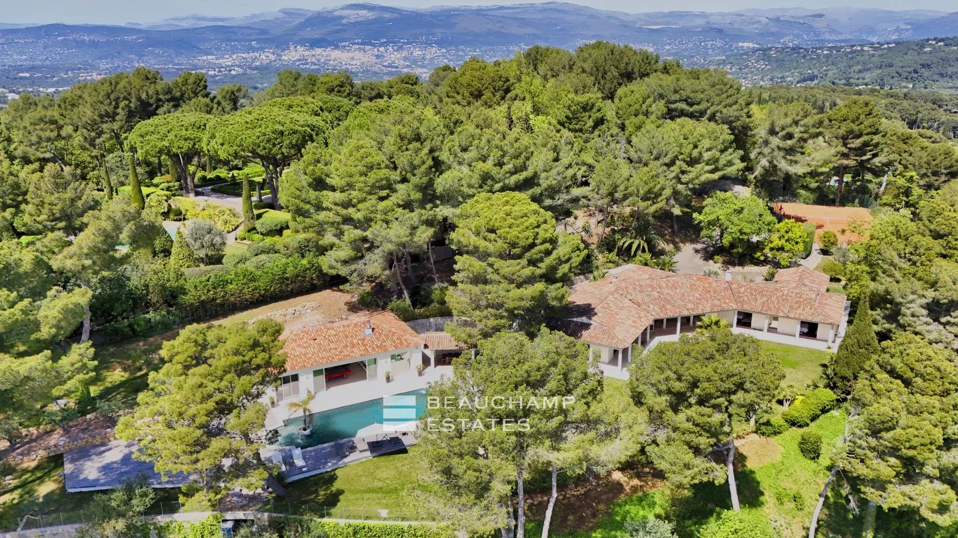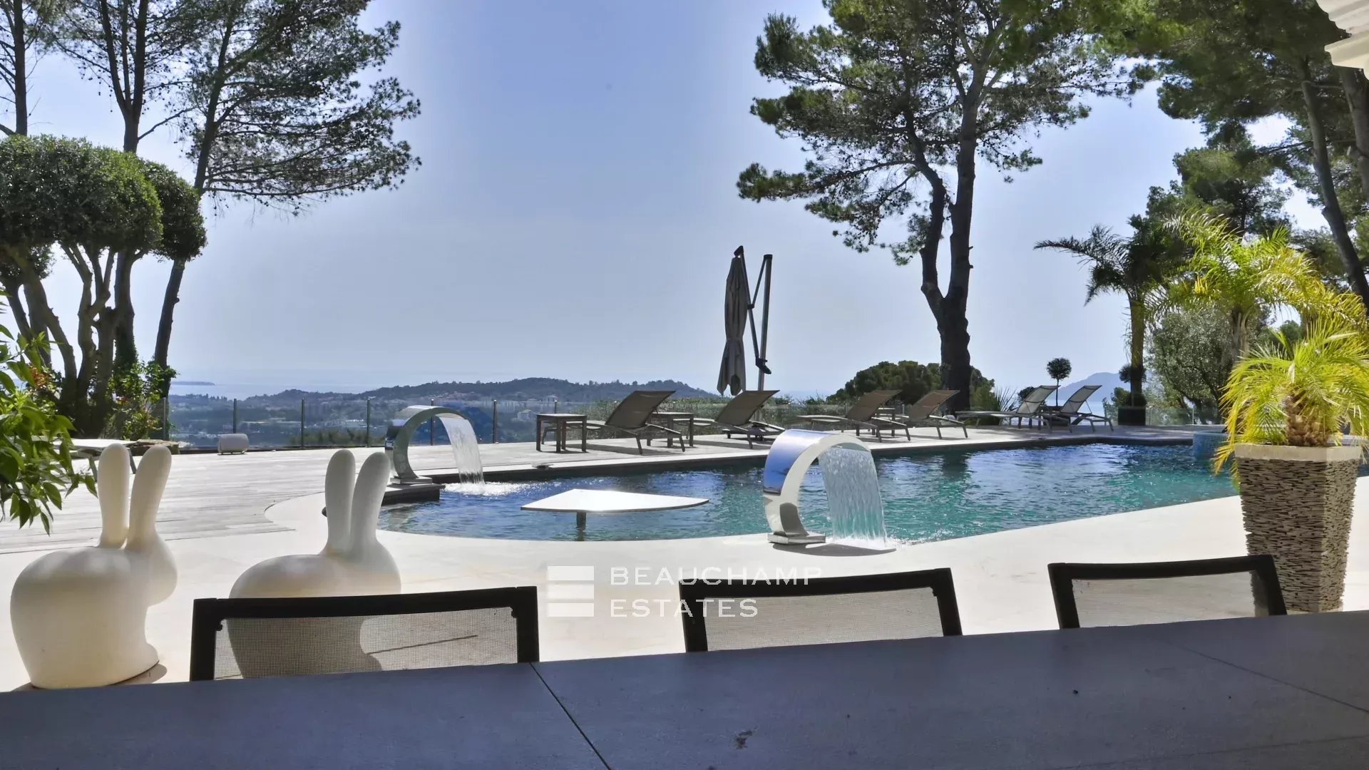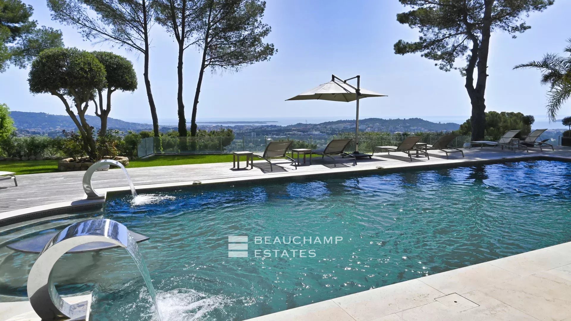 Situé au sein d'un des quartiers résidentiels les plus réputées de Mougins, cette somptueuse propriété entièrement rénovée et dominant la baie de Cannes, bénéficie d’une magnifique vue sur la mer, les collines et le village de Mougins.