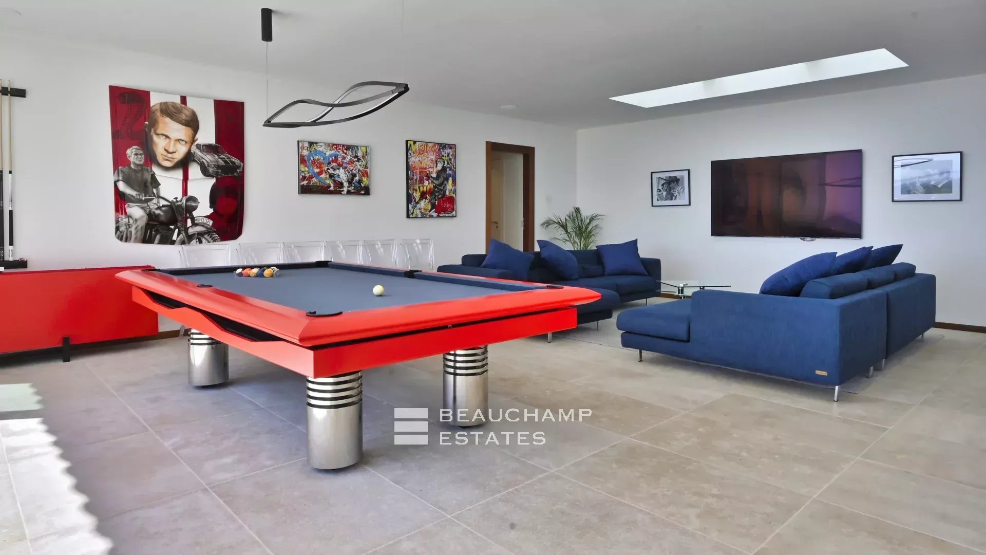 - Un magnifique séjour avec cheminée, télévision et billard donnant accès à la piscine.