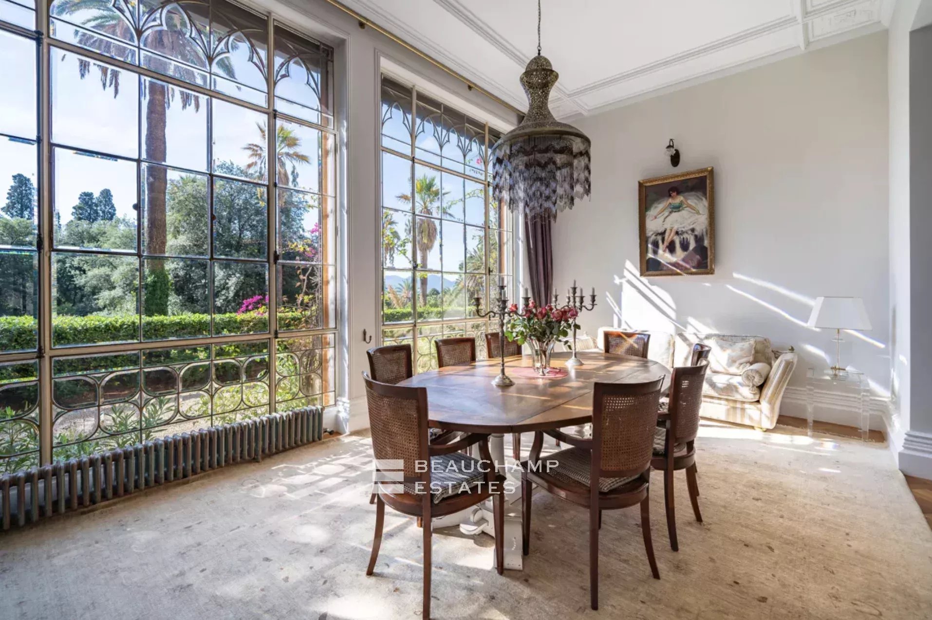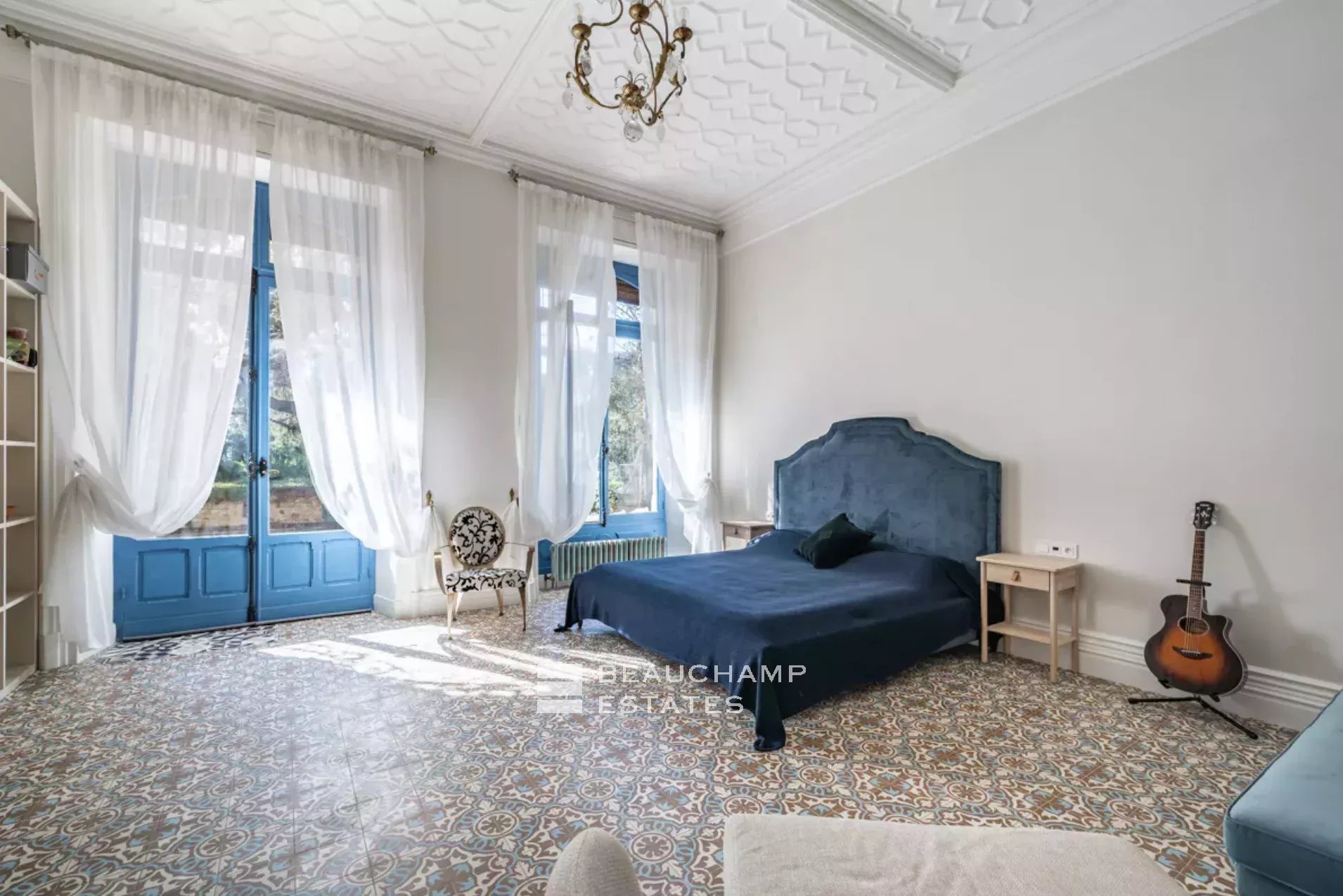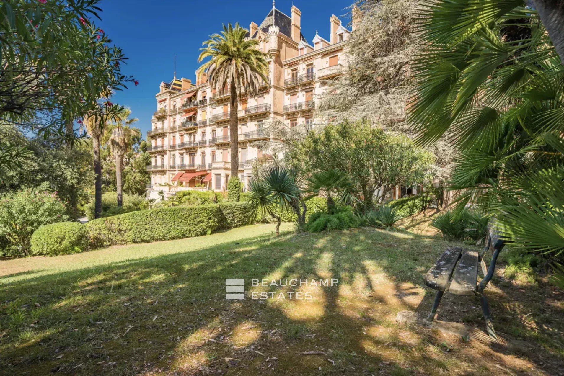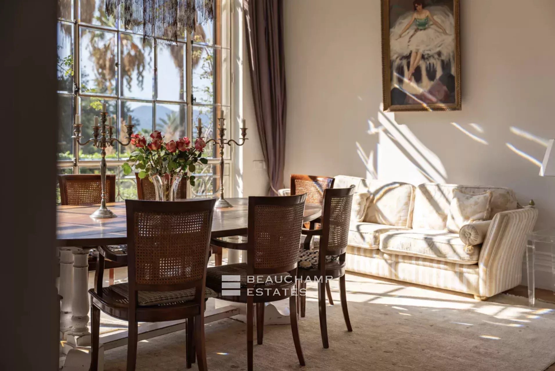 Il offre de grandes chambres et de hauts plafonds typiques des appartements de cette période. Il comprend un hall d’entrée ouvrant sur un vaste double séjour avec une petite vue mer et un coin cuisine/salle à manger, un long couloir avec boiseries d’époque menant aux quatre chambres dont deux ont leur propre salle de bain, un grand espace de rangement et une buanderie.