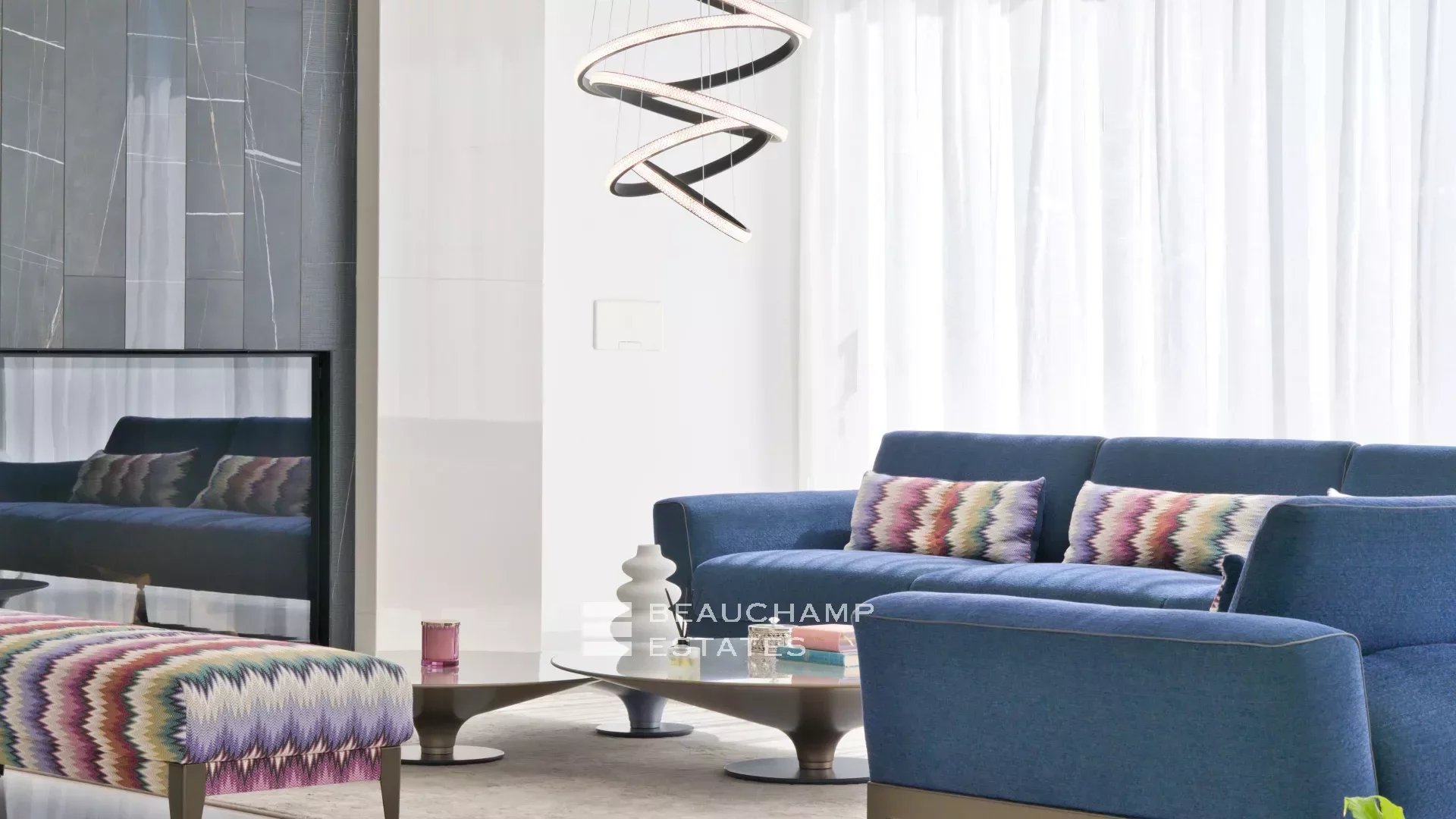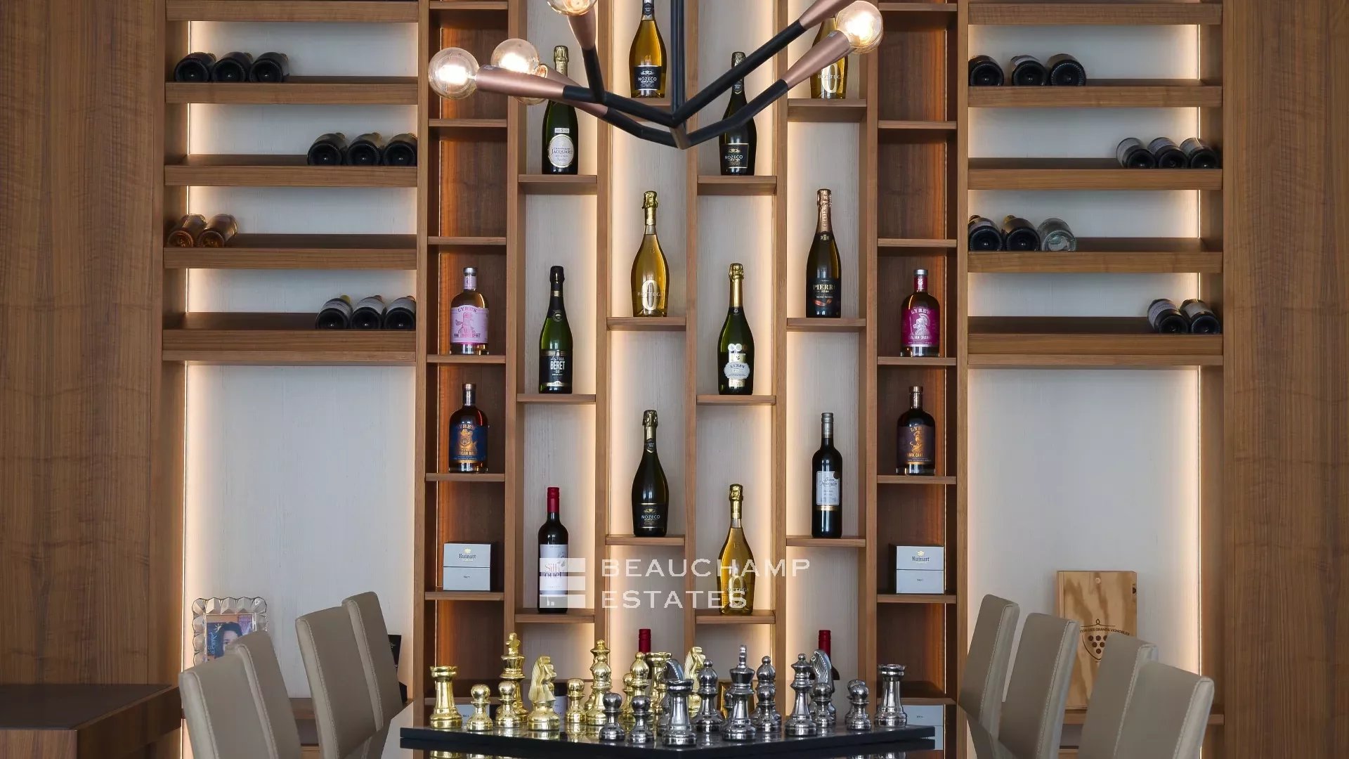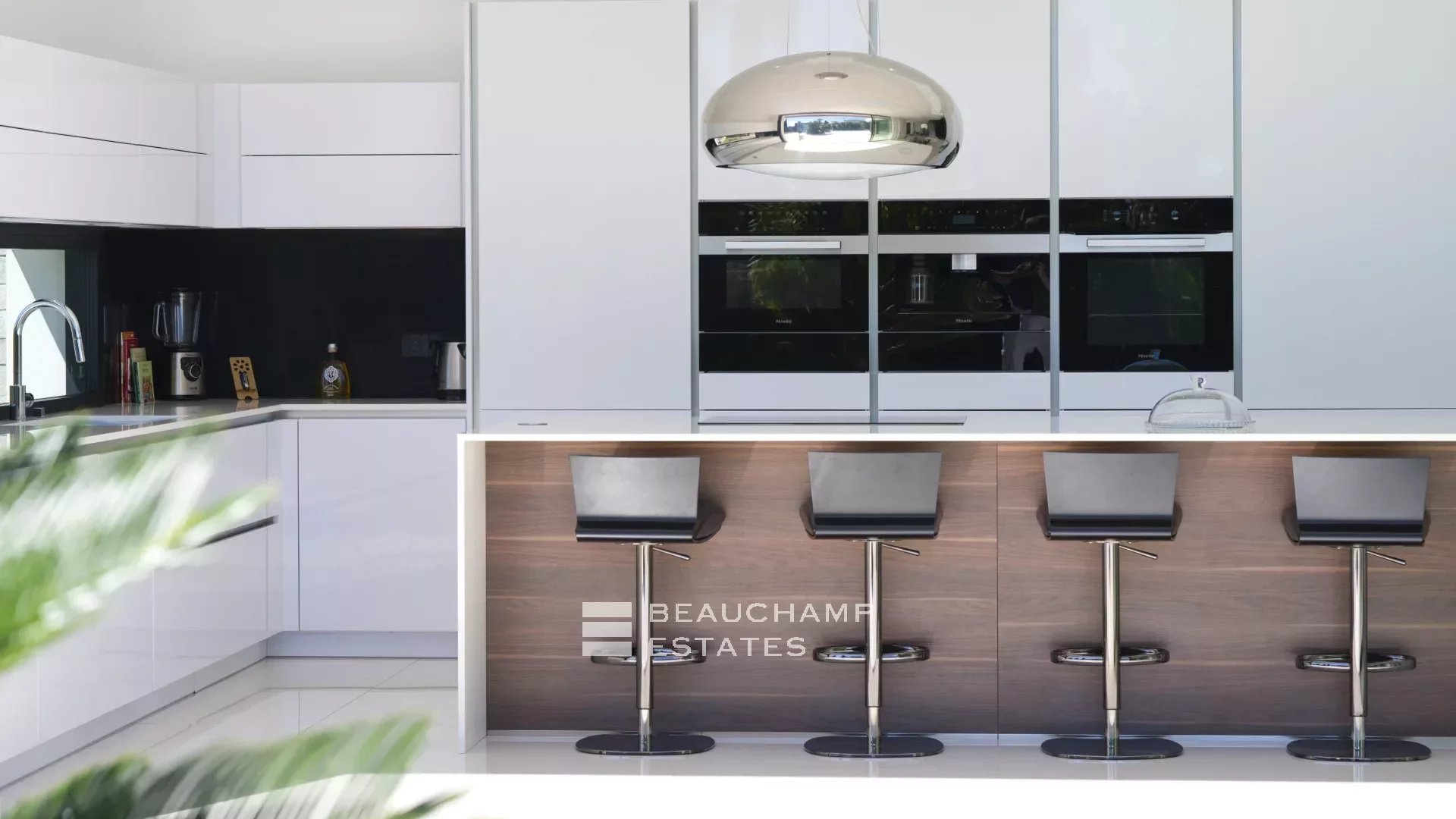 La villa se compose d’un hall d'entrée cathédral qui donne sur un grand salon, une salle TV et d'une cuisine entièrement équipée, le tout s'ouvrant sur un jardin paysager agrémenté d'une piscine miroir et d'un abri bioclimatique.