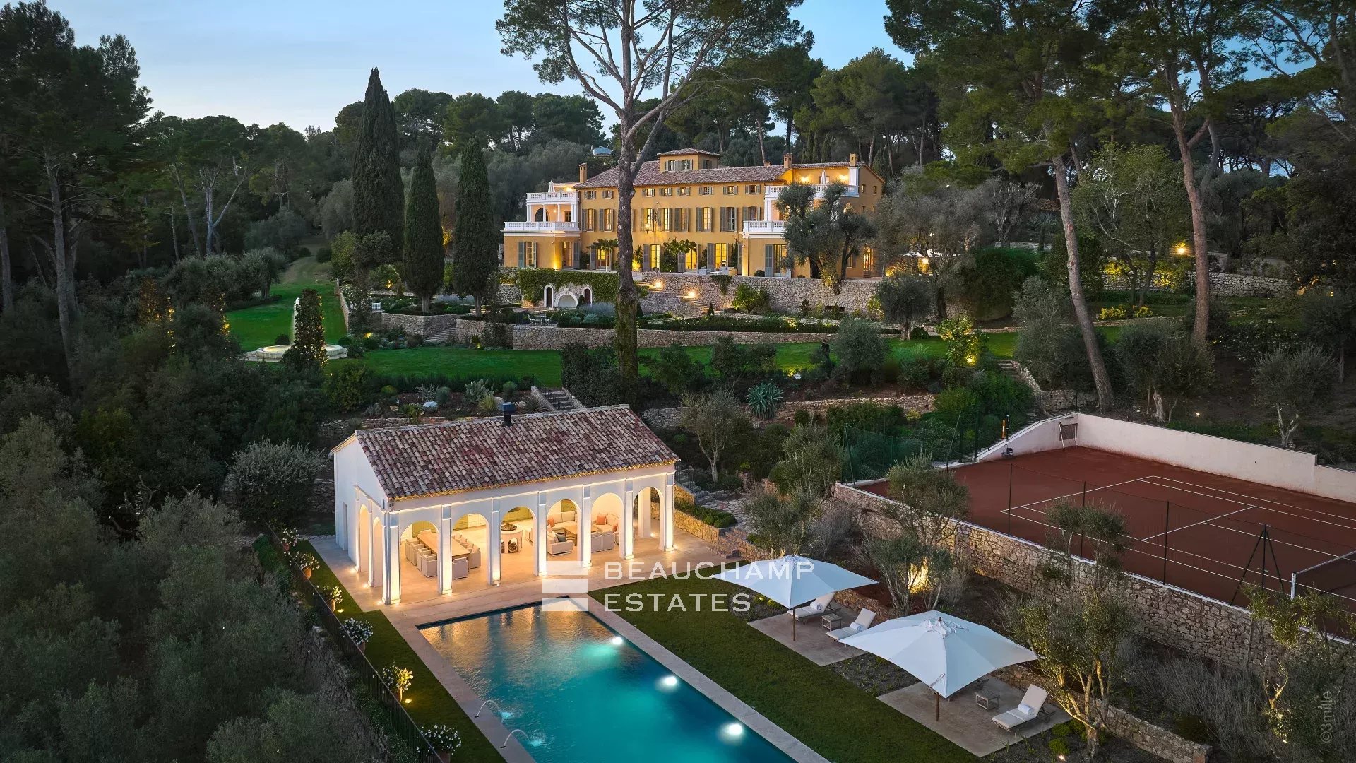 Pour les divertissements de jour, la propriété offre un espace sport / détente inégalé, avec un pool house / salon de jour de 90m2 entièrement équipé, une piscine chauffée de 21x6m, un court de tennis en terre battue de taille tournoi, un terrain de pétanque, une aire d'entraînement au chipping&putting, un practice de golf de 130m et la possibilité d'aménager un parcours de jogging/marche de 5km dans la propriété.