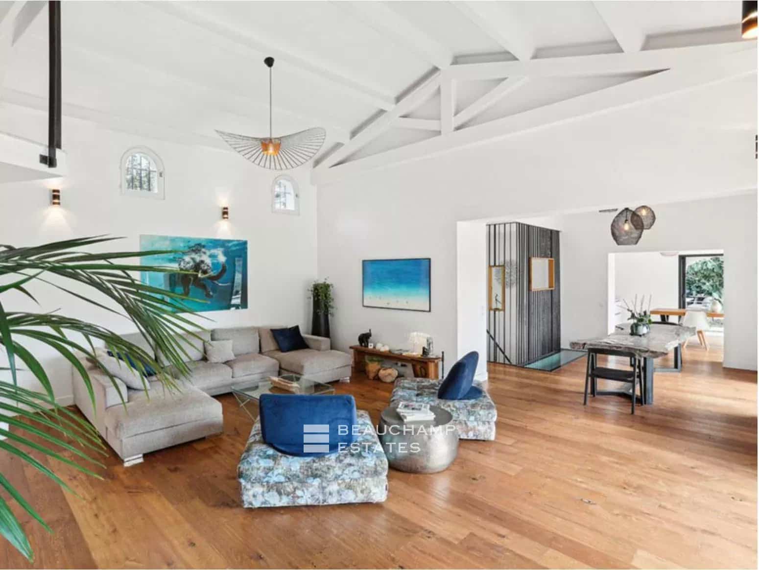 et piscine, un vaste salon-salle à manger avec plafond