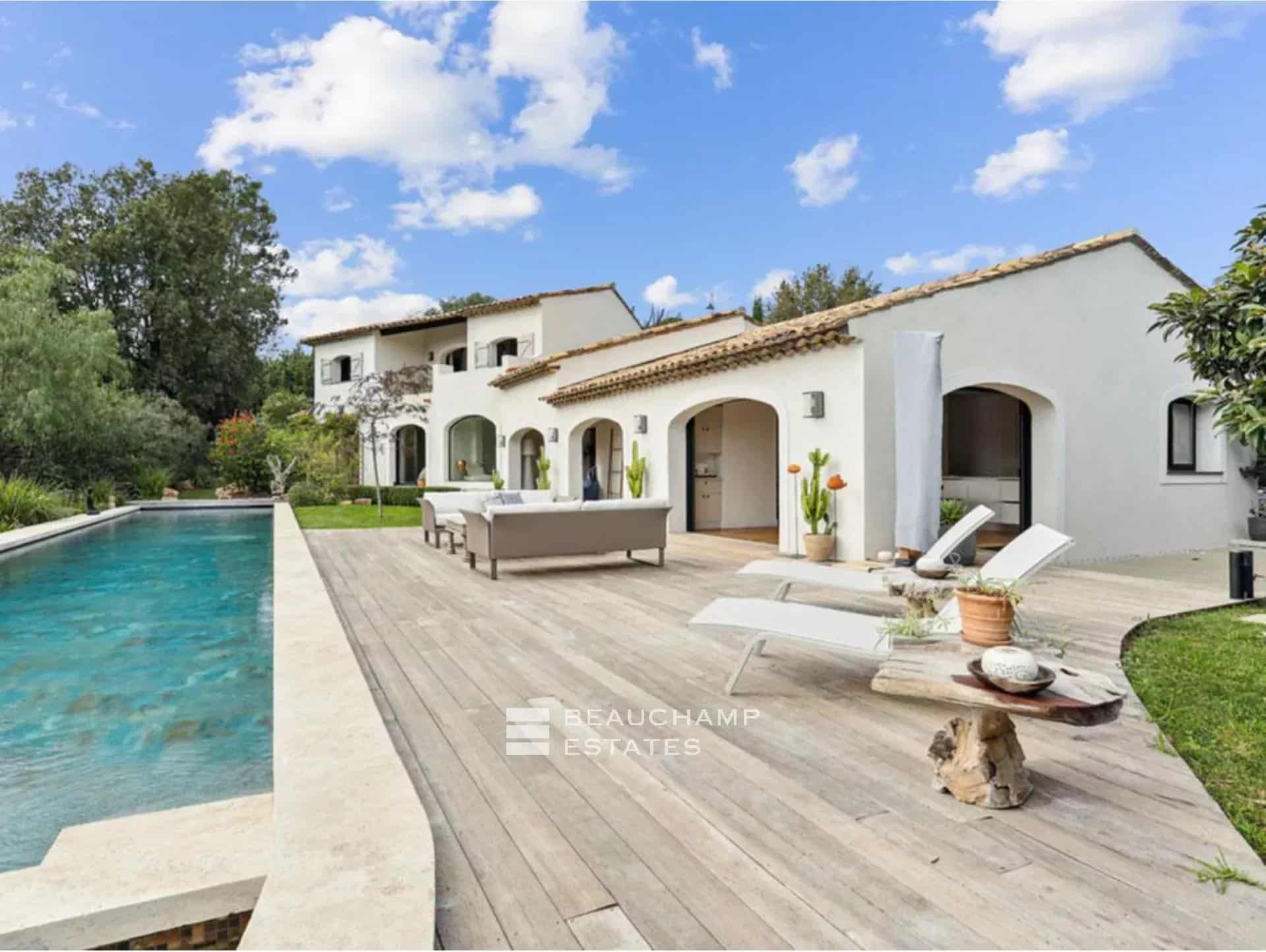 teck, l'espace piscine et le jardin.
