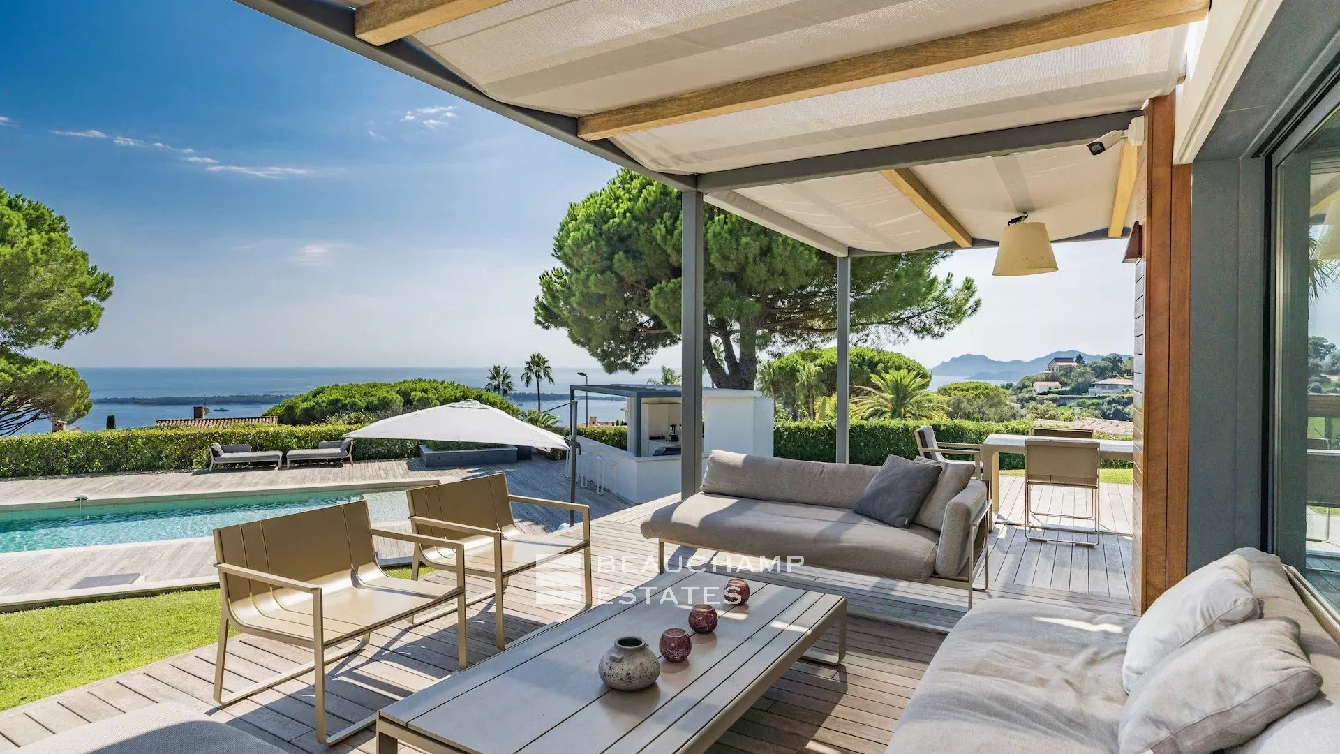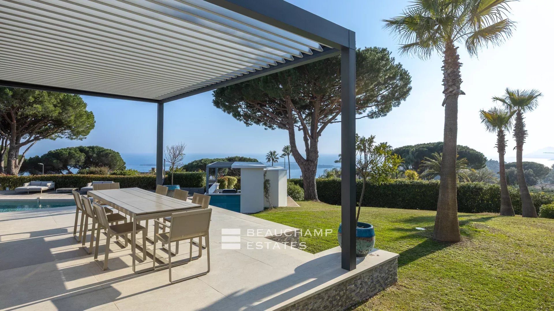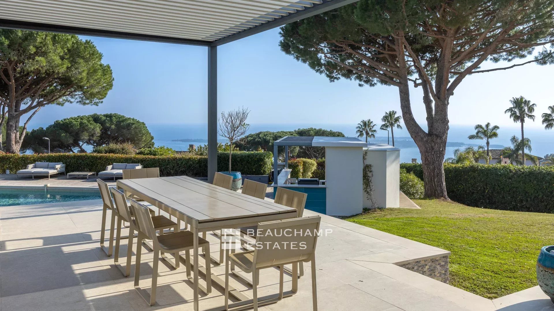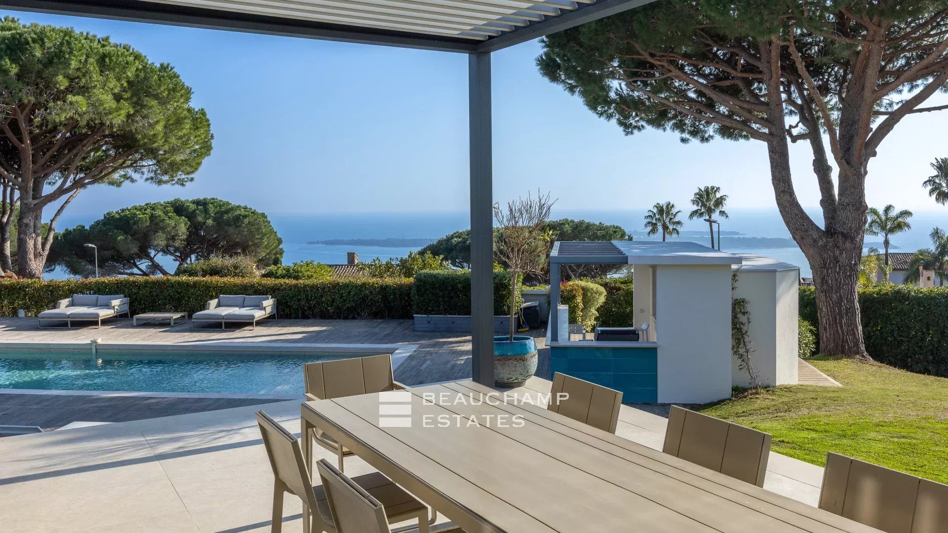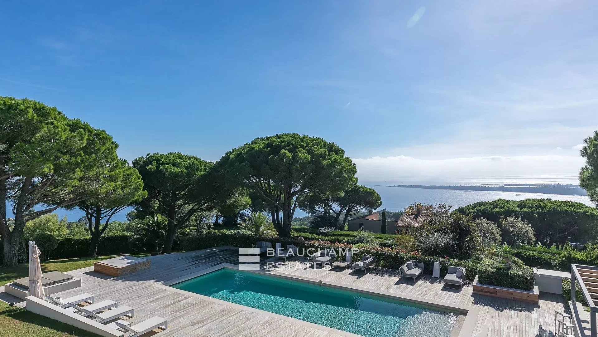 La propriété dispose d'un grand jardin assez plat autour de la piscine avec vue sur les îles de Lérins. L'espace piscine offre un bar d’extérieur entièrement équipé et la piscine au chlore peut être chauffée sur demande.
