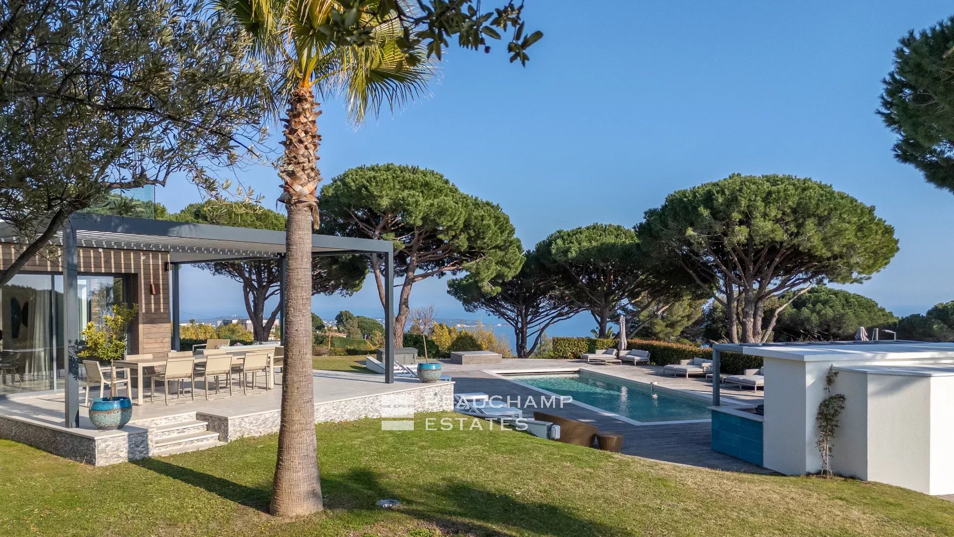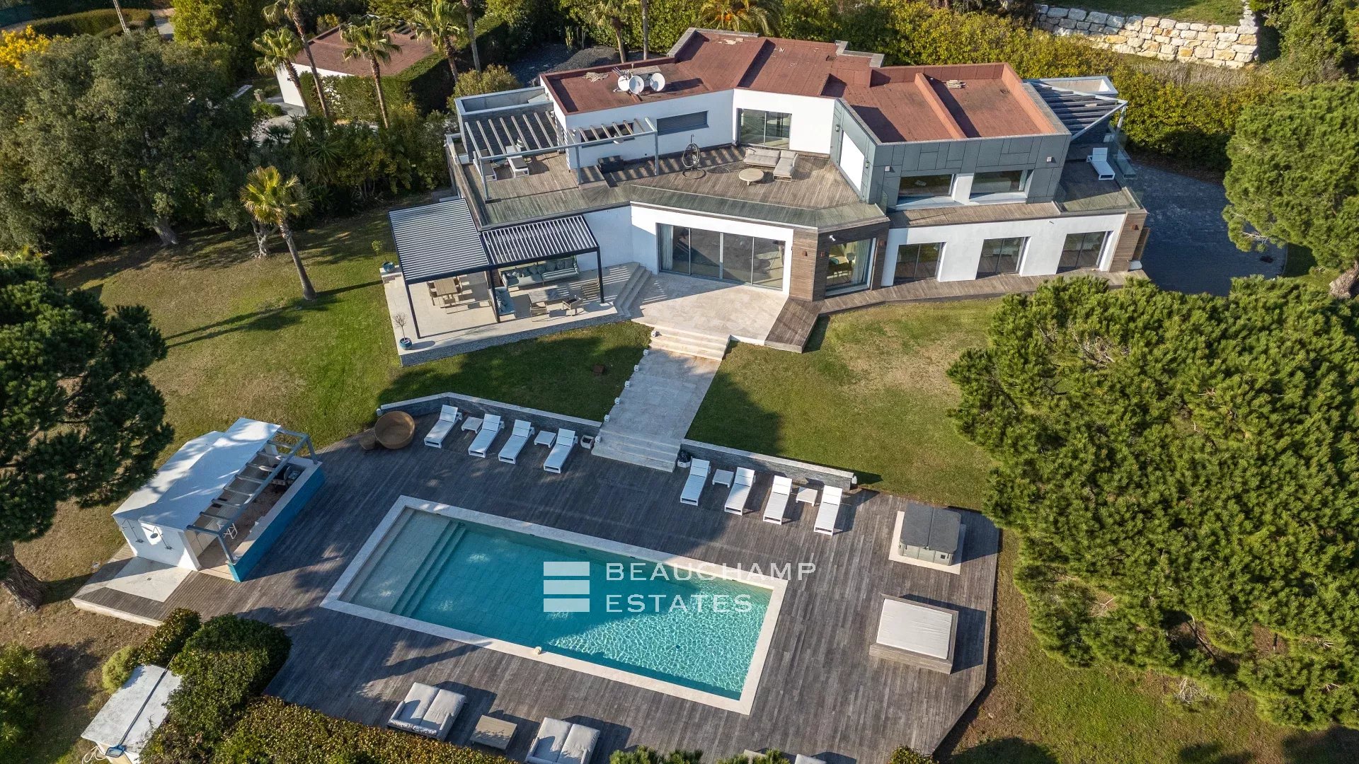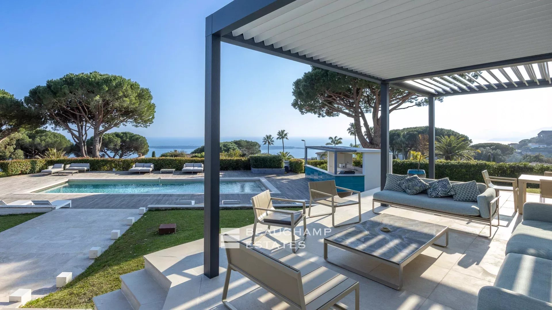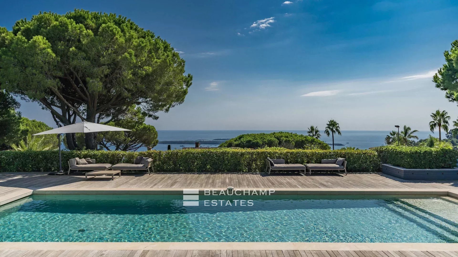 La propriété dispose d'un grand jardin assez plat autour de la piscine avec vue sur les îles de Lérins. L'espace piscine offre un bar d’extérieur entièrement équipé et la piscine au chlore peut être chauffée sur demande.