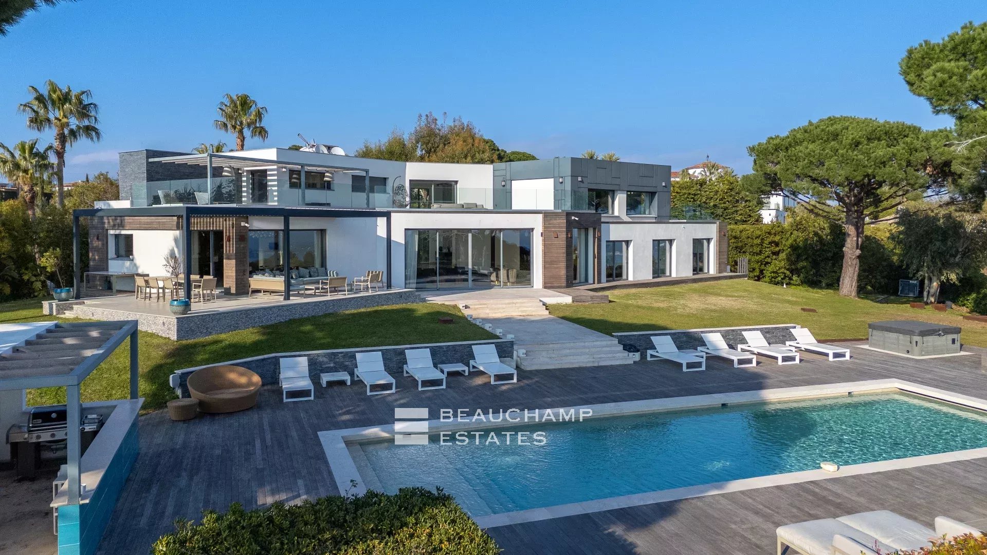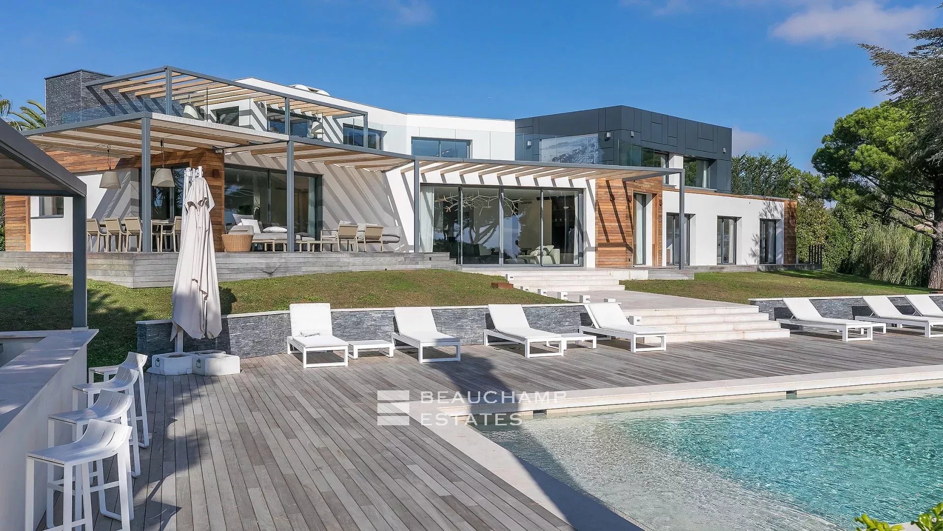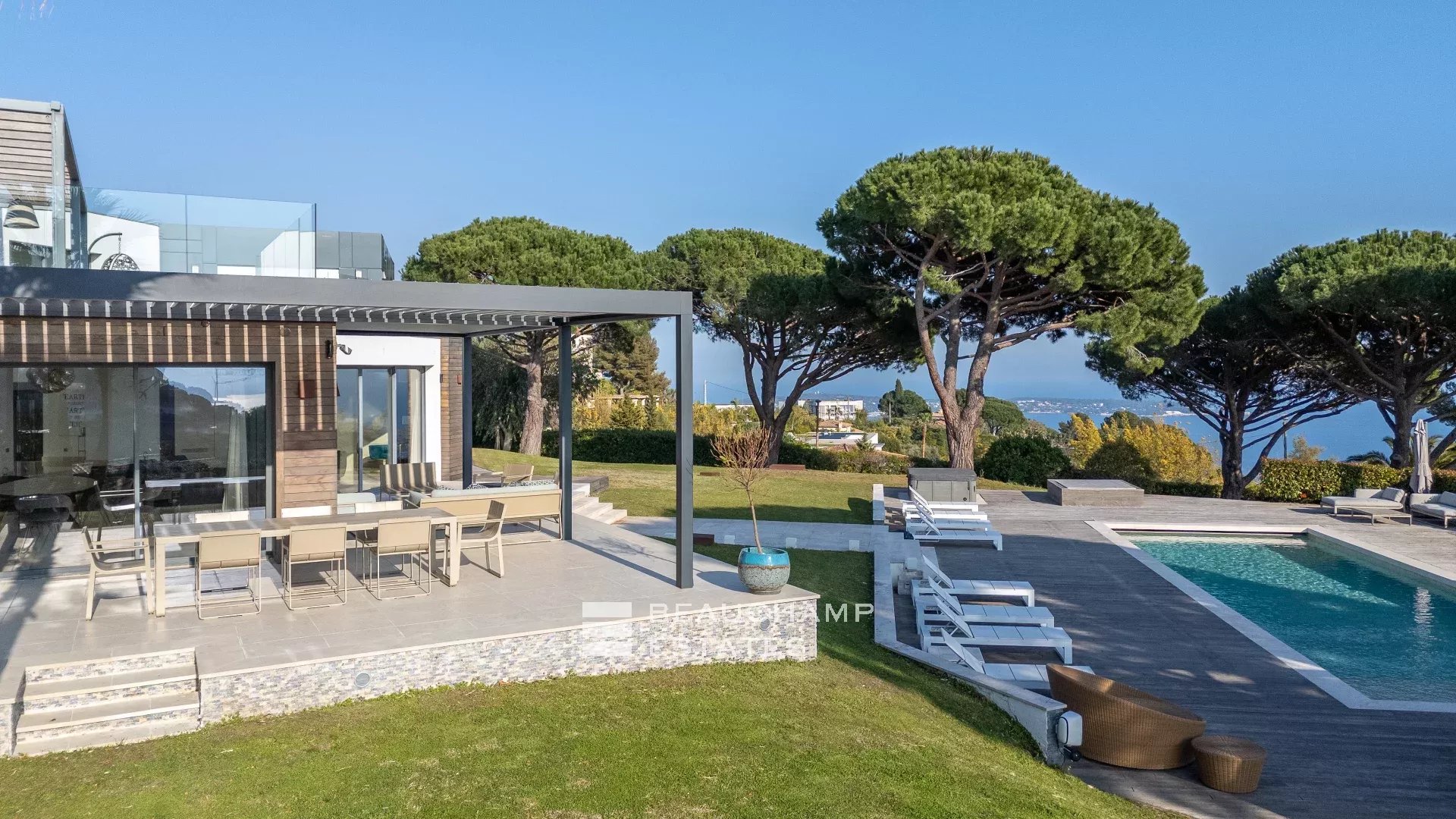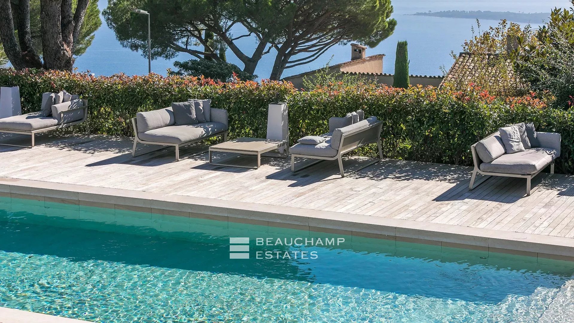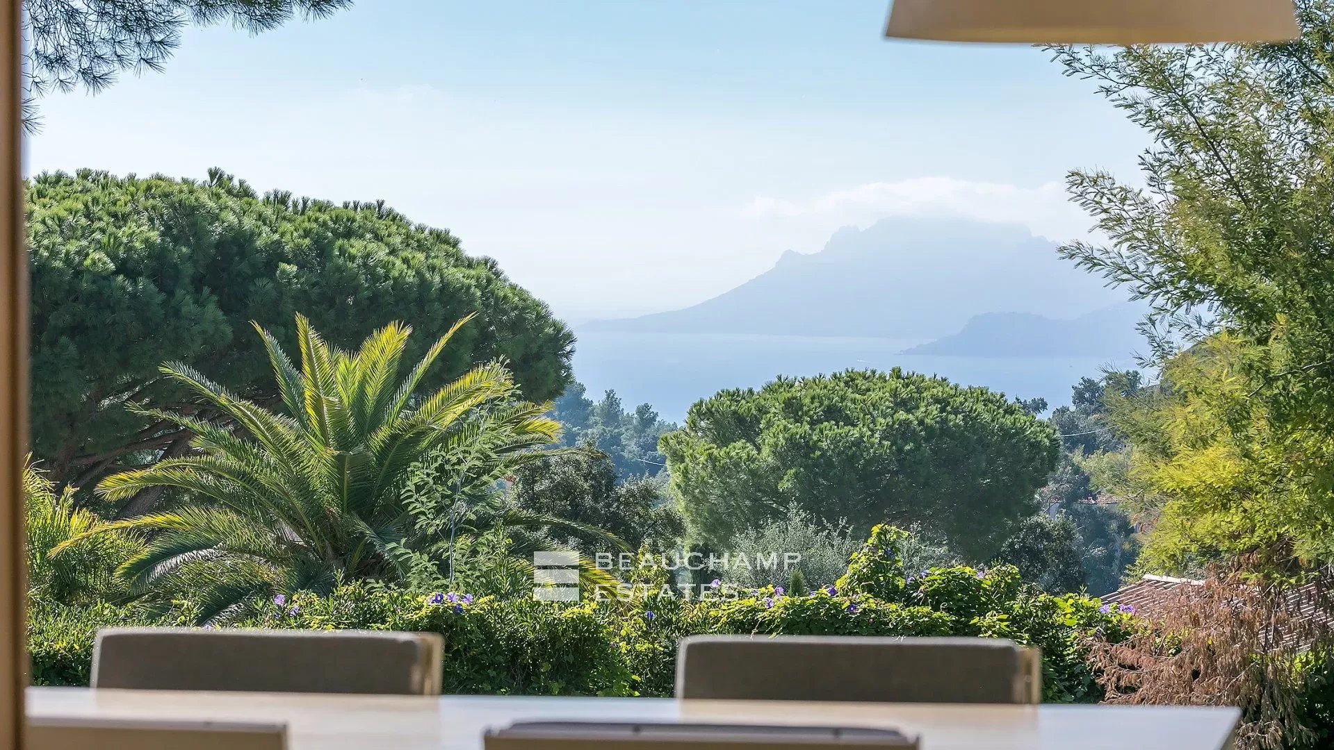 La propriété dispose d'un grand jardin assez plat autour de la piscine avec vue sur les îles de Lérins. L'espace piscine offre un bar d’extérieur entièrement équipé et la piscine au chlore peut être chauffée sur demande.