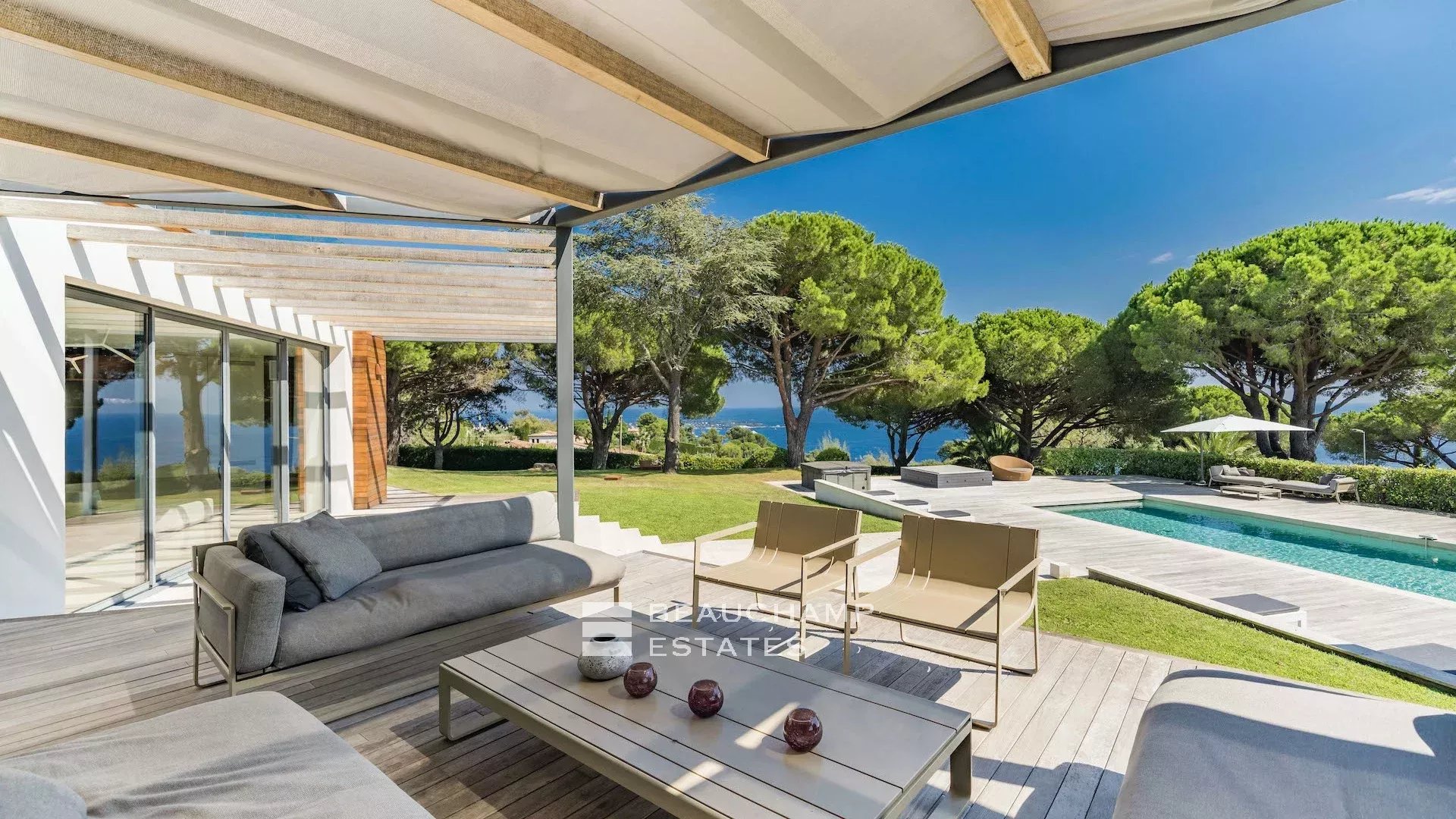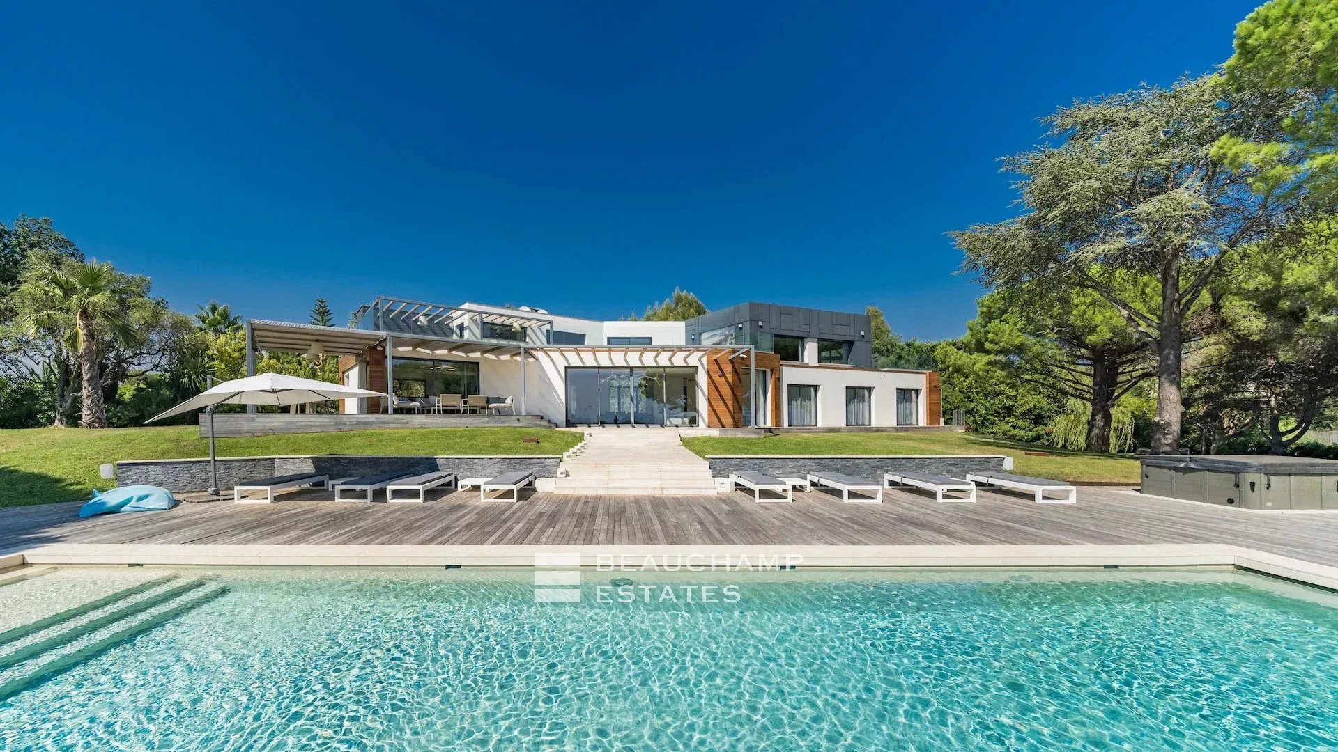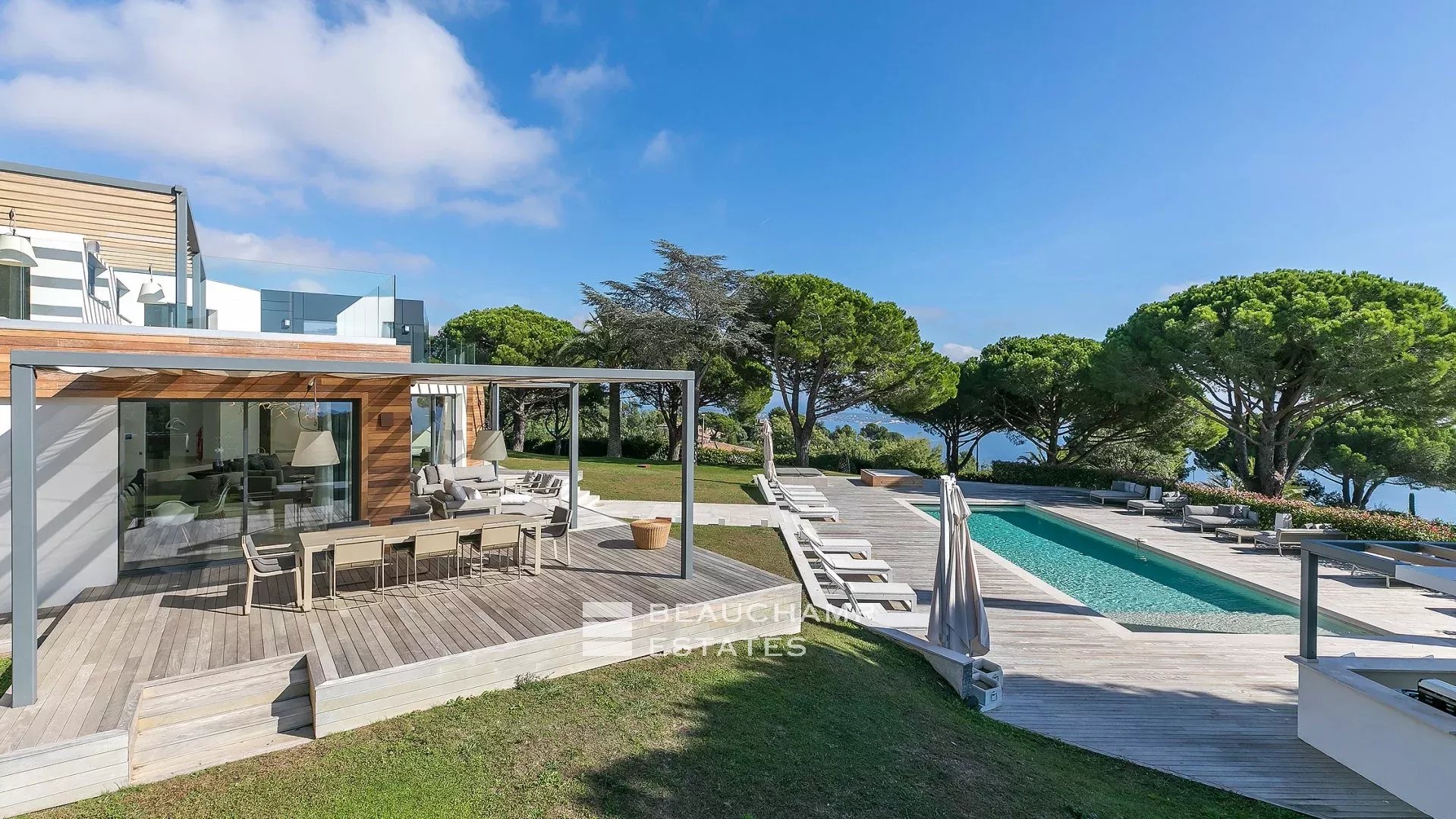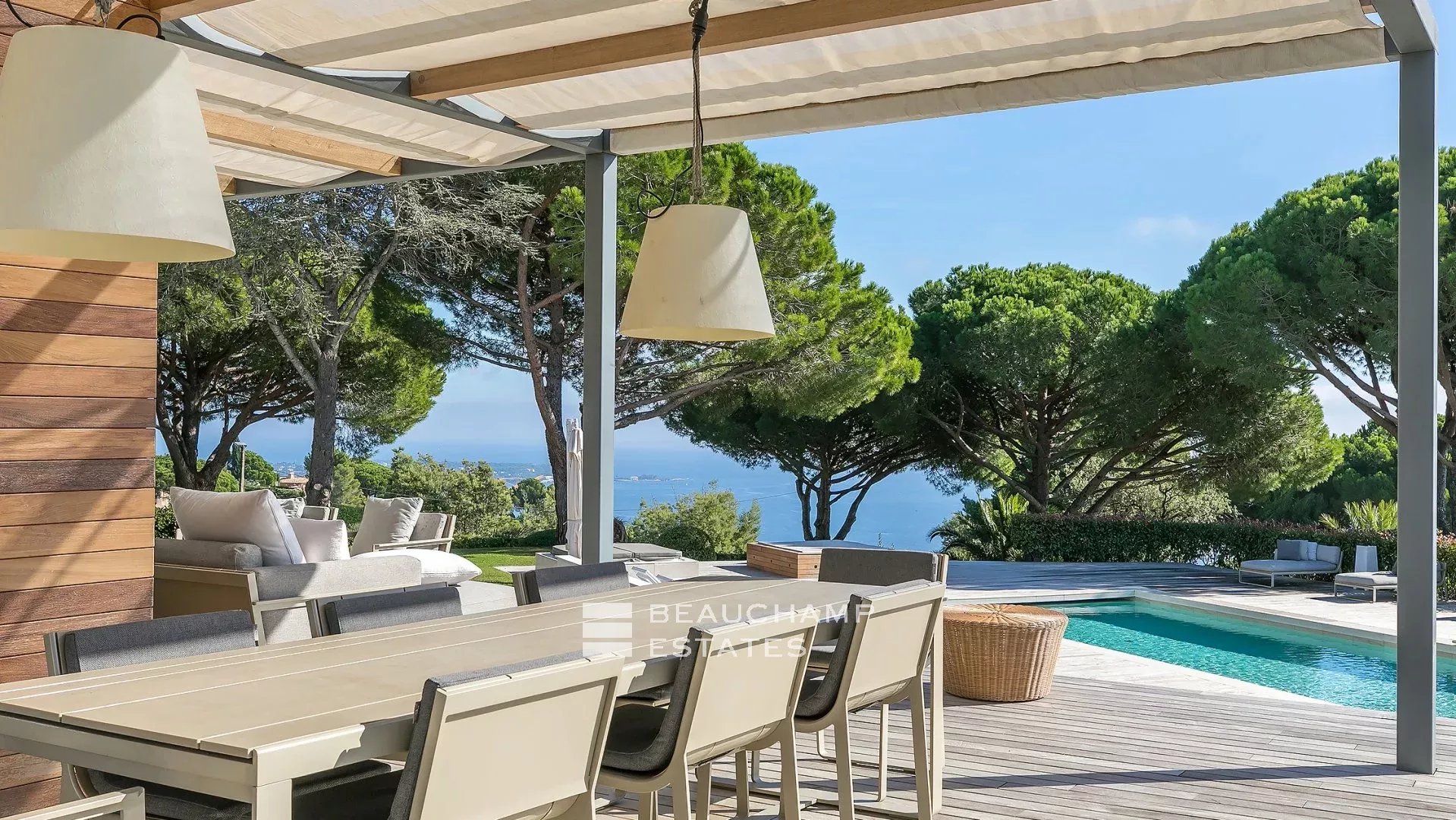 La propriété dispose d'un grand jardin assez plat autour de la piscine avec vue sur les îles de Lérins. L'espace piscine offre un bar d’extérieur entièrement équipé et la piscine au chlore peut être chauffée sur demande.