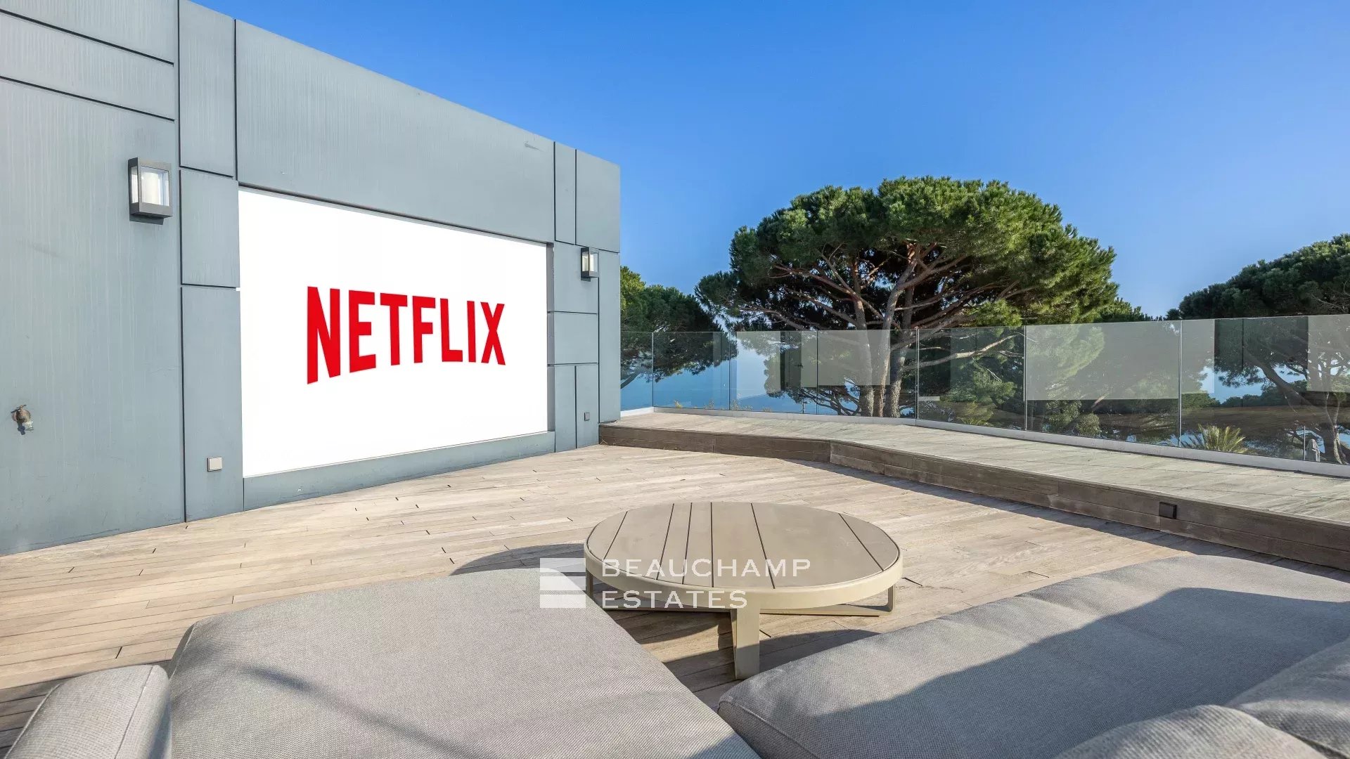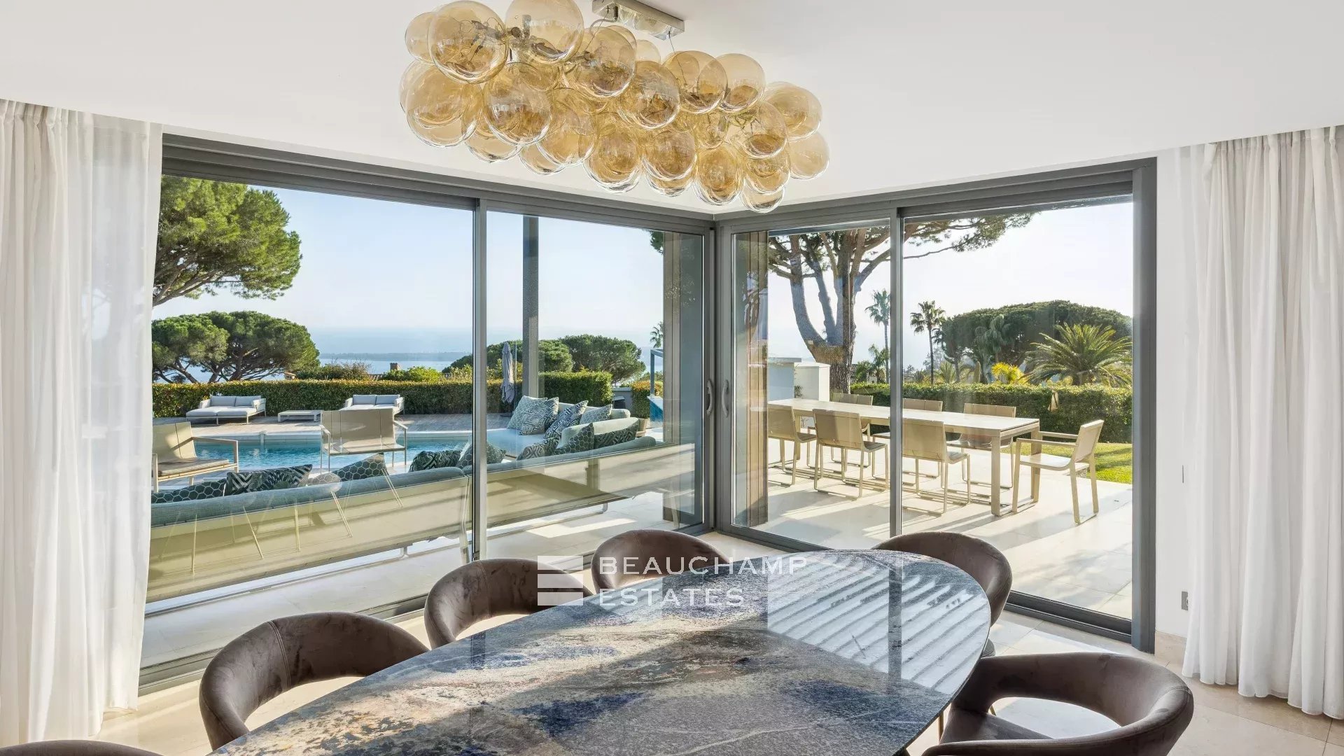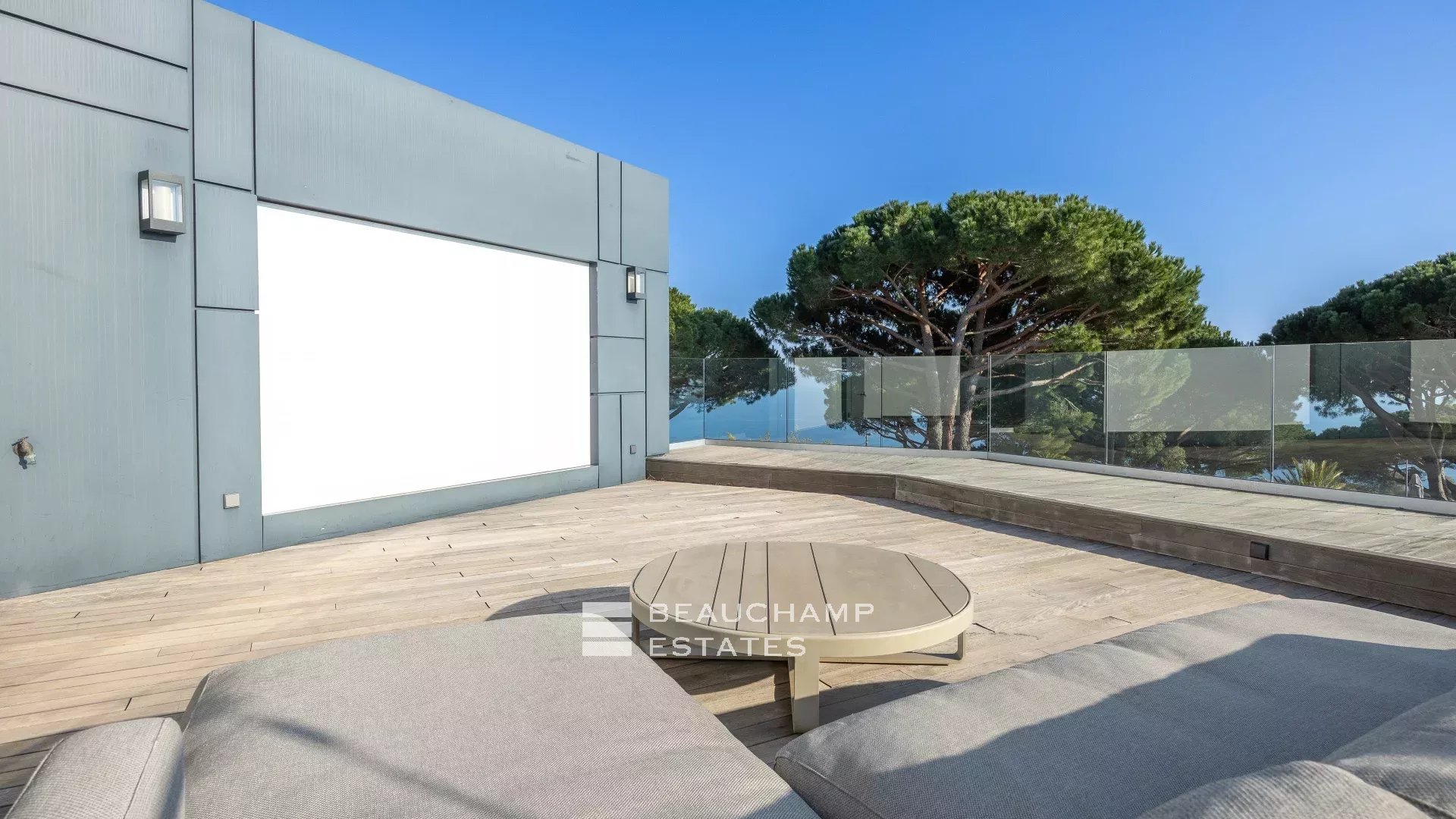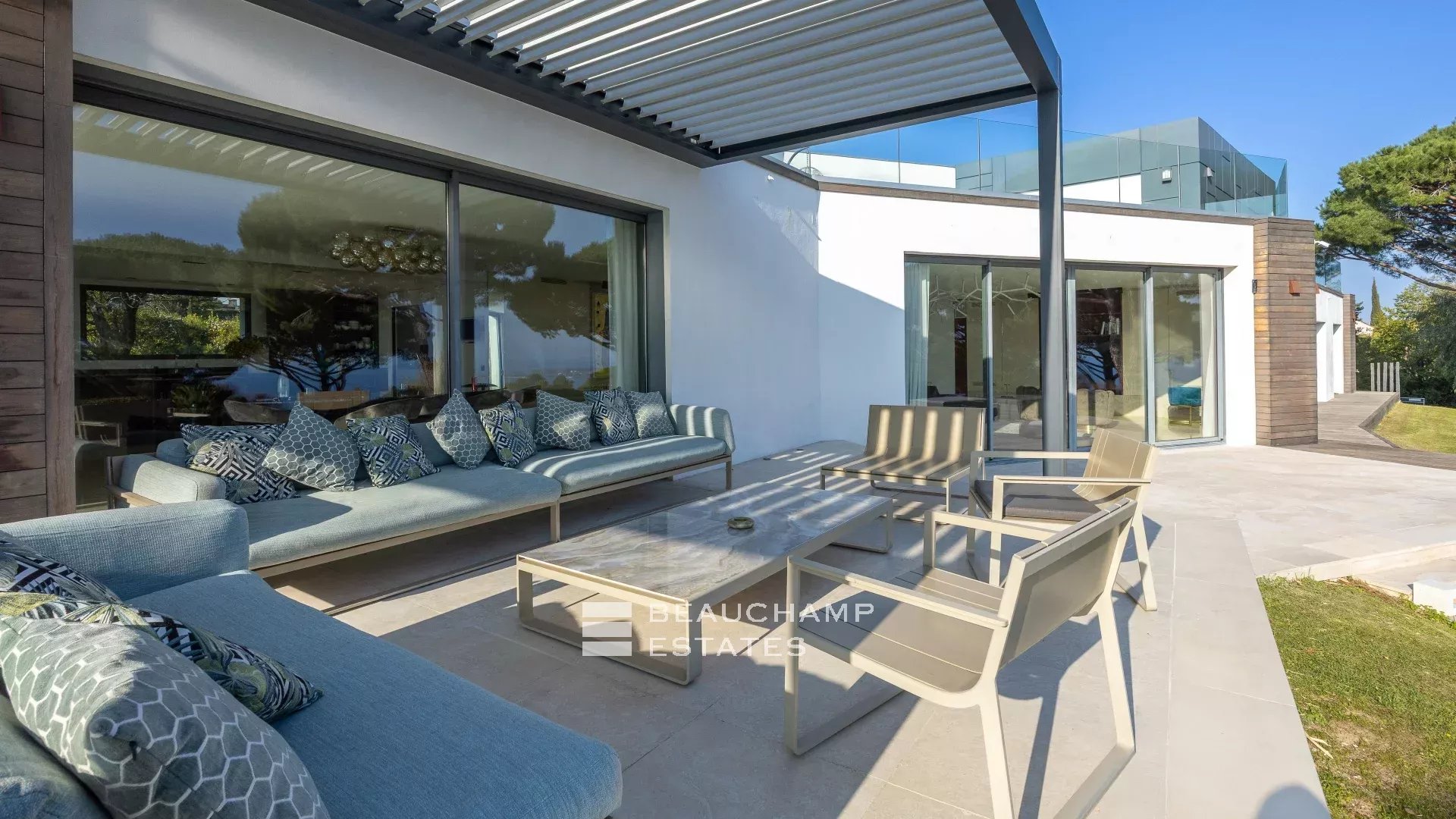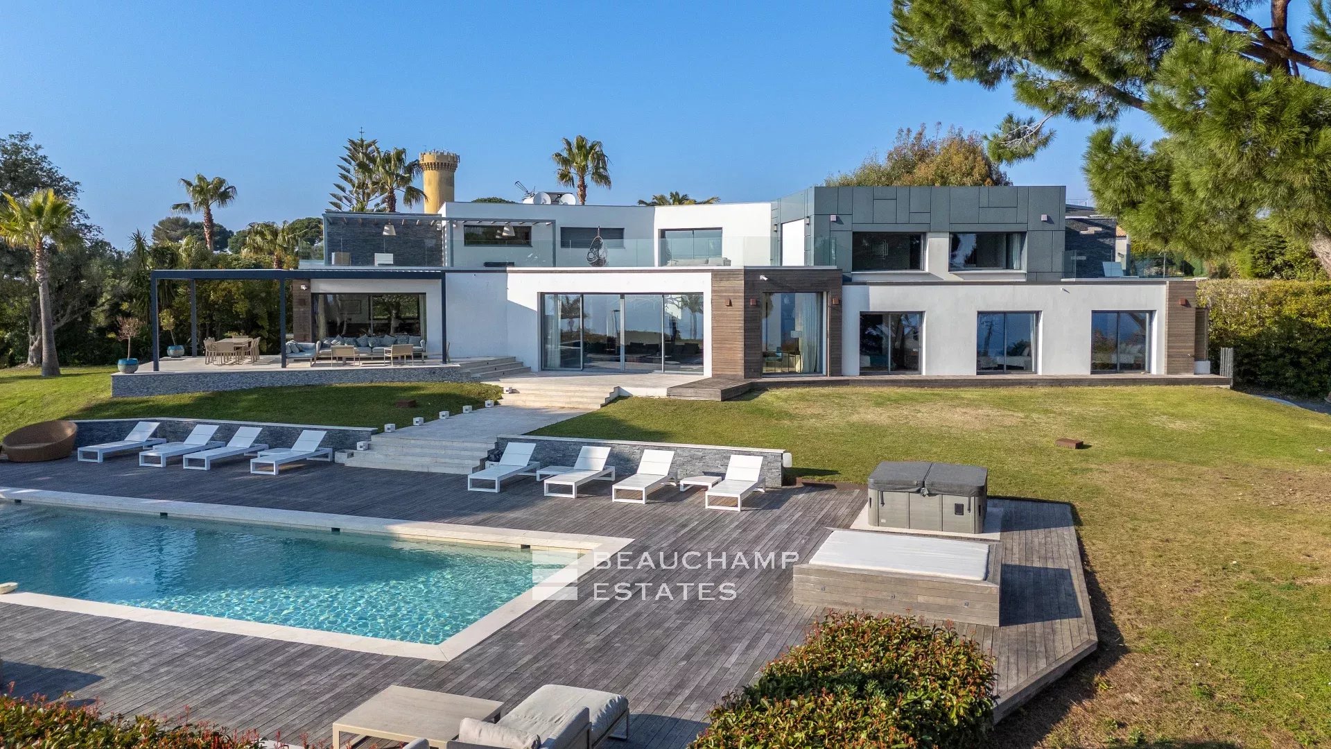 La propriété dispose d'un grand jardin assez plat autour de la piscine avec vue sur les îles de Lérins. L'espace piscine offre un bar d’extérieur entièrement équipé et la piscine au chlore peut être chauffée sur demande.