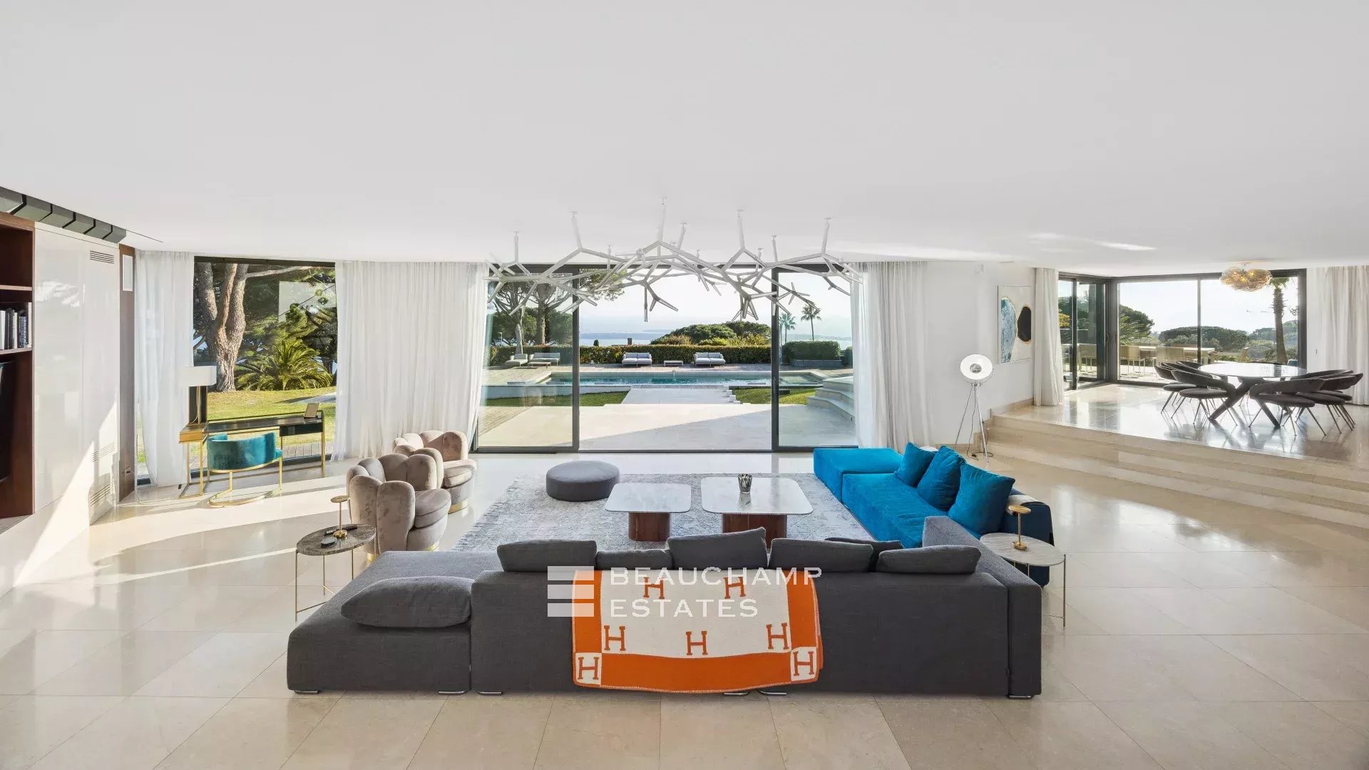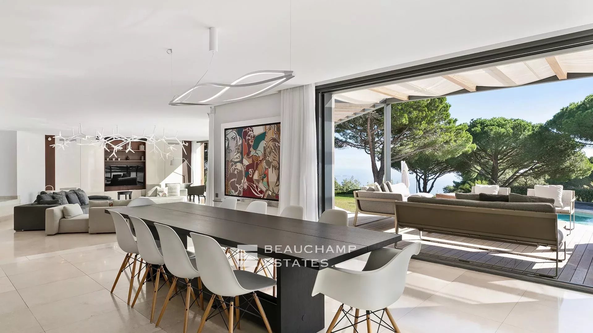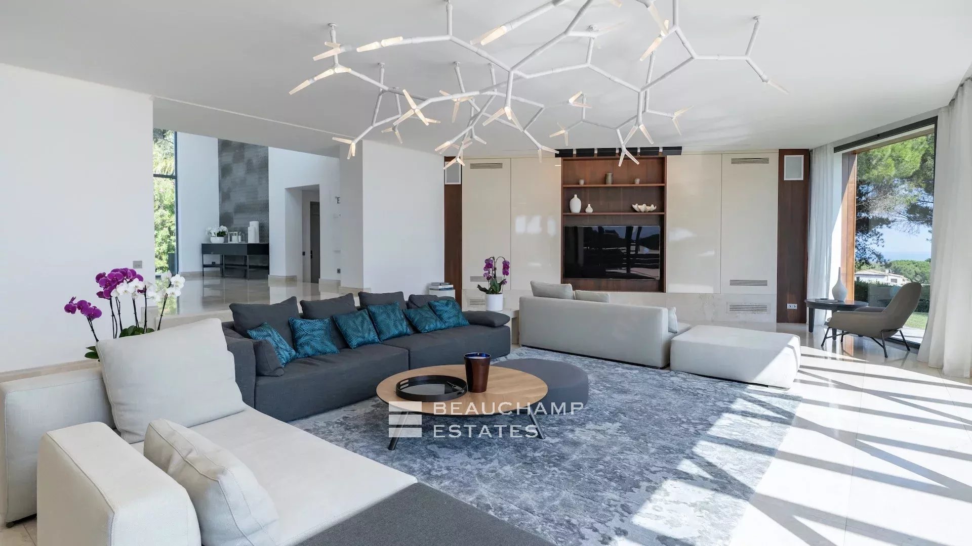 - Séjour avec TV ouvert sur la grande terrasse principale donnant sur la piscine.