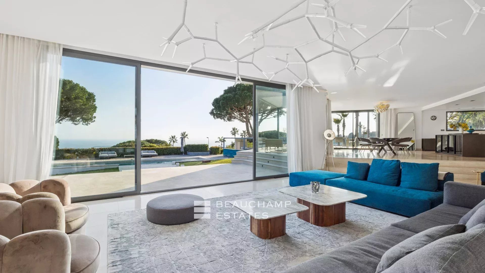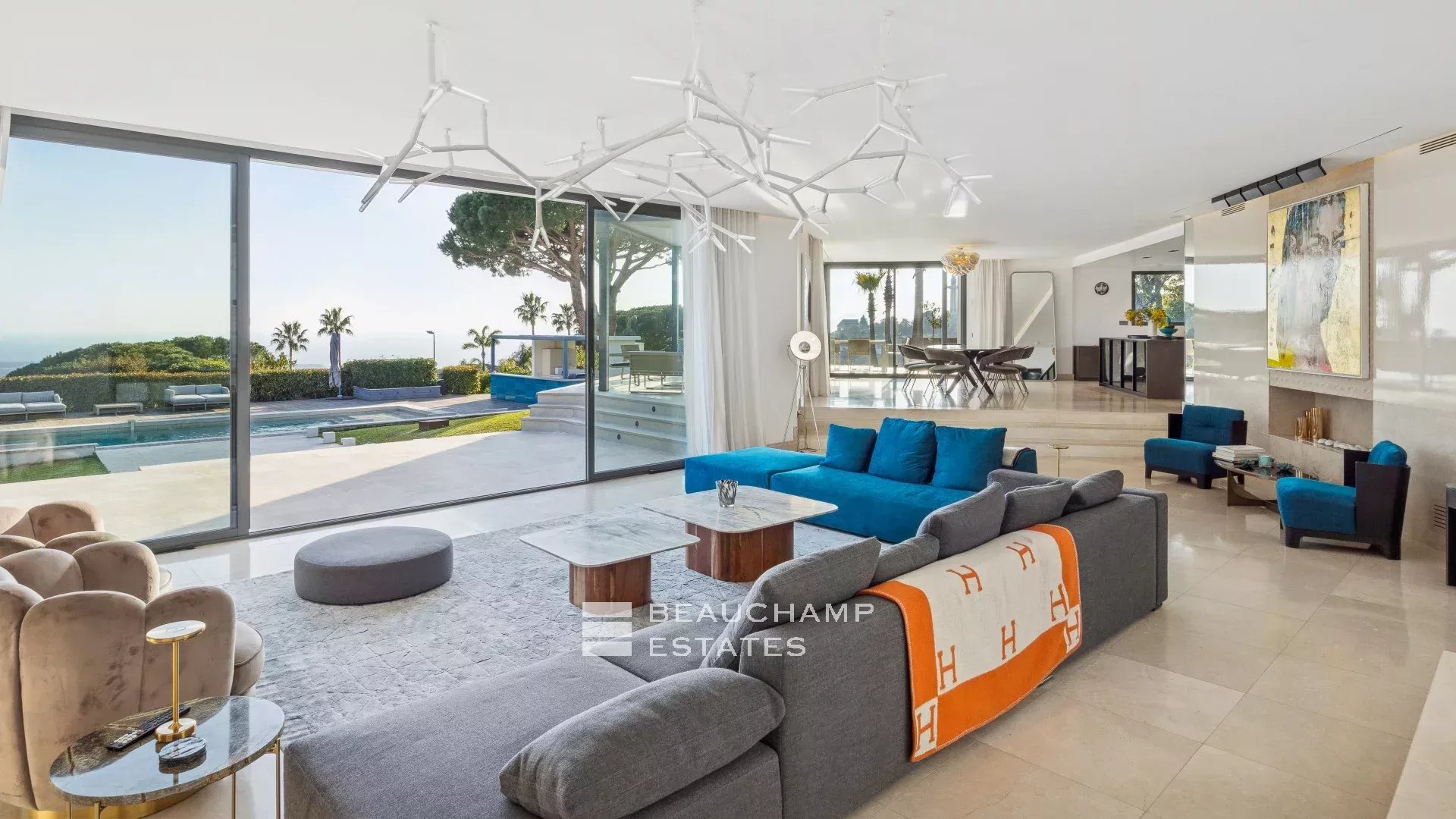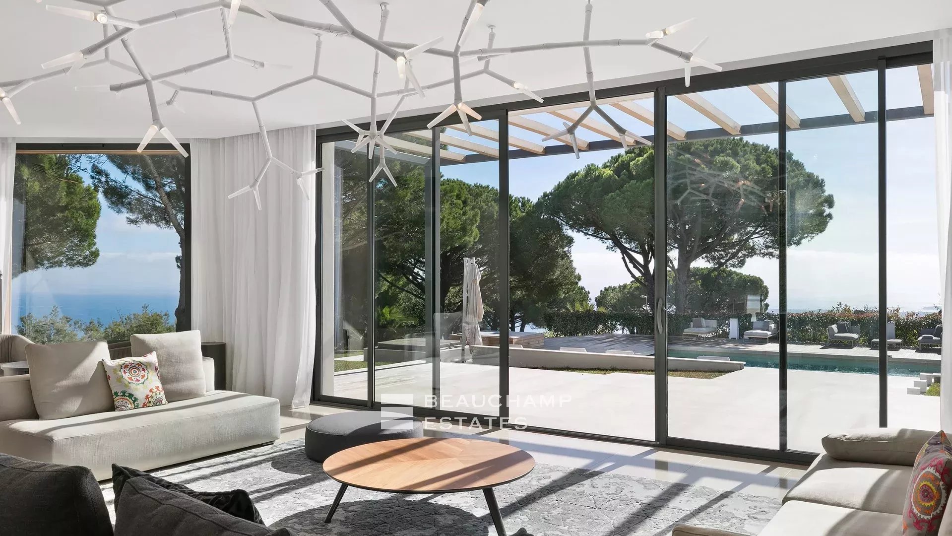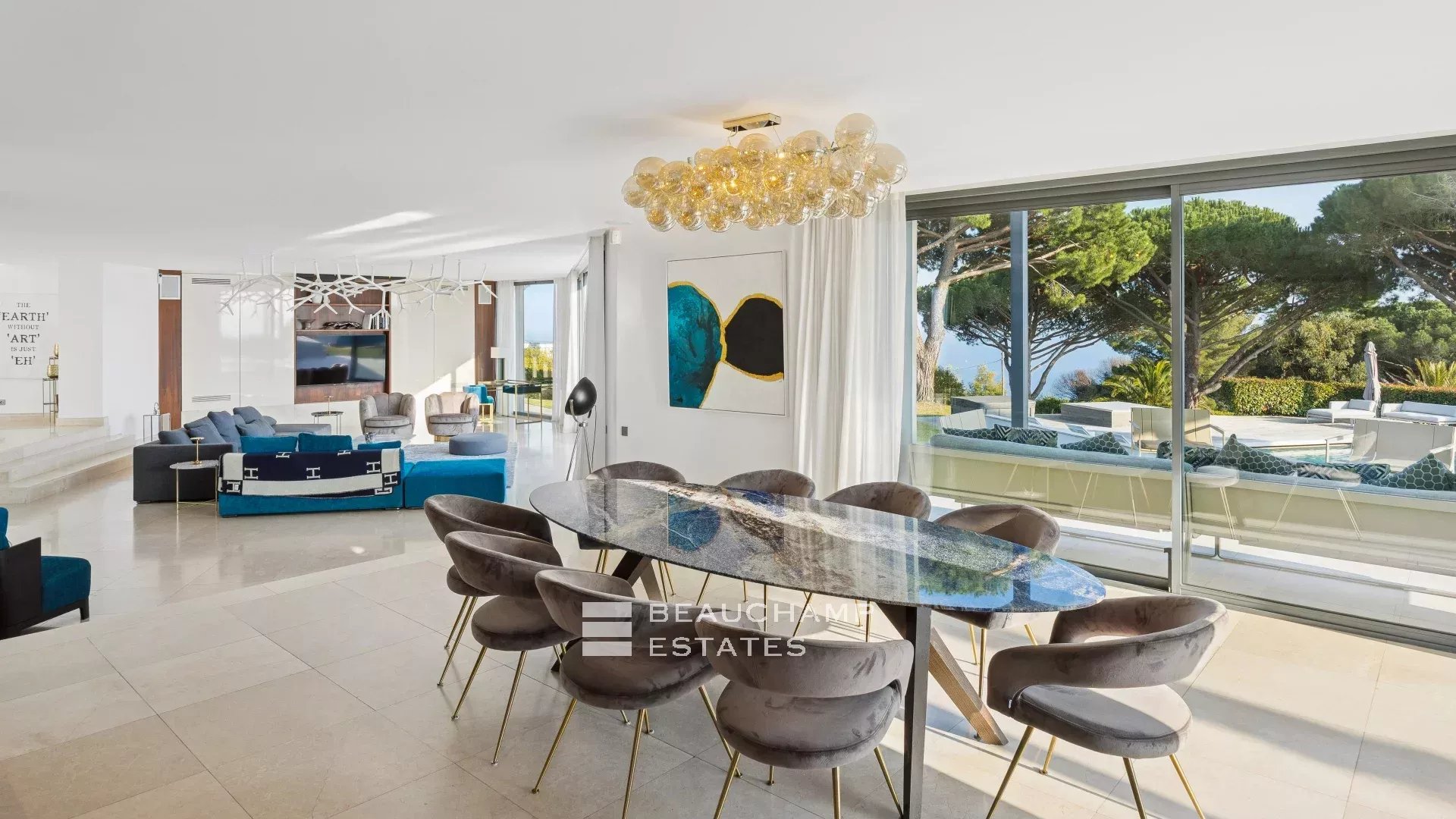 - Séjour avec TV ouvert sur la grande terrasse principale donnant sur la piscine.