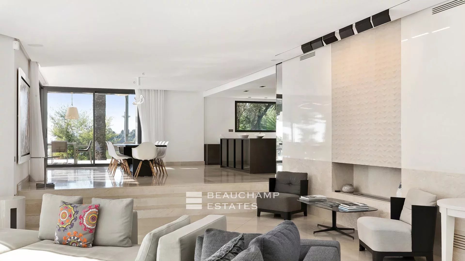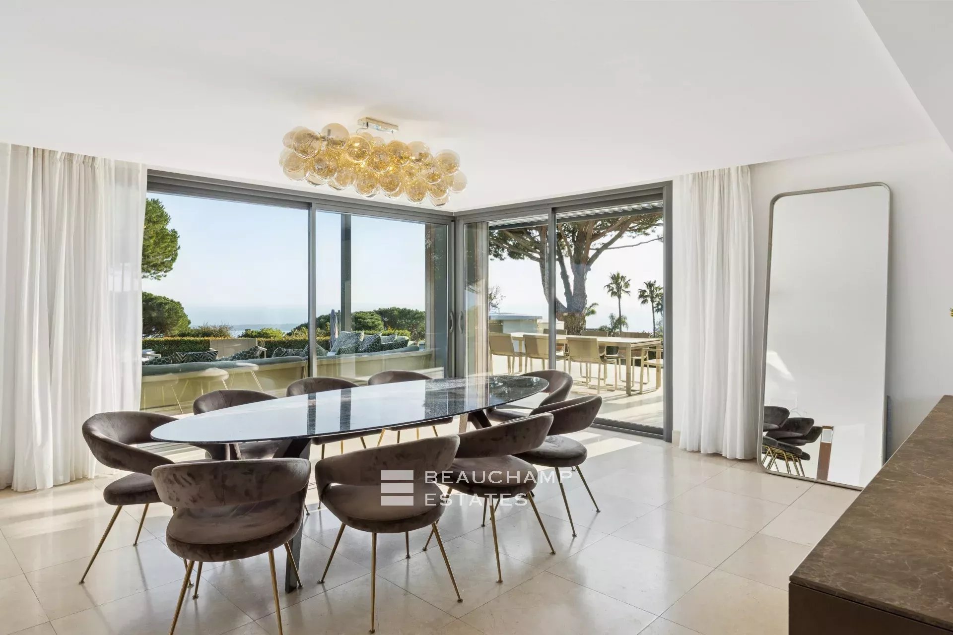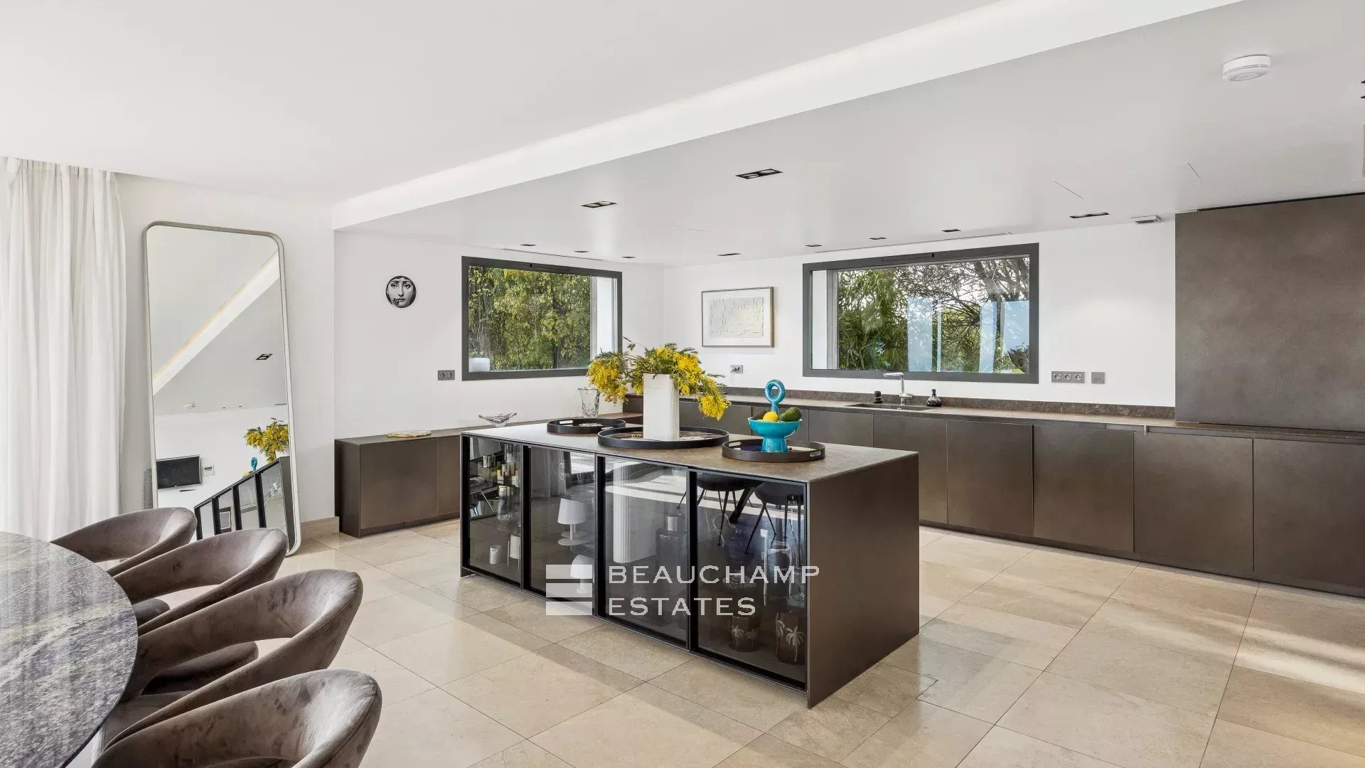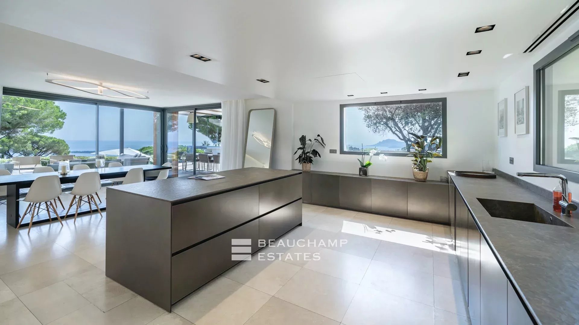 - Cuisine entièrement équipée ouverte sur une salle à manger avec vue mer.