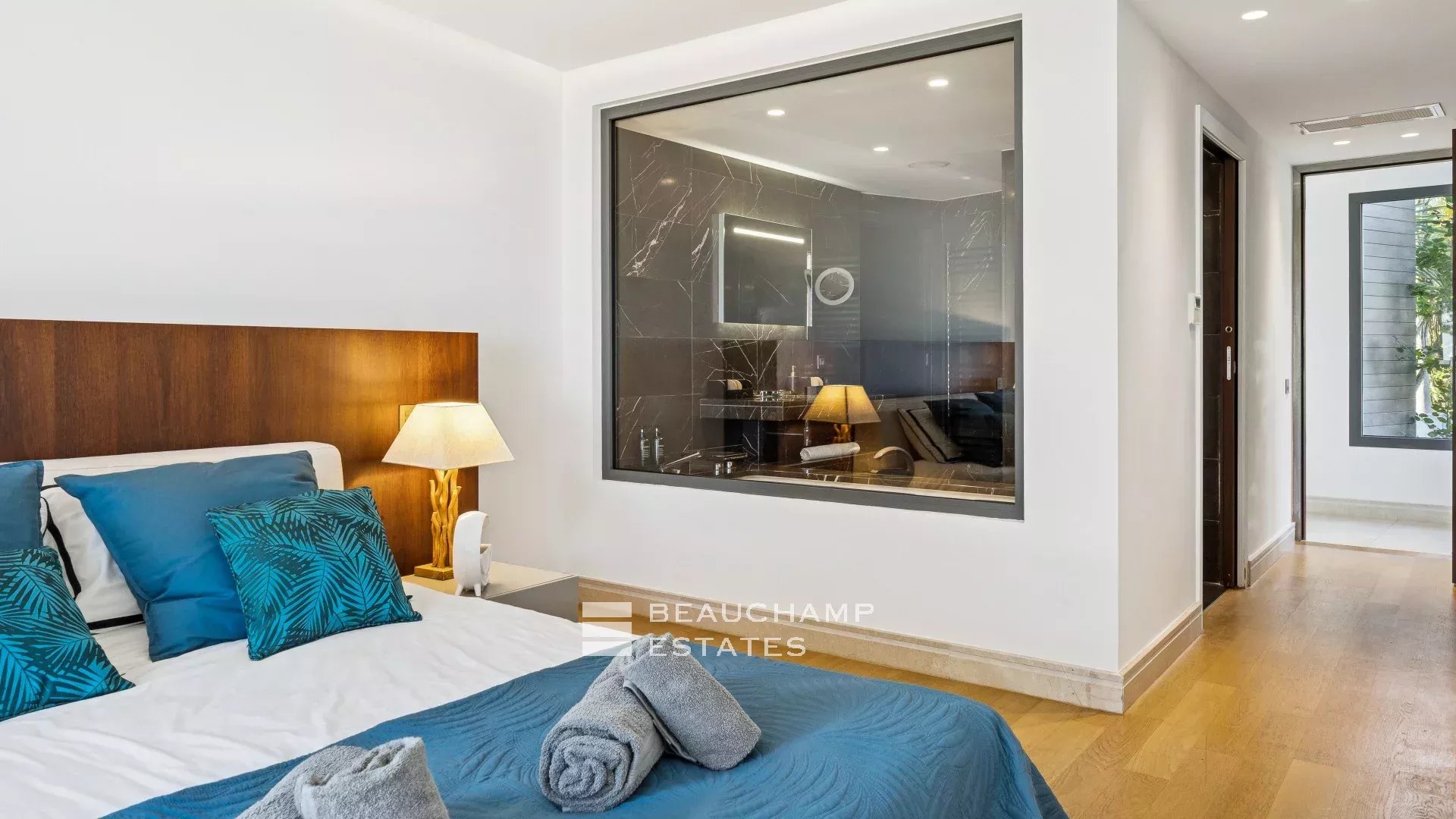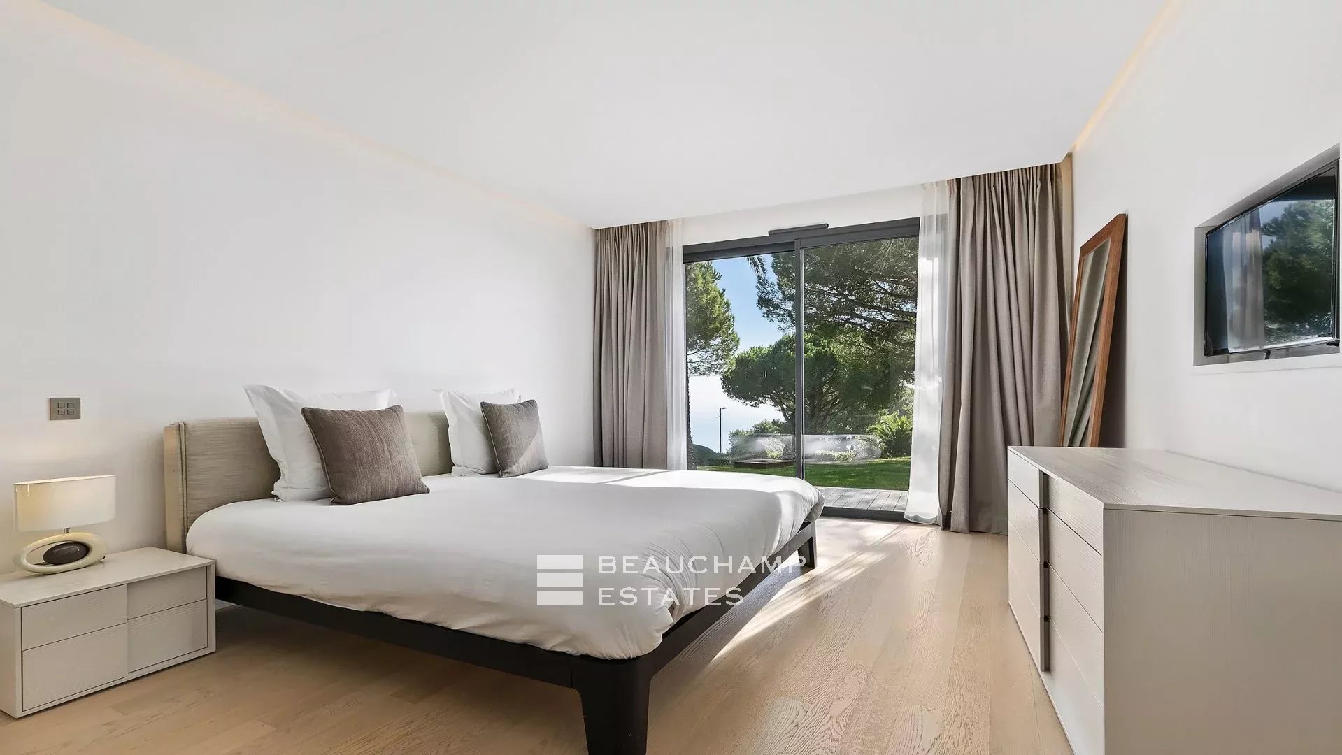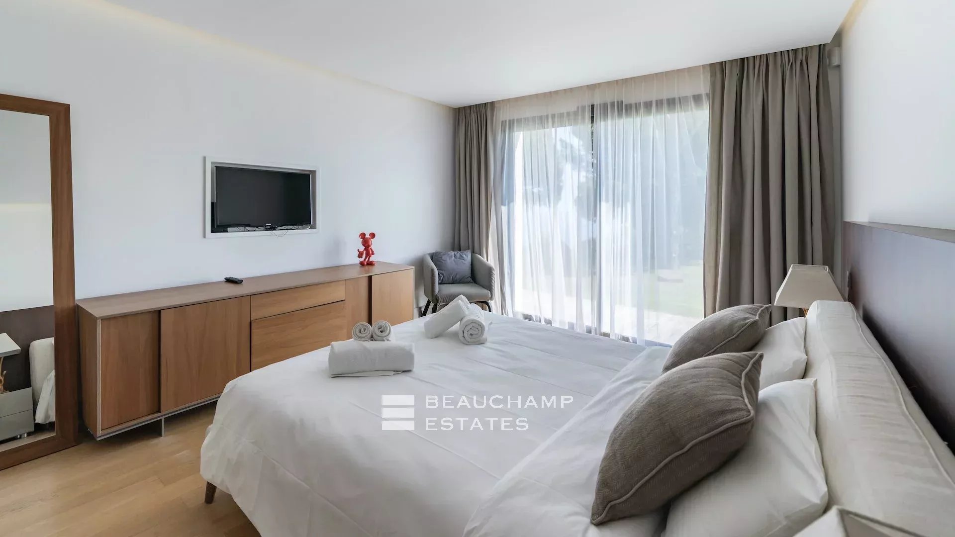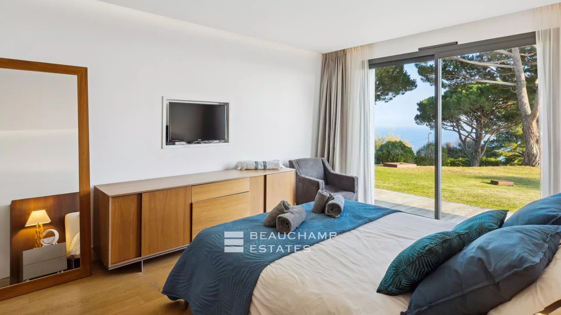 - Chambre 2 : 1 chambre double (180cm) TV, avec une salle de bain attenante, douche et WC indépendants. Terrasse et accès à la piscine, dressing avec coffre-fort et vue mer.