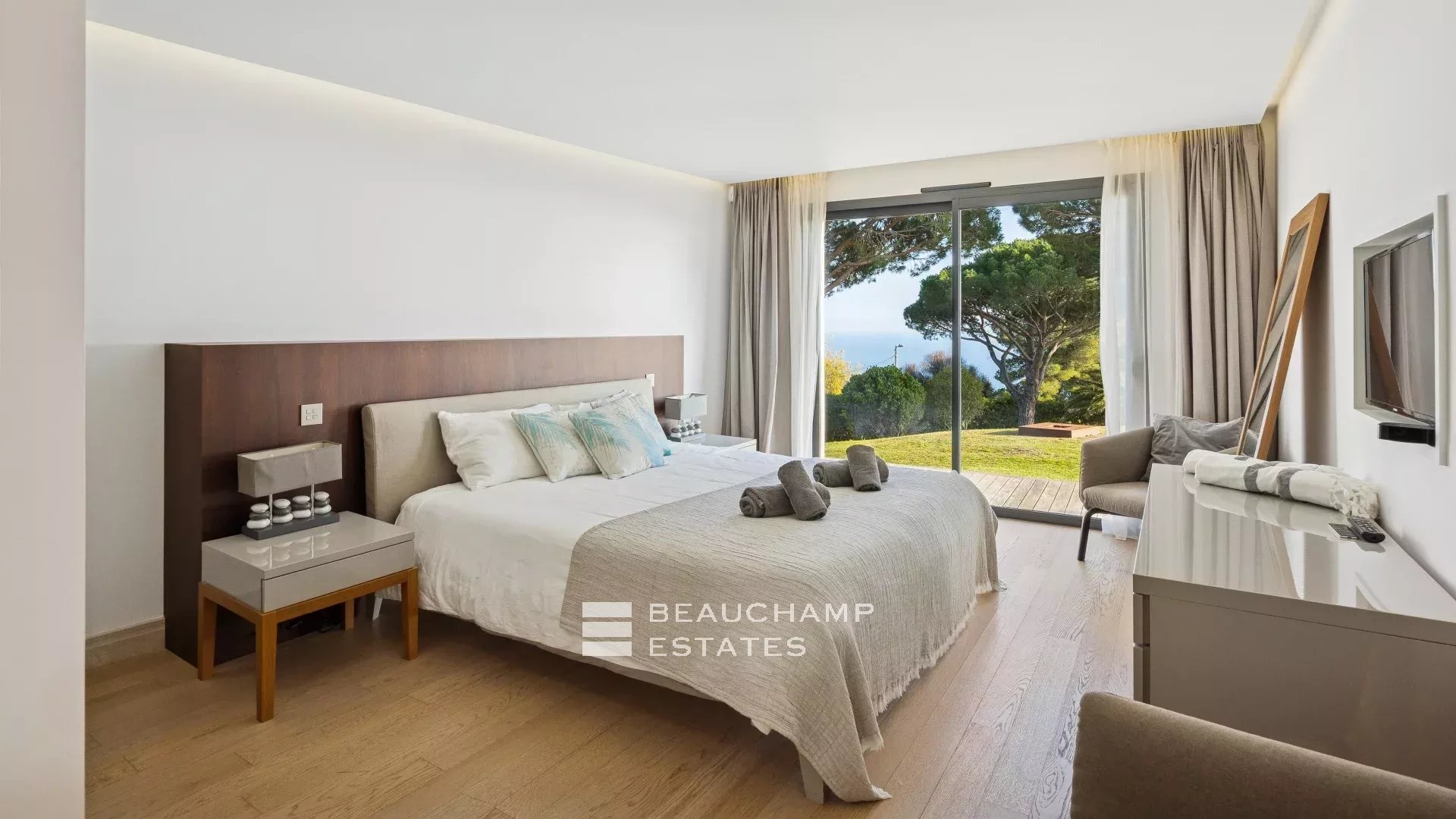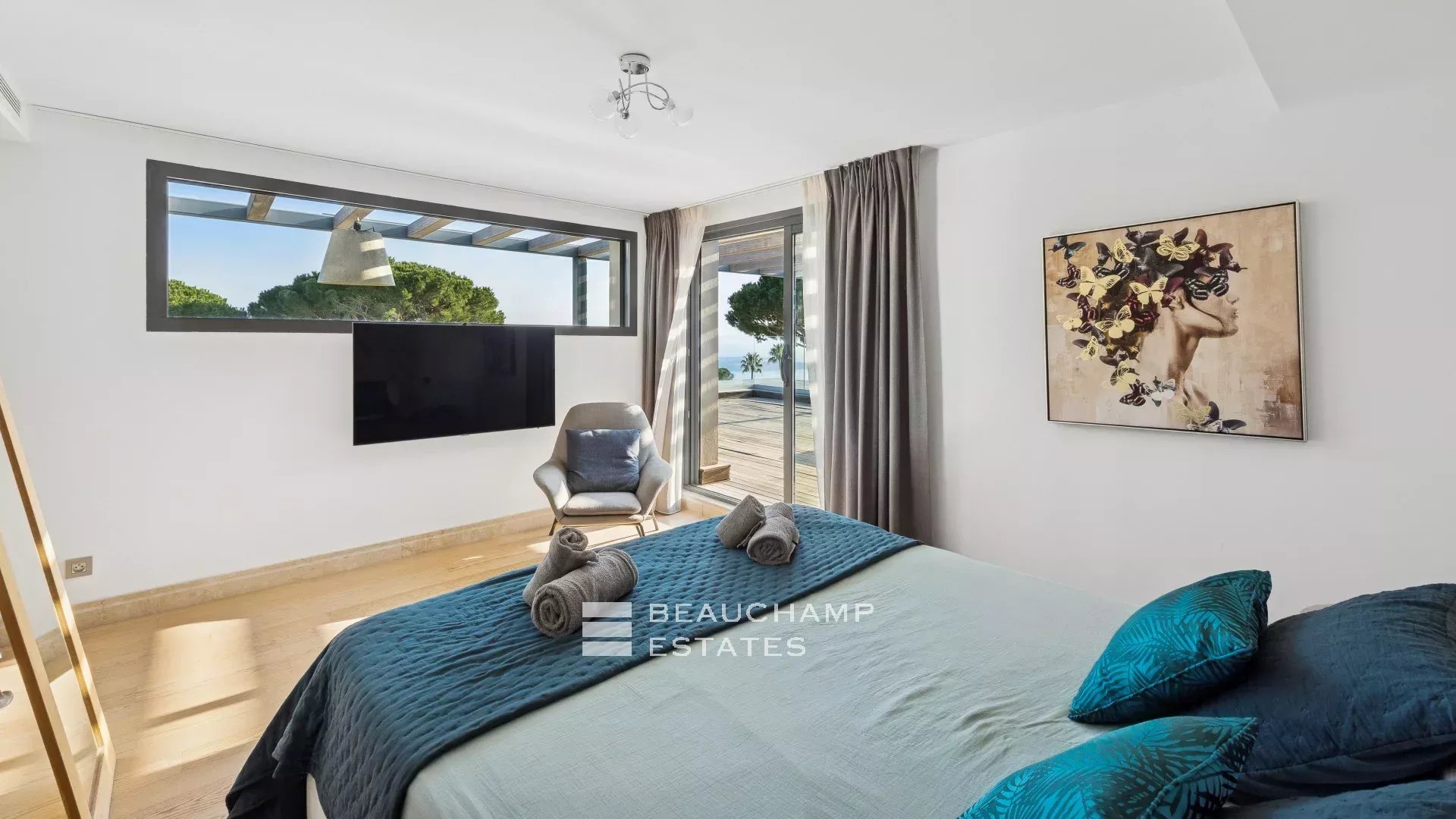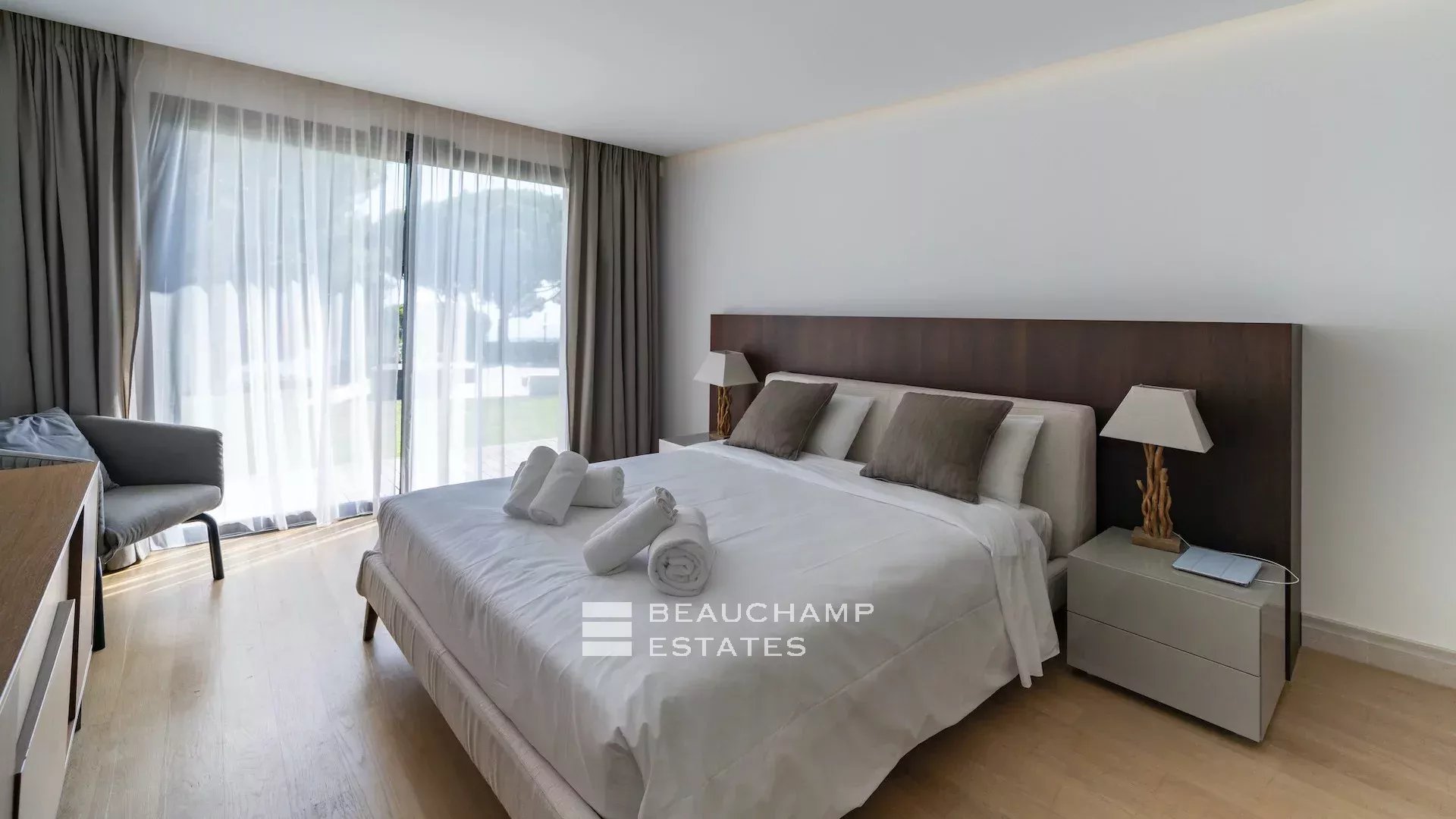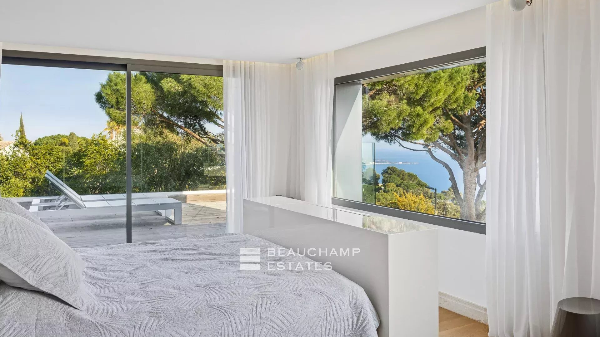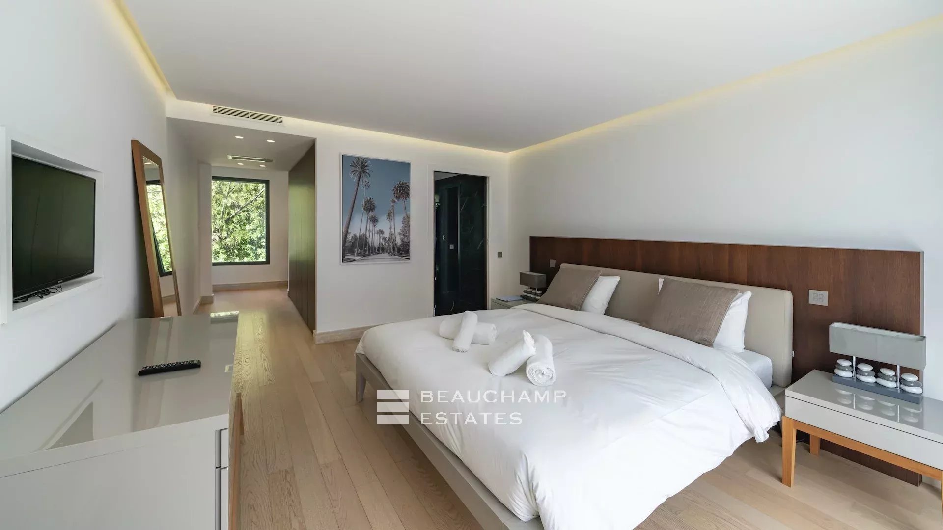 - Chambre 2 : 1 chambre double (180cm) TV, avec une salle de bain attenante, douche et WC indépendants. Terrasse et accès à la piscine, dressing avec coffre-fort et vue mer.