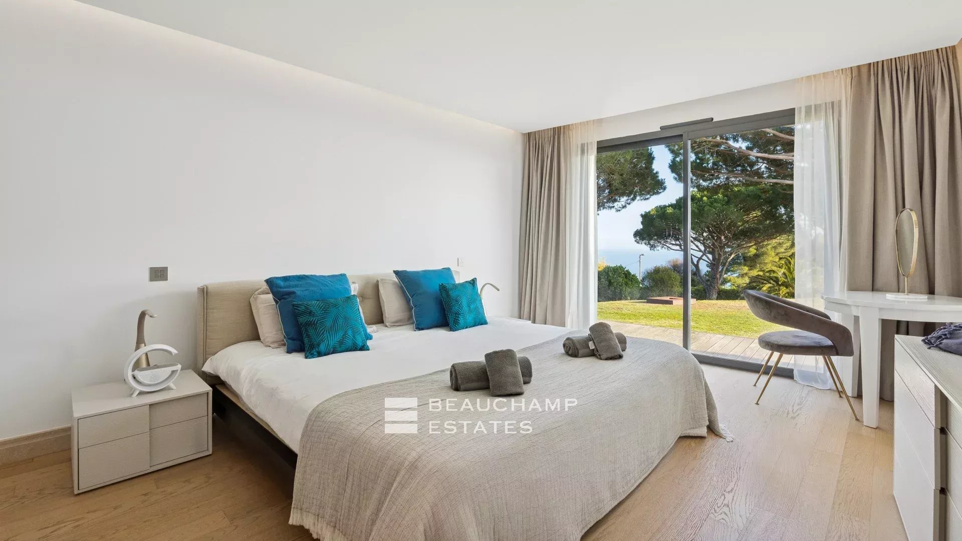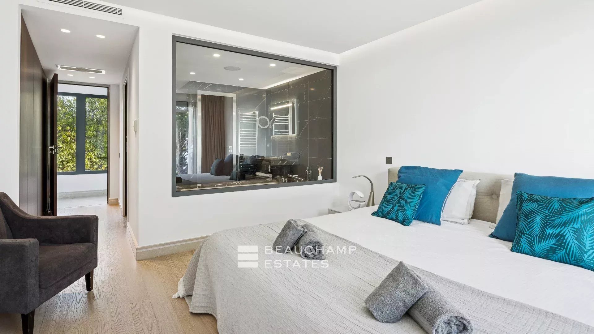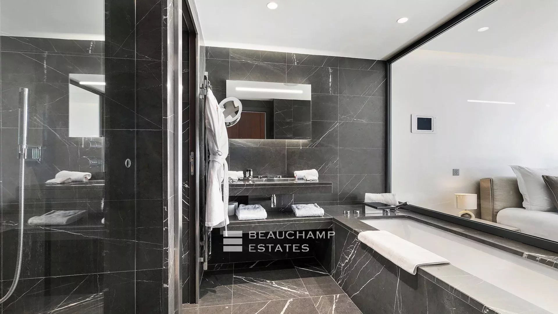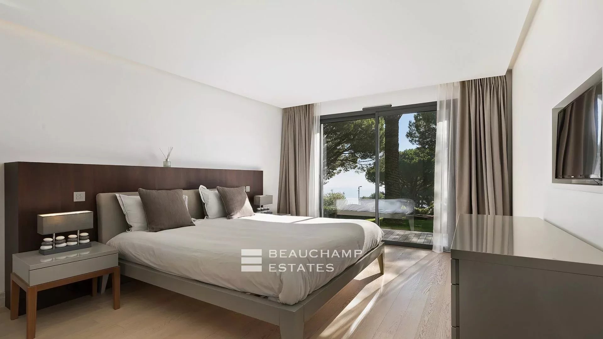 - Chambre 2 : 1 chambre double (180cm) TV, avec une salle de bain attenante, douche et WC indépendants. Terrasse et accès à la piscine, dressing avec coffre-fort et vue mer.