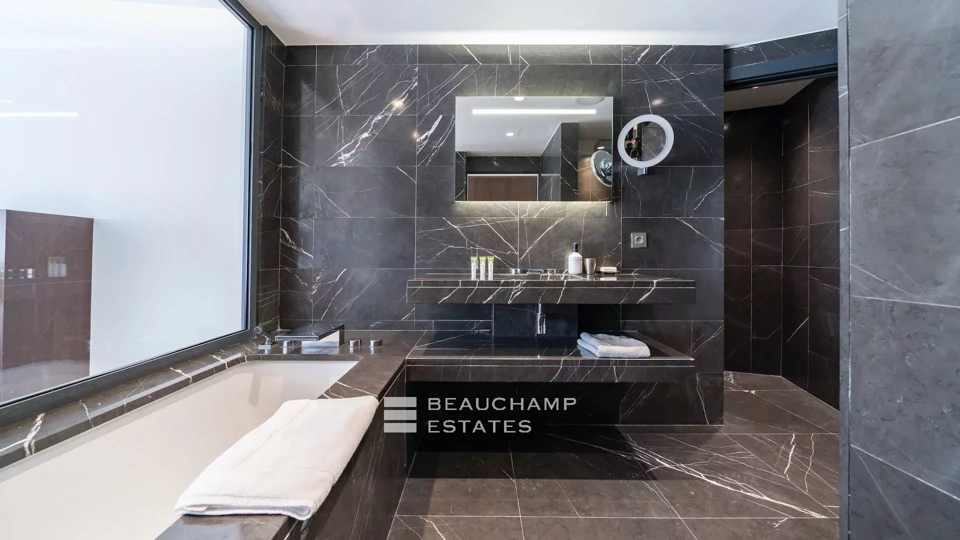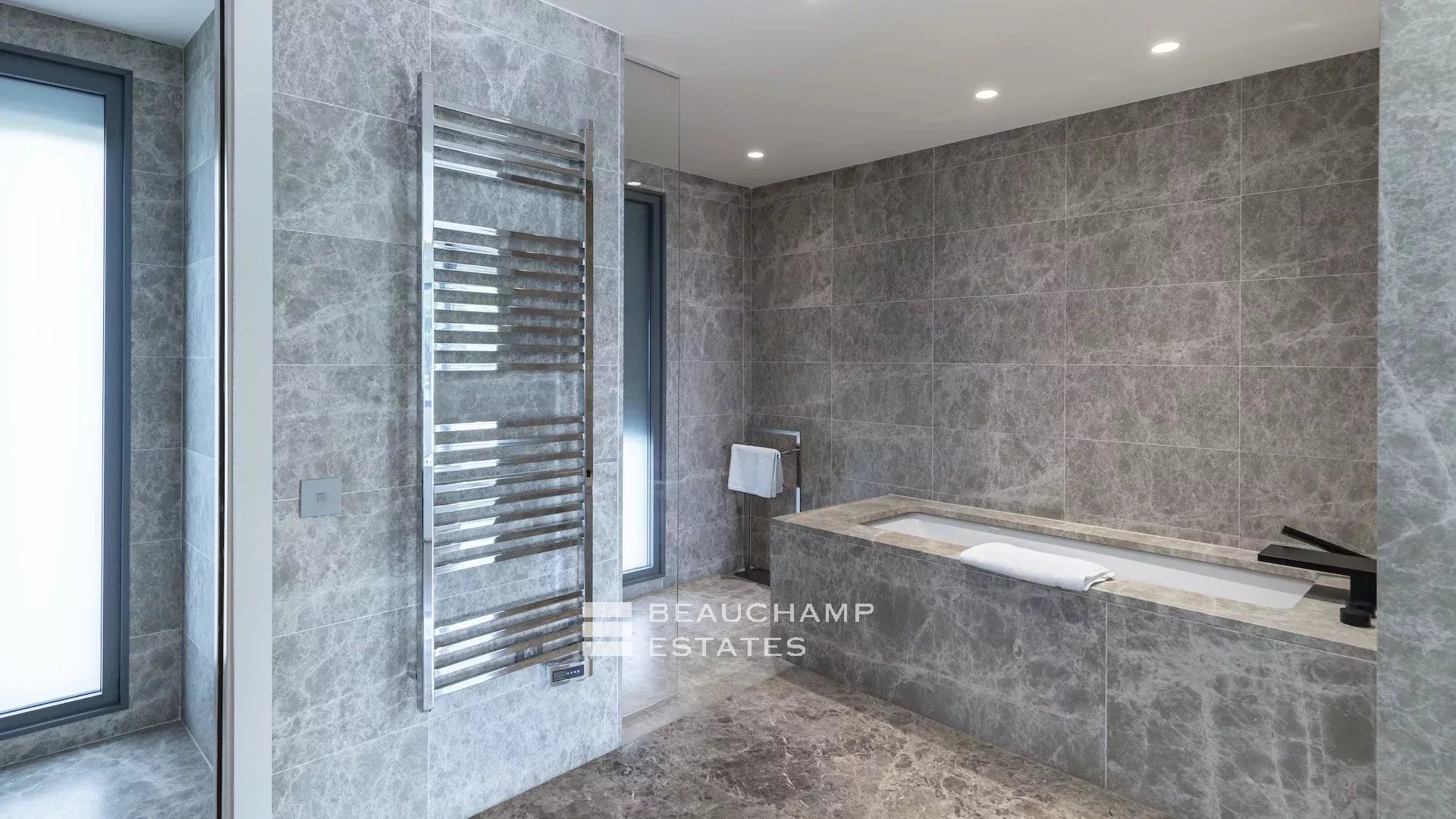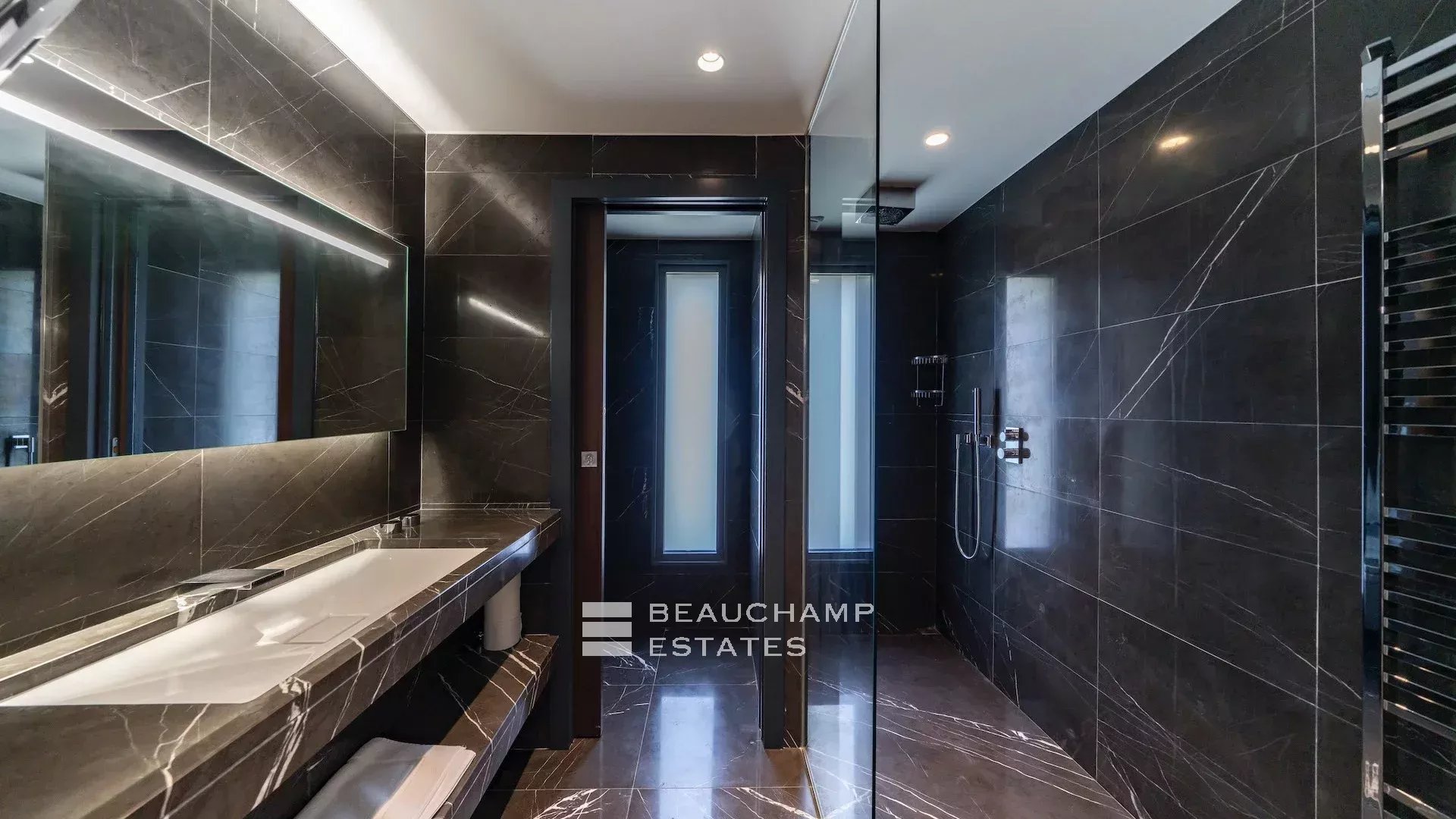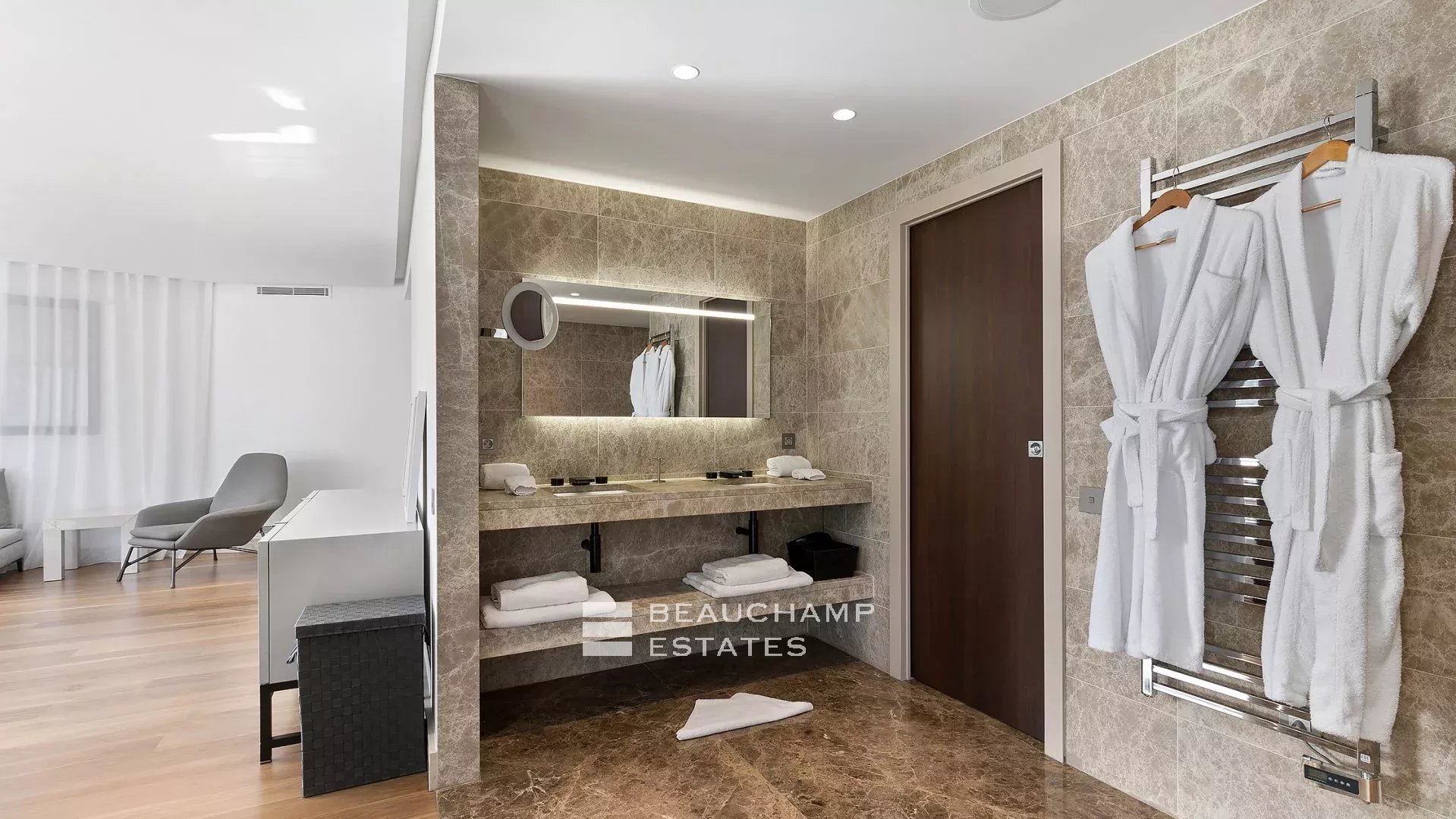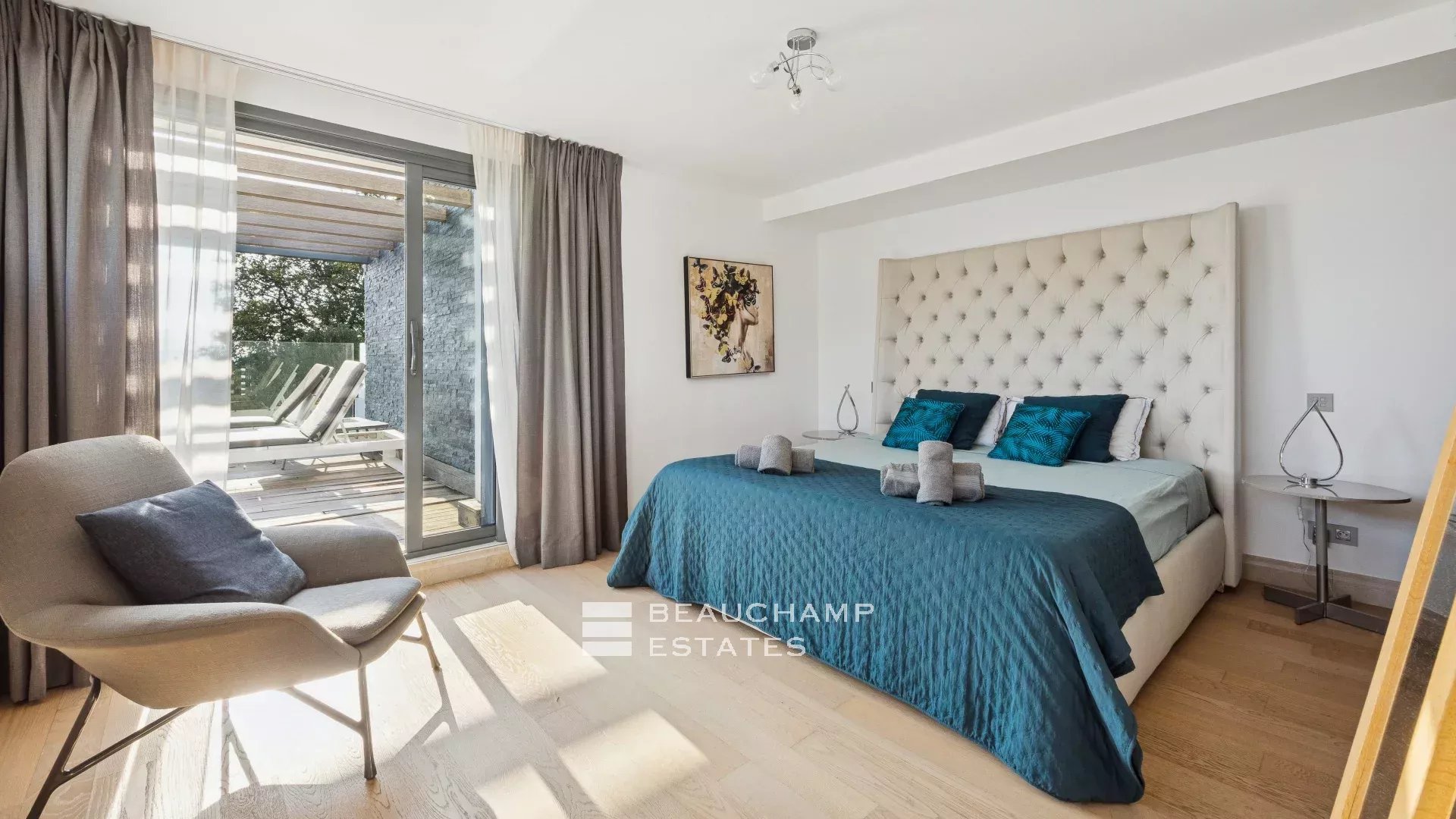 - Chambre 2 : 1 chambre double (180cm) TV, avec une salle de bain attenante, douche et WC indépendants. Terrasse et accès à la piscine, dressing avec coffre-fort et vue mer.