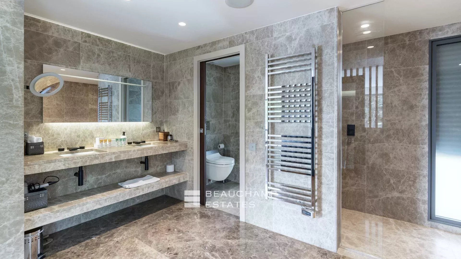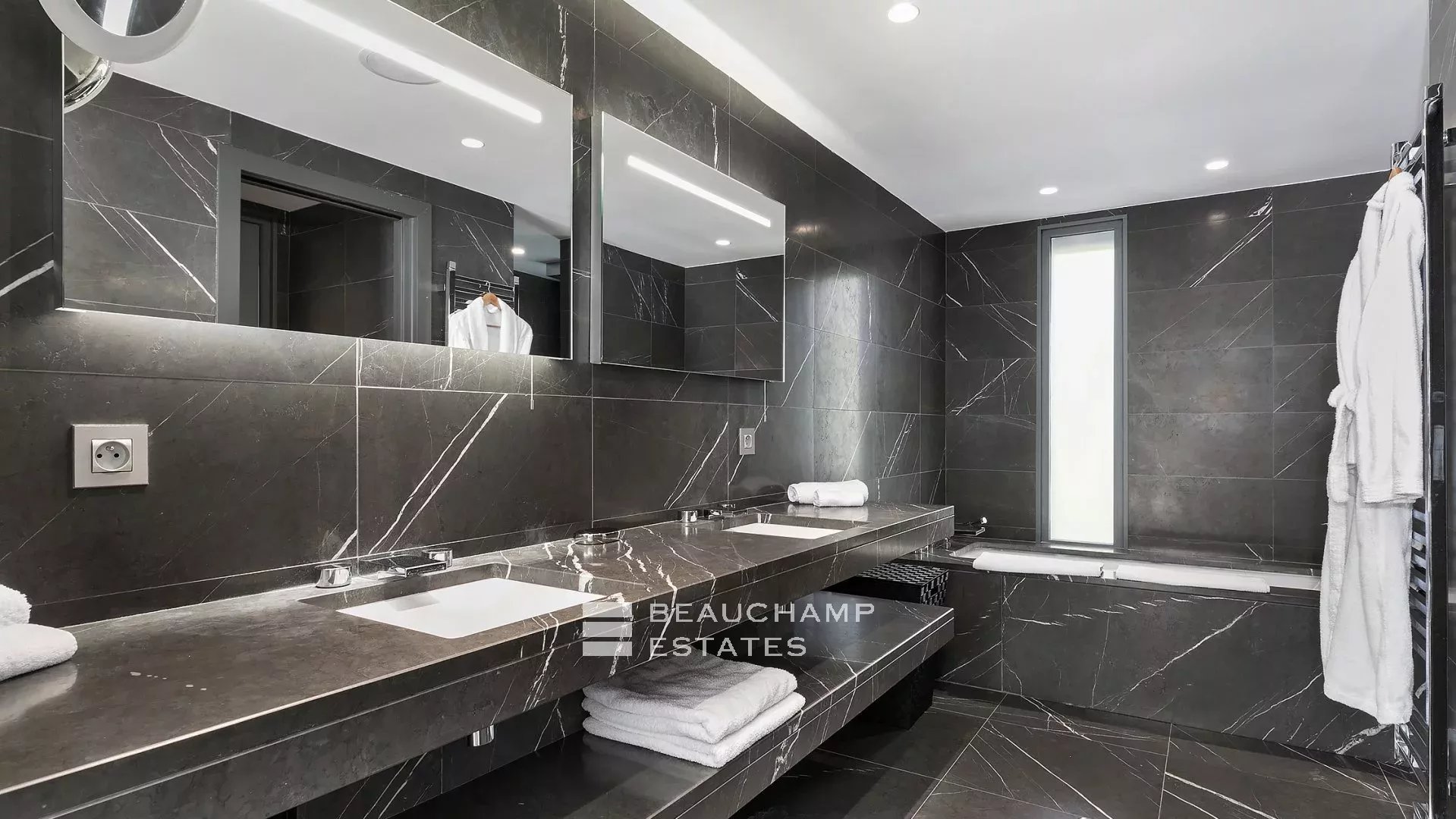 - Chambre 3 : 1 chambre double (160cm) TV, avec une salle de bain attenante, douche indépendante, double vasque et WC. Terrasse et accès à la piscine, dressing avec coffre-fort et vue mer.