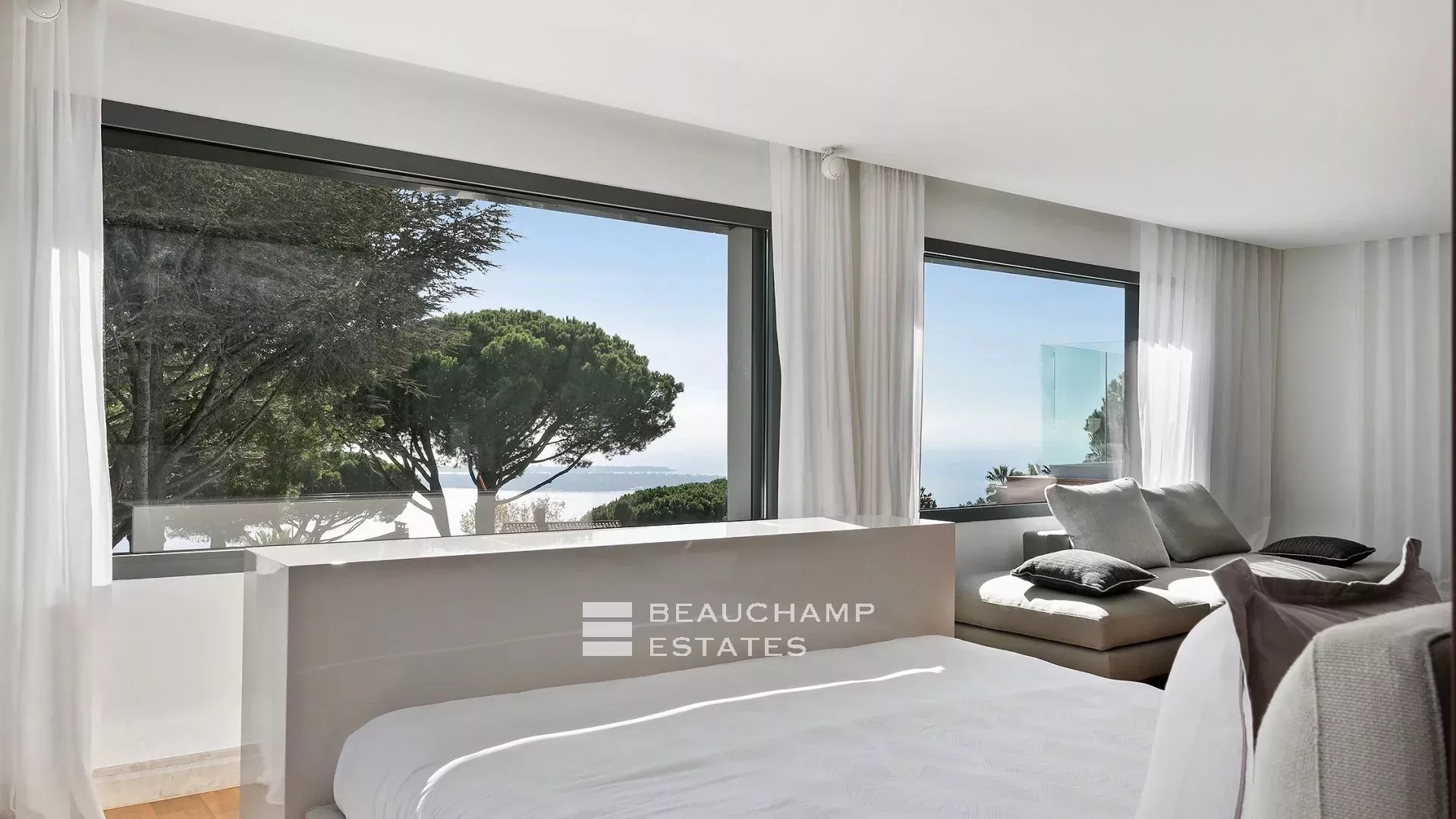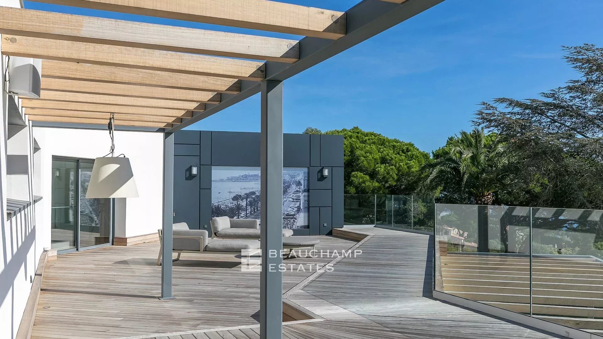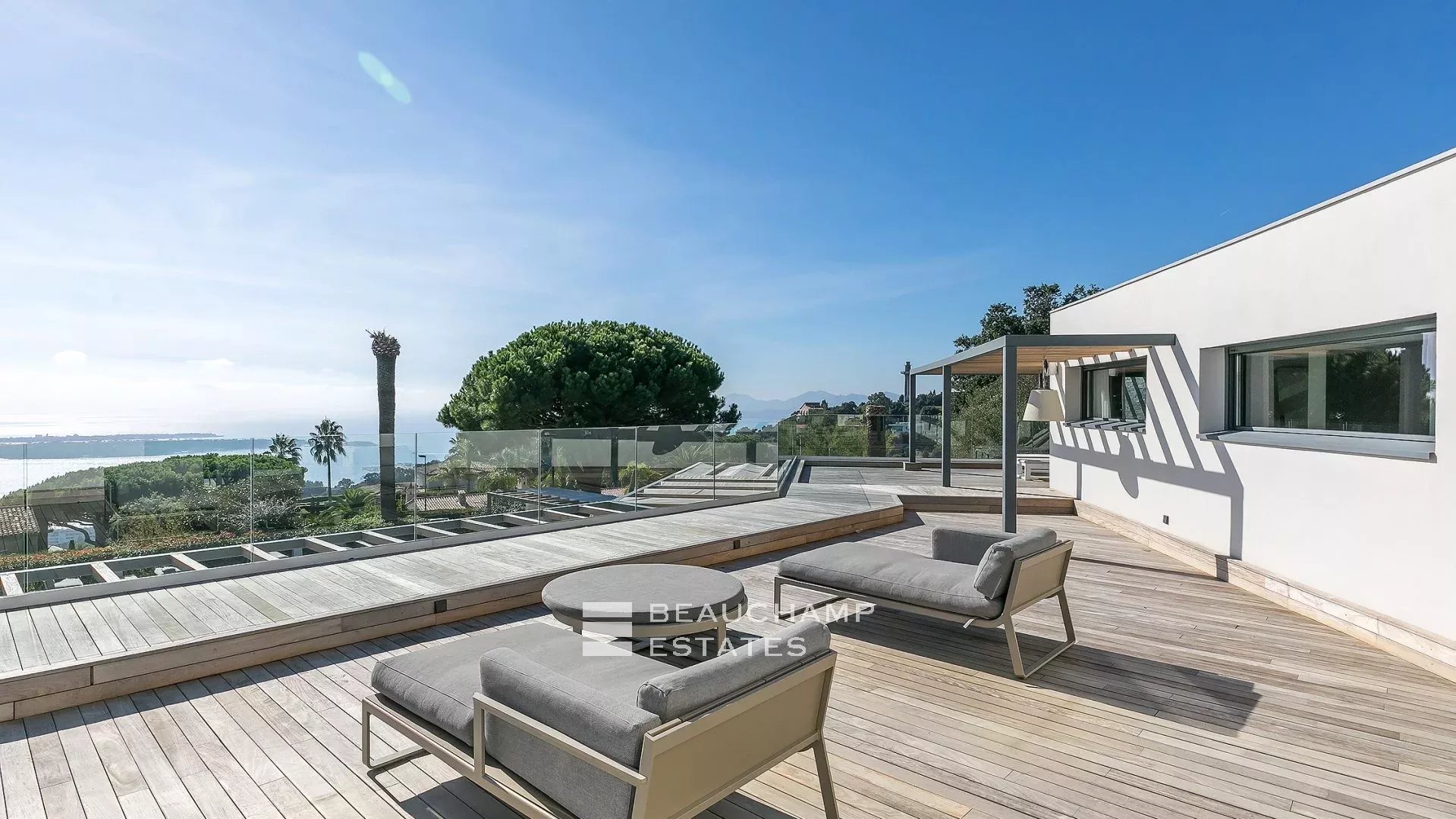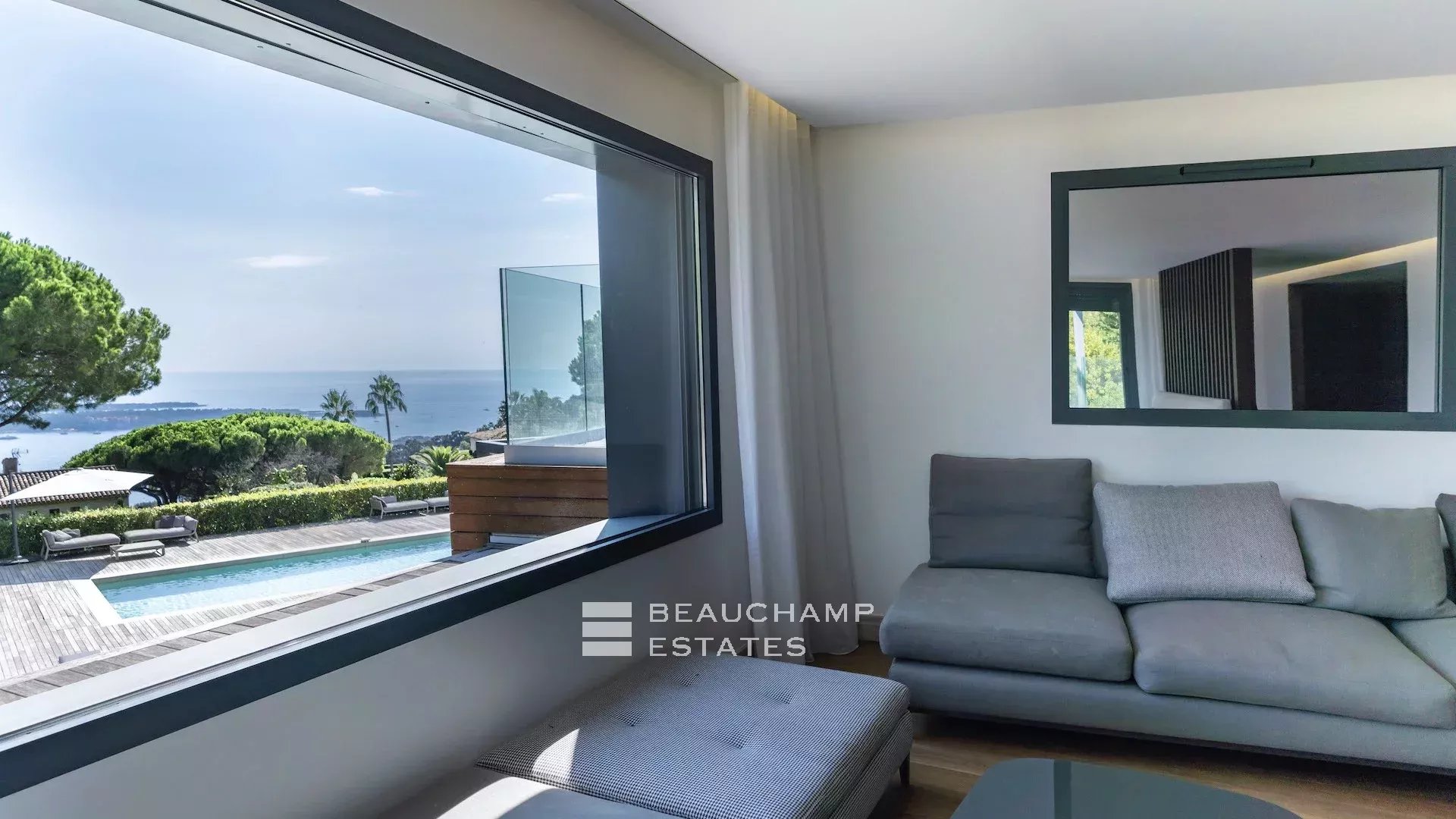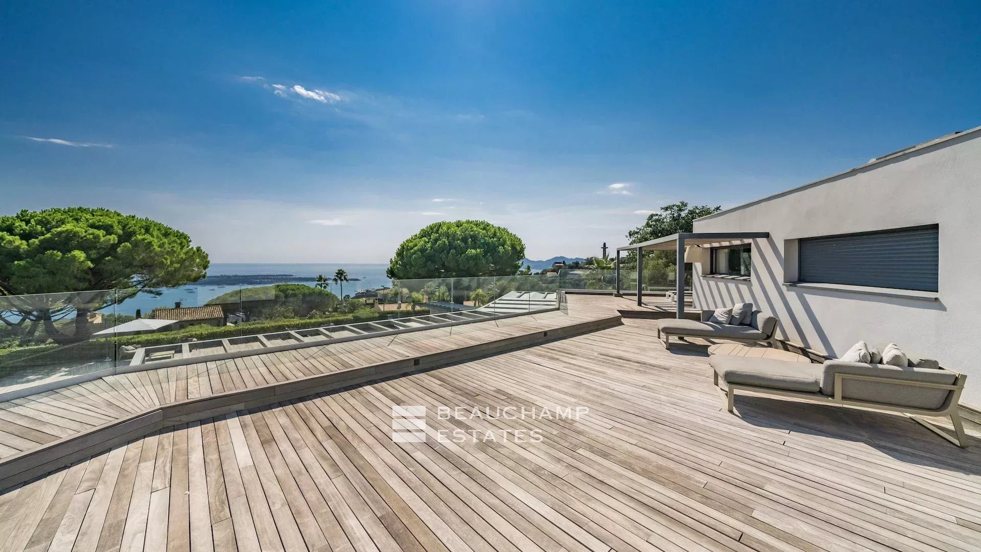 Cette villa moderne à couper le souffle de 700 m² est située sur les hauteurs de Cannes avec une vue mer panoramique et dégagées sur les îles au large de Cannes.