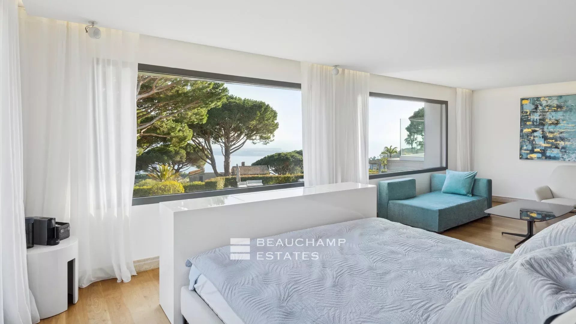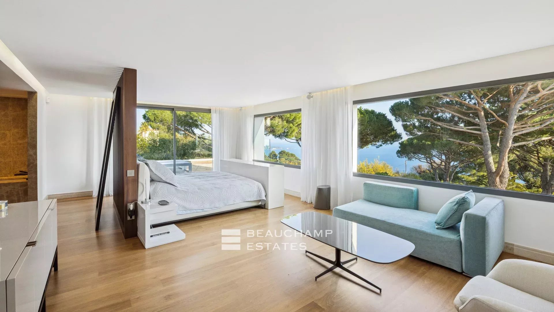 - Chambre 5 : Chambre parentale (180cm) TV, coin salon, avec une salle de bain attenante, douche indépendante, double vasque et WC. Grande terrasse avec une vue imprenable sur la mer.