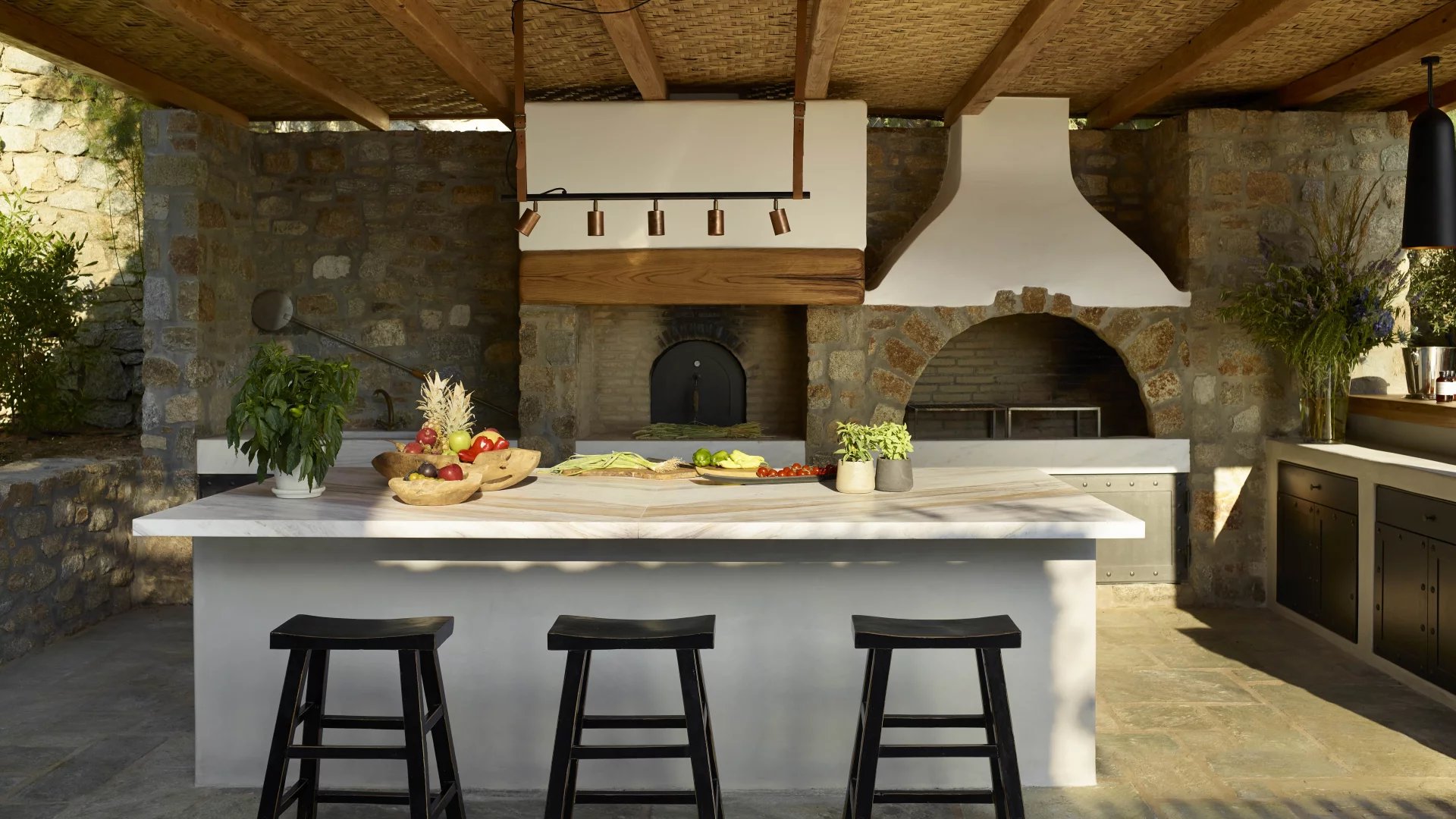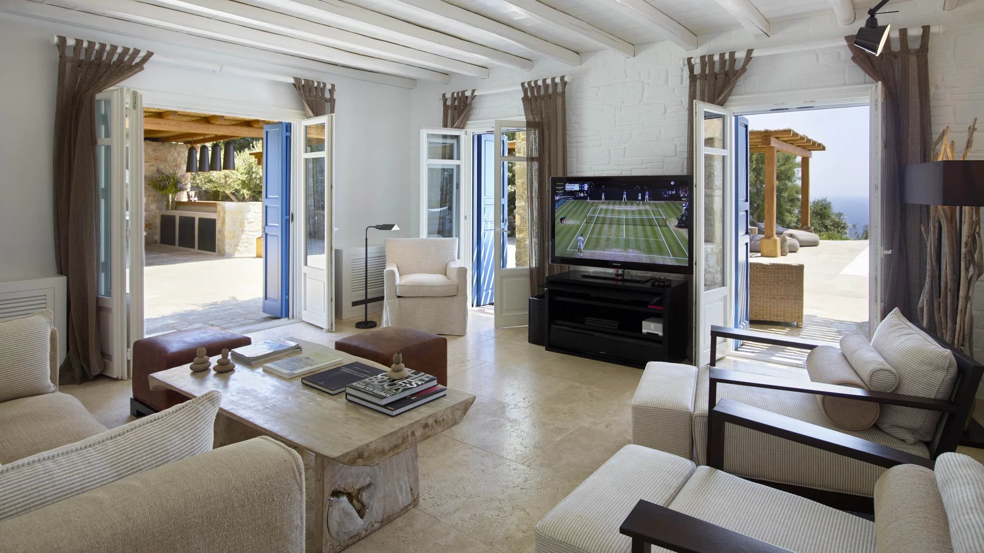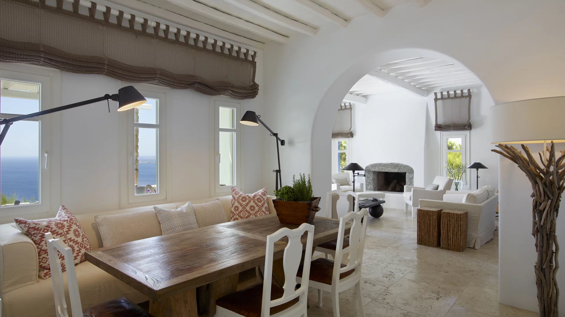 The interiors are furnished by acclaimed Italian designer Stefano Dorata. His signature classic style is embodied throughout the home, without ever taking away from the smooth Mykonian white render. Single-sourced travertine marble flooring and soft textures reach all social and privatecorners of the home. All aspects of his design were brought together to focus on harmony, symmetry, and relaxation.