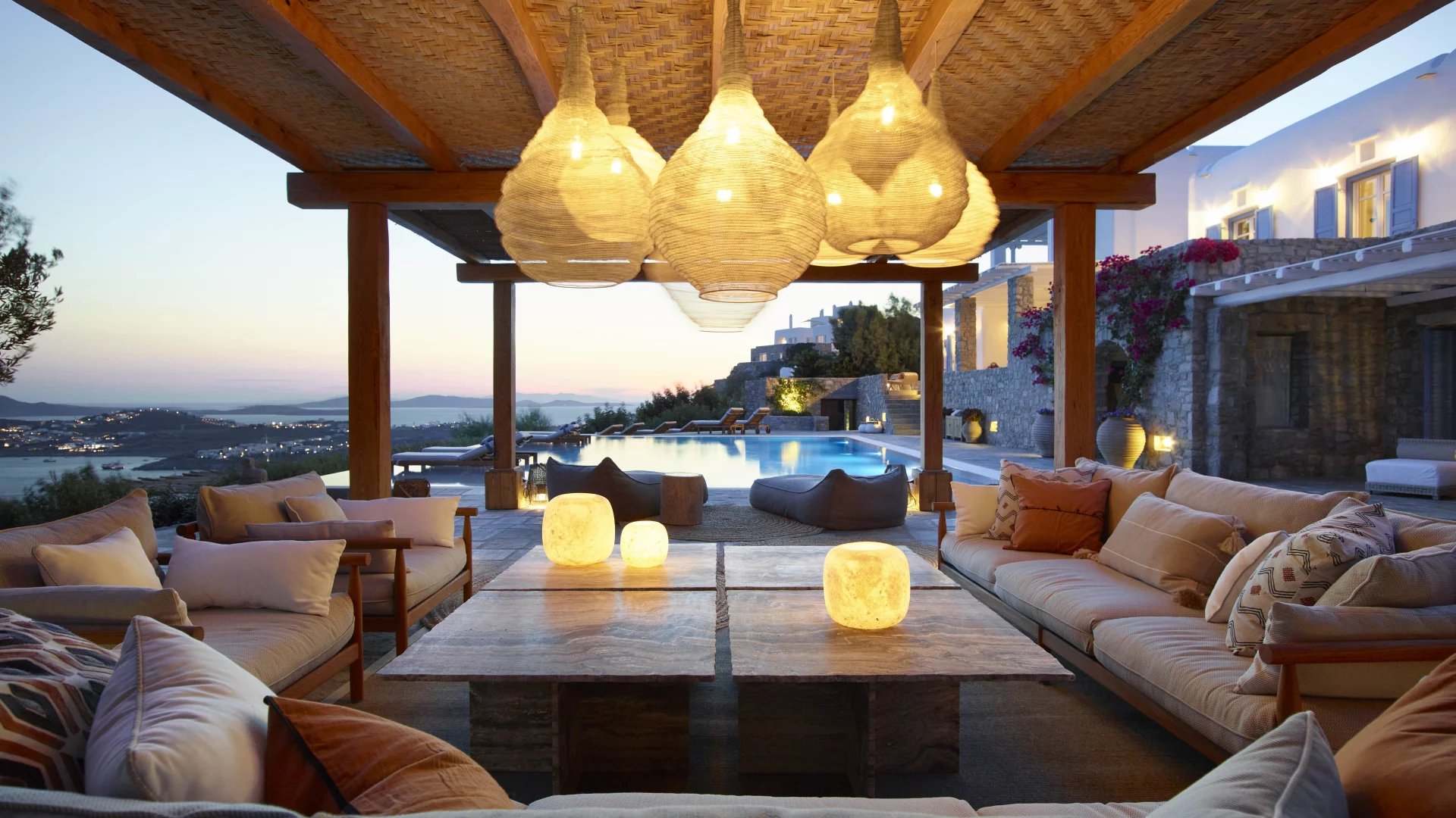 Villa Ariadni is a sumptuous private getaway in the most sought-after neighbourhood of Mykonos, Agios Lazaros. Situated at the top of the hill, facing the Bay of Ornos, the home enjoys some of the most stunning views on the island.