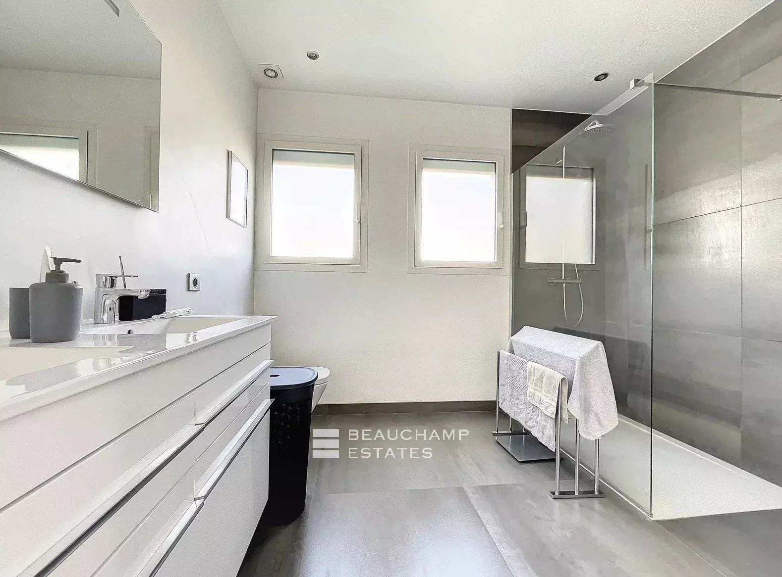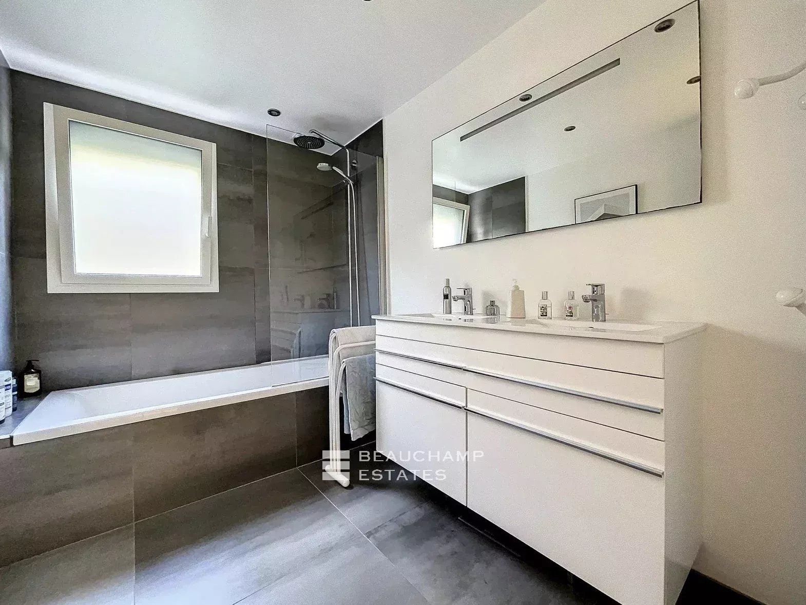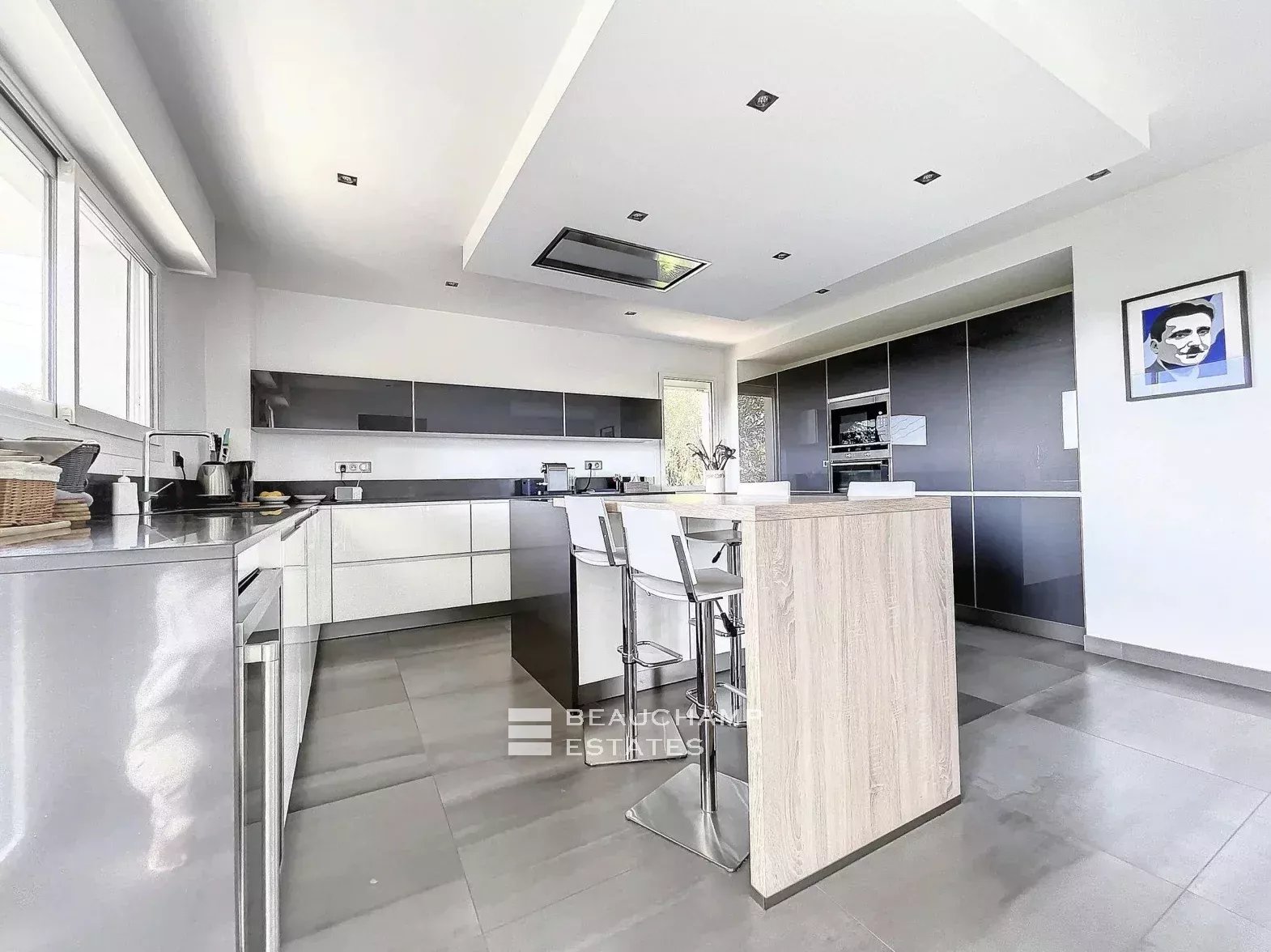 Une grande cave, un garage avec borne de recharge pour véhicule électrique et piscine complètent l'ensemble sur jardin paysager au calme total.