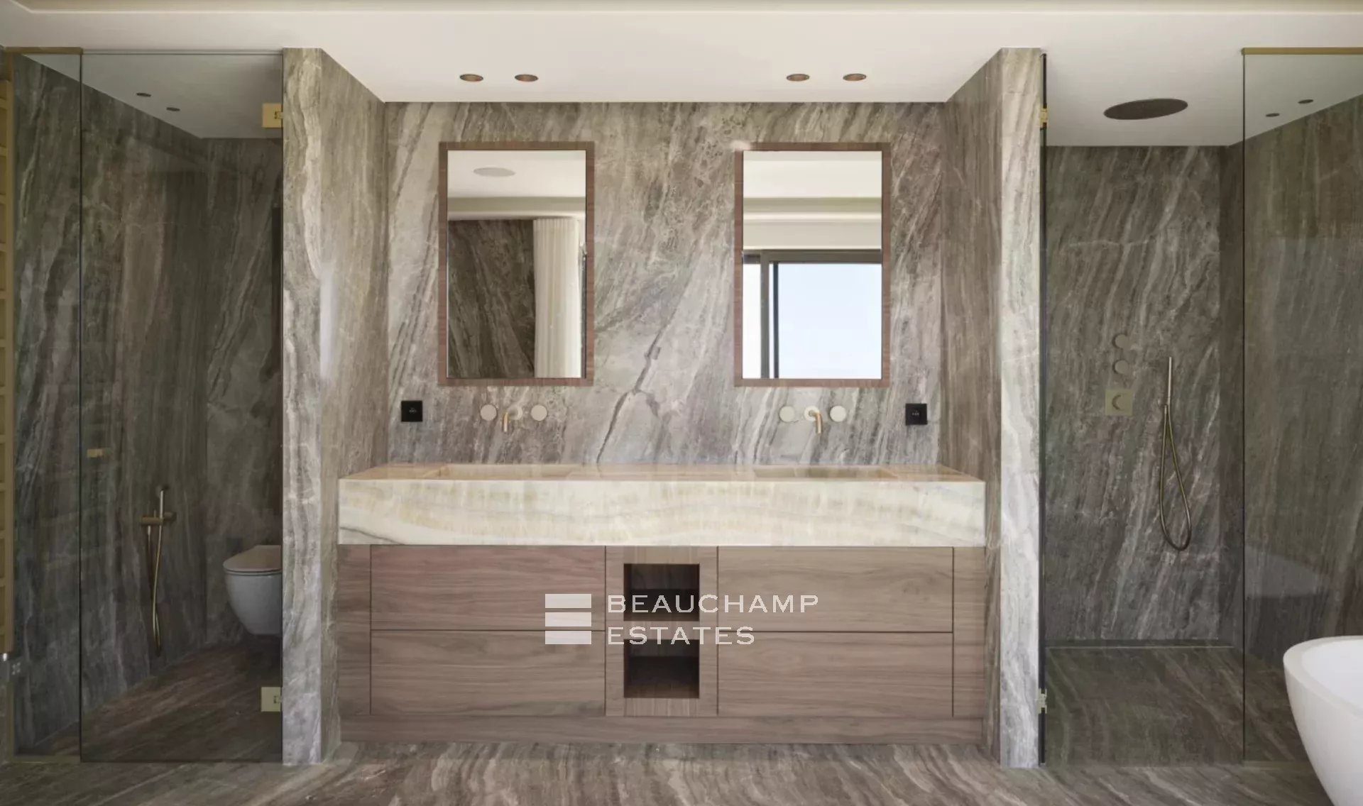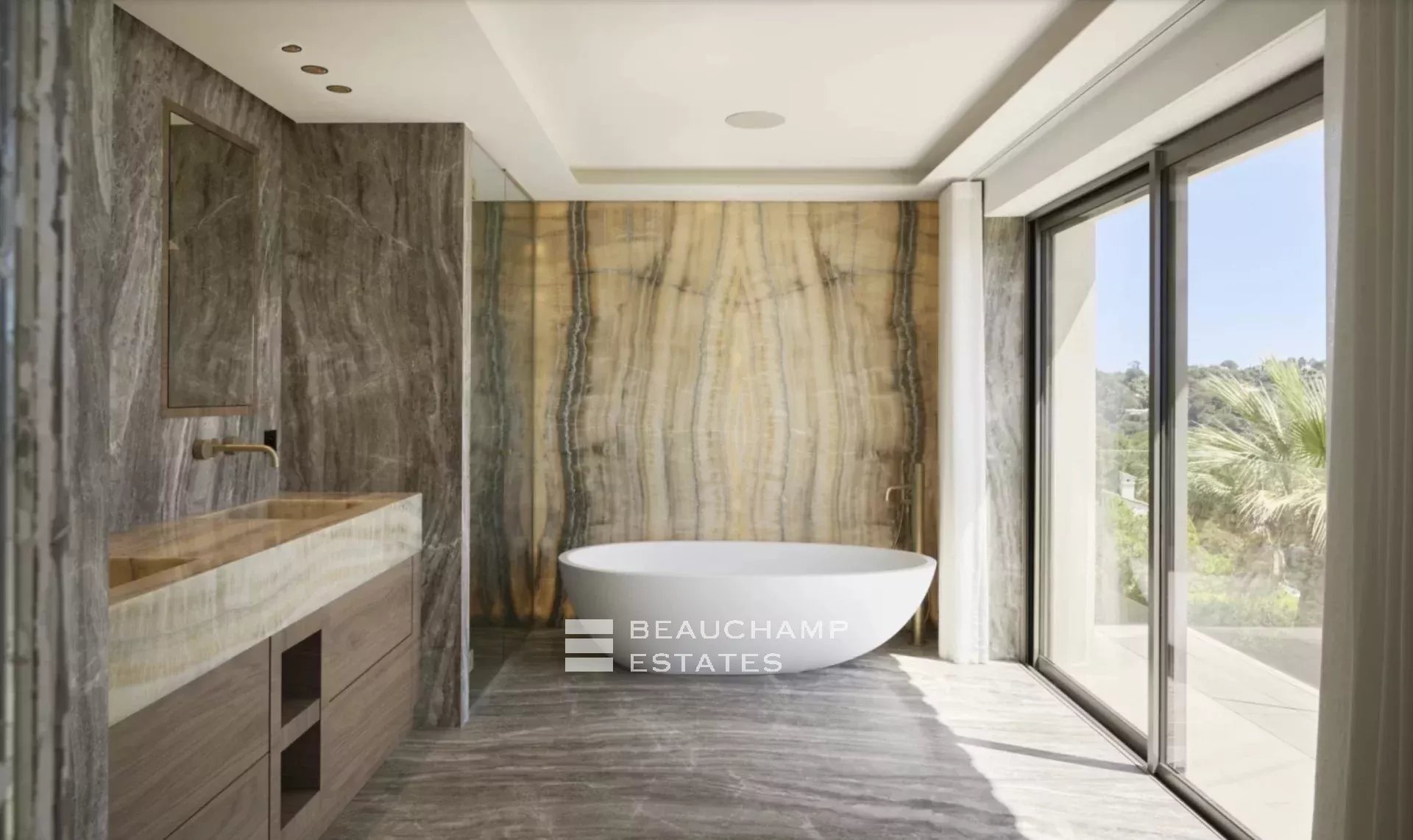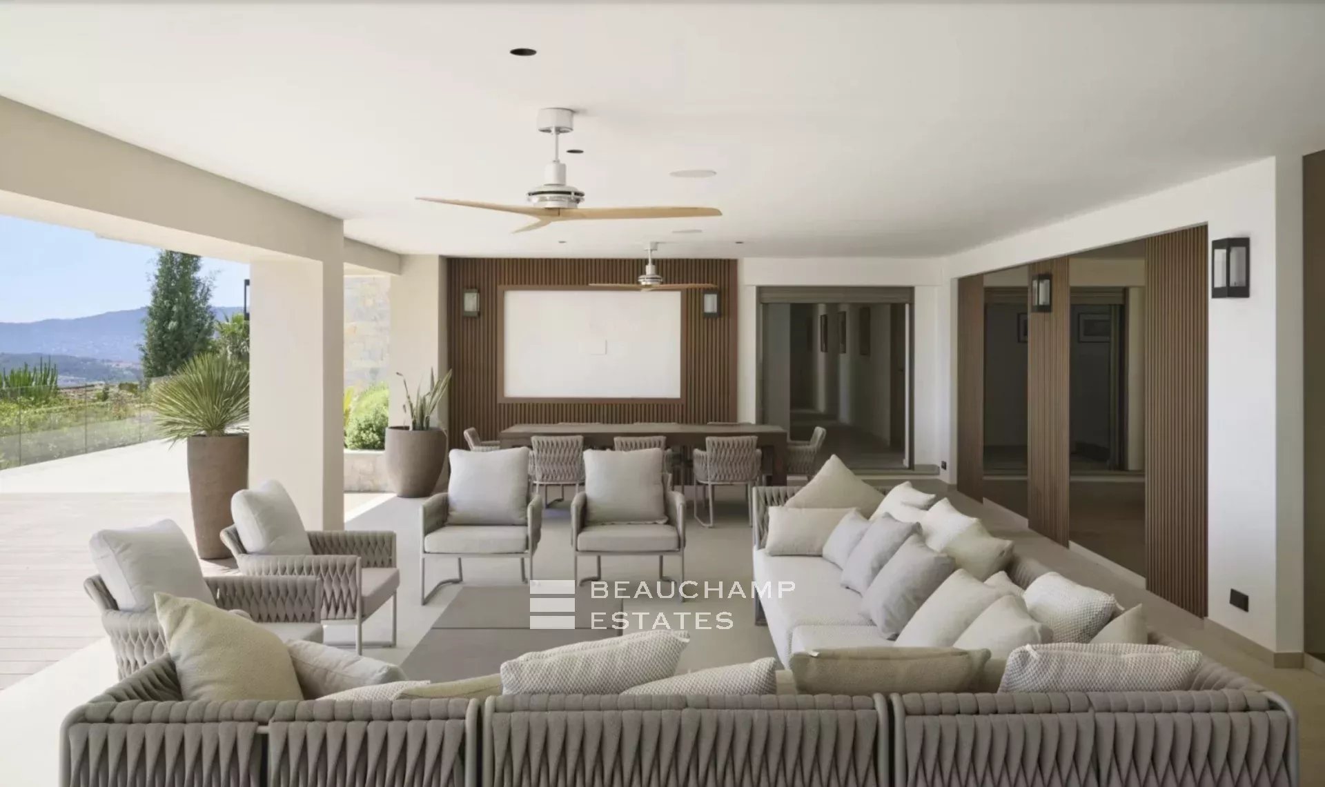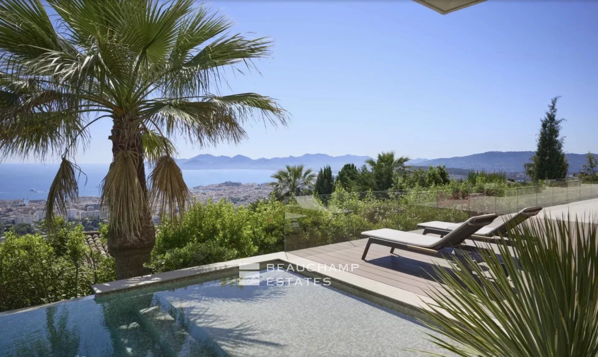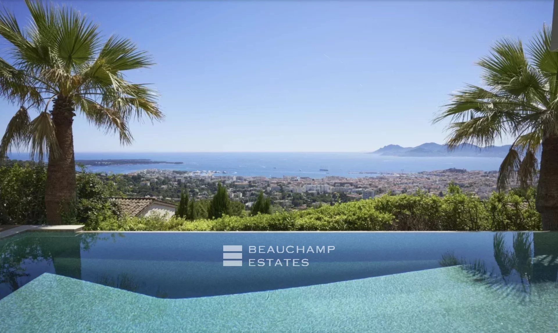 Dominant la baie de Cannes et située dans un dans un domaine privé et gardé 24h/24, belle villa entièrement rénovée d'environ 400m2 habitables se composant d'un grand séjour avec cheminée, d'une chambre principale avec dressing et salles de bains, de 4 chambres avec chacune son dressing et sa salle de bains, d'un home cinéma, d'un fitness, d'une piscine à débordement avec pool house équipé, d'un garage pour 3 voitures.