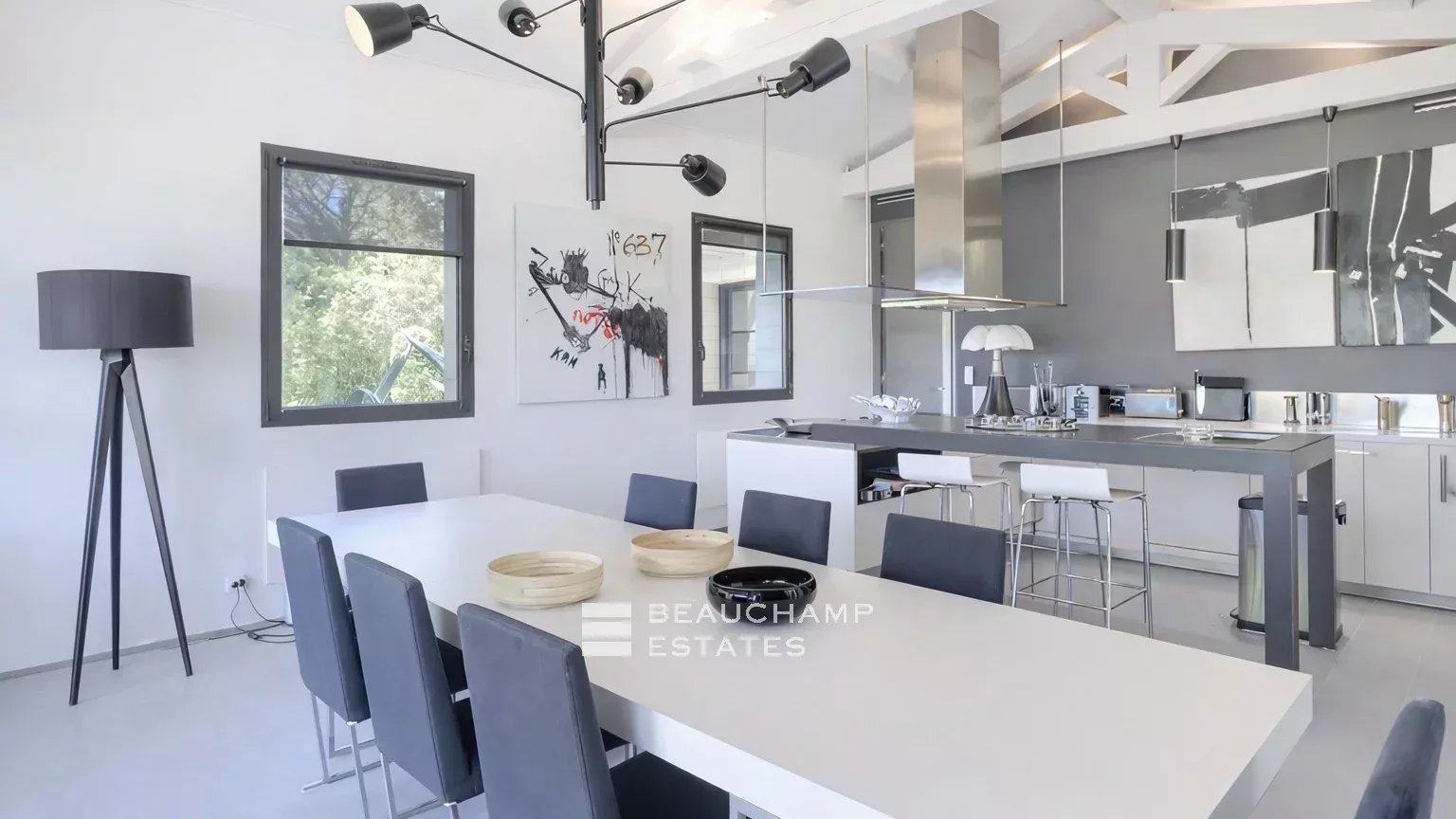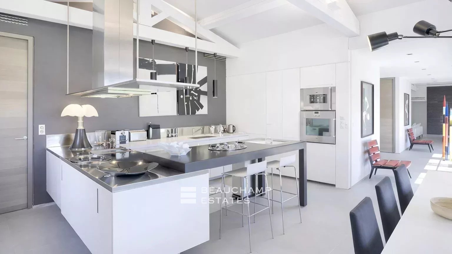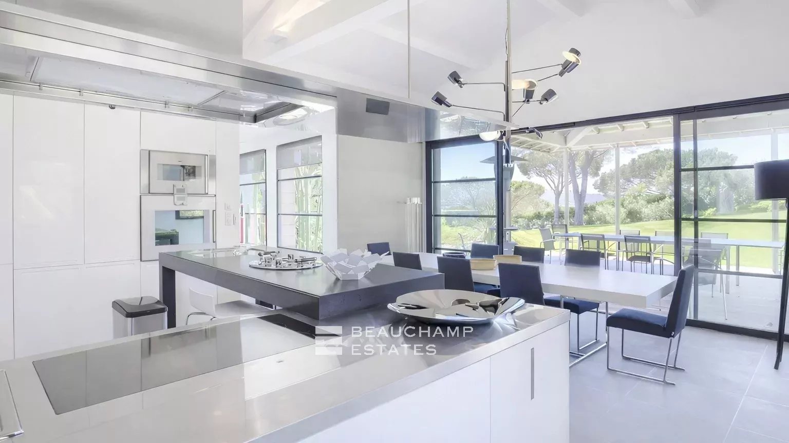 Le vaste séjour, prolongé par une cuisine ouverte semi-professionnelle, s’ouvre sur un espace piscine spectaculaire. Le jardin dévoile une vue mer et accueille une piscine chauffée de 16 x 6 mètres, véritable cœur de la propriété, idéale pour des séjours placés sous le signe de la détente et de l’élégance.