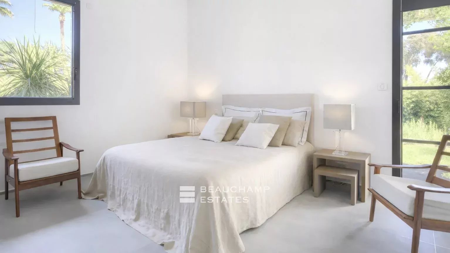 Développée sur de généreux volumes, la propriété offre cinq élégantes suites, auxquelles s’ajoute une sixième chambre dédiée au personnel, toutes disposant de leur salle de bains privative. Les espaces de réception séduisent par leur luminosité et leur ouverture naturelle vers les terrasses en bois, invitant à une parfaite harmonie entre intérieur et extérieur.