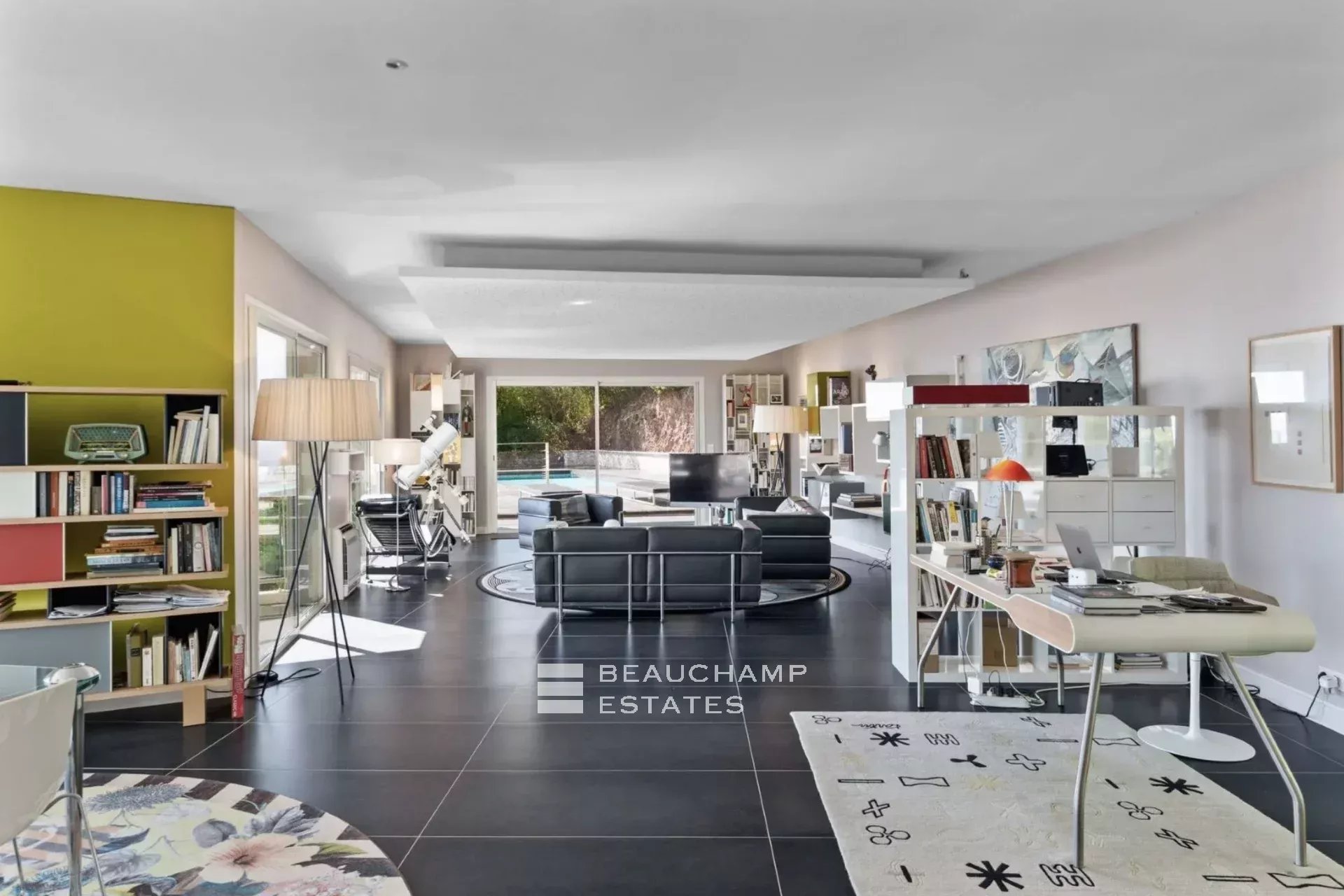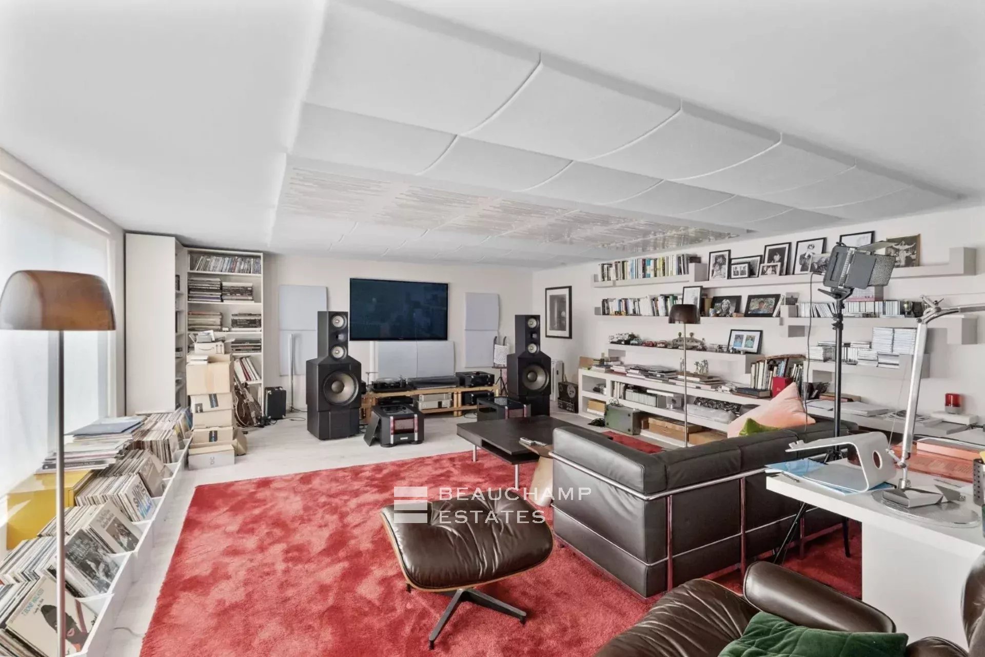 Le niveau inférieur offre deux chambres, une salle de bains et une grande salle de musique et de projection, aisément transformable en deux suites supplémentaires.