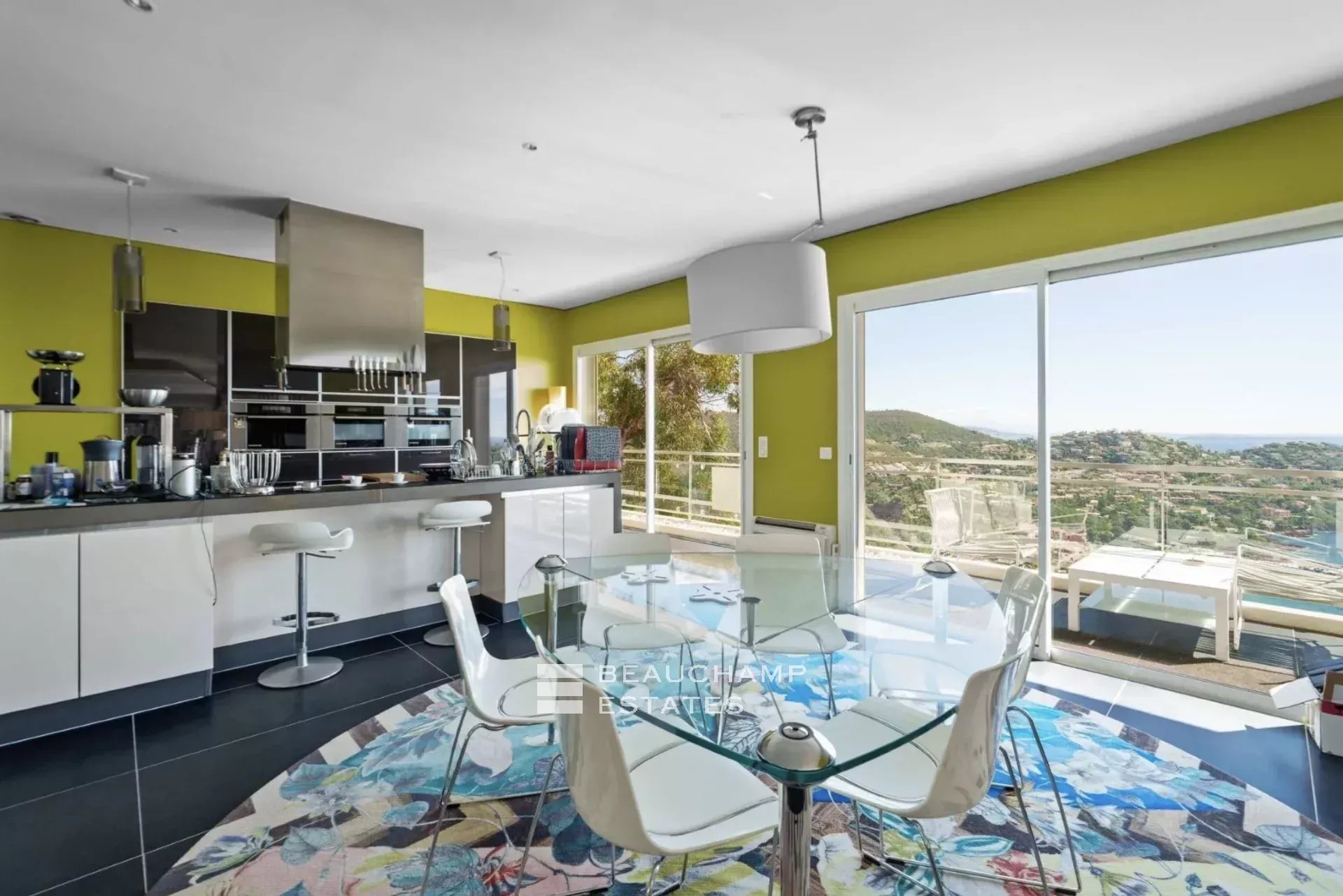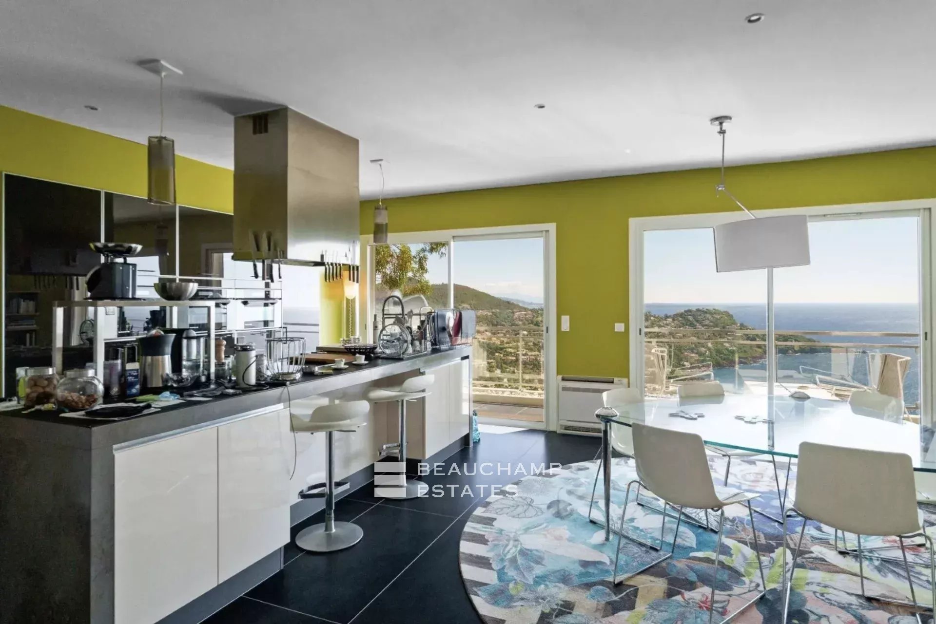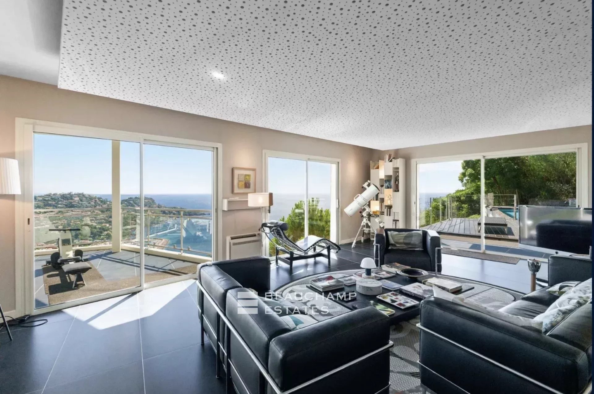 Le niveau principal comprend un vaste double séjour baigné de lumière avec cuisine ouverte entièrement équipée, une suite parentale avec salle de bains et une grande terrasse de plain-pied donnant sur une piscine à débordement face à la mer.