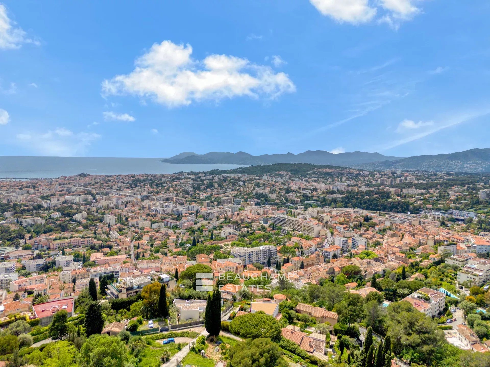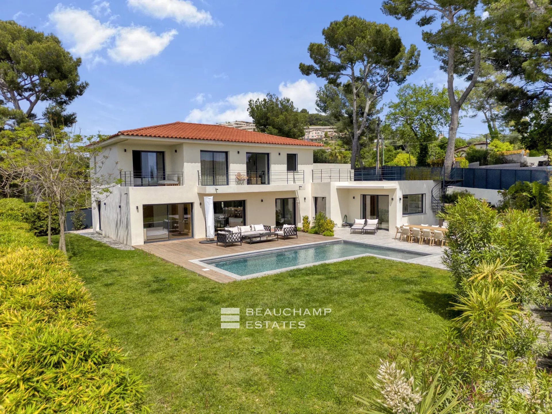 Une grande terrasse permet de profiter d’une jolie vue sur la piscine et le jardin paysager, tandis qu’un toit-terrasse accessible offre une belle vue mer, idéale pour des moments de détente.