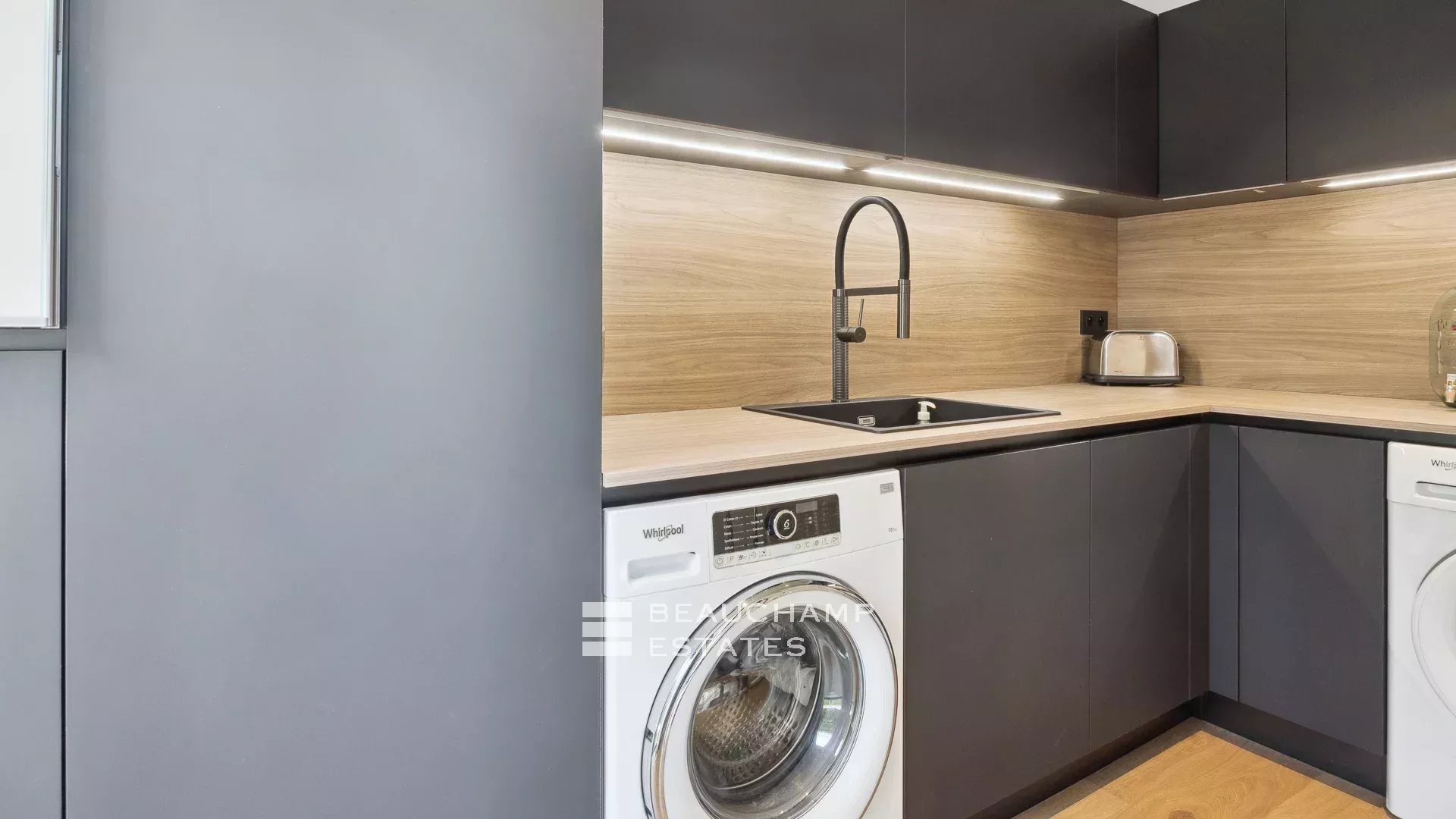 - Un spacieux séjour très lumineux avec salon et cheminée à l’éthanol, un coin bibliothèque, une salle à manger, et une cuisine ouverte entièrement équipée