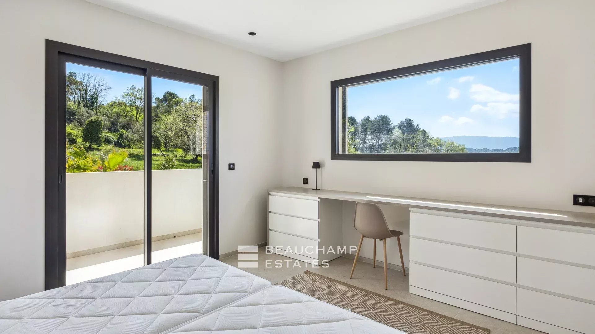 - Chambre de maître, en suite, ouverte sur un beau balcon avec salle de bain/douche et WC