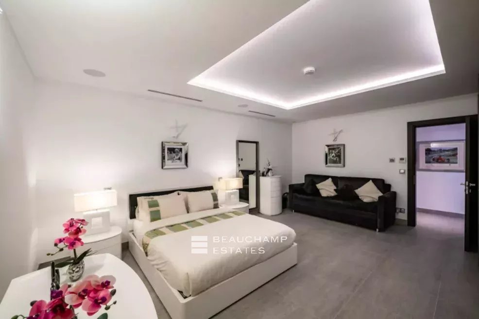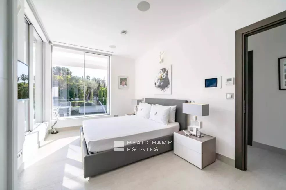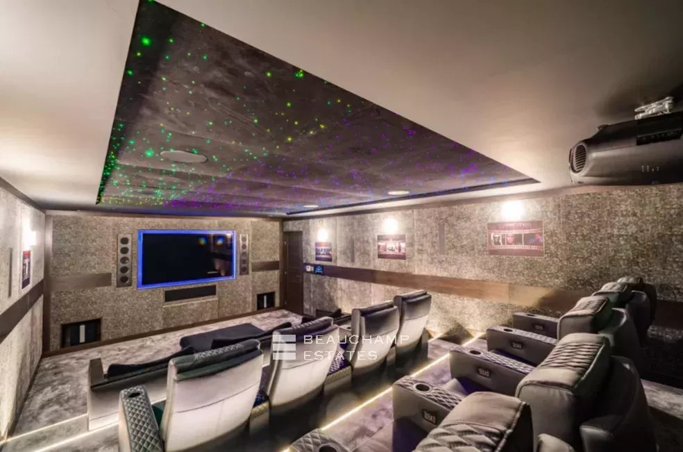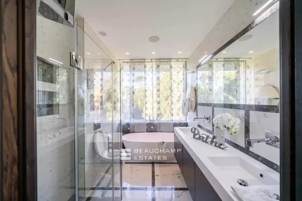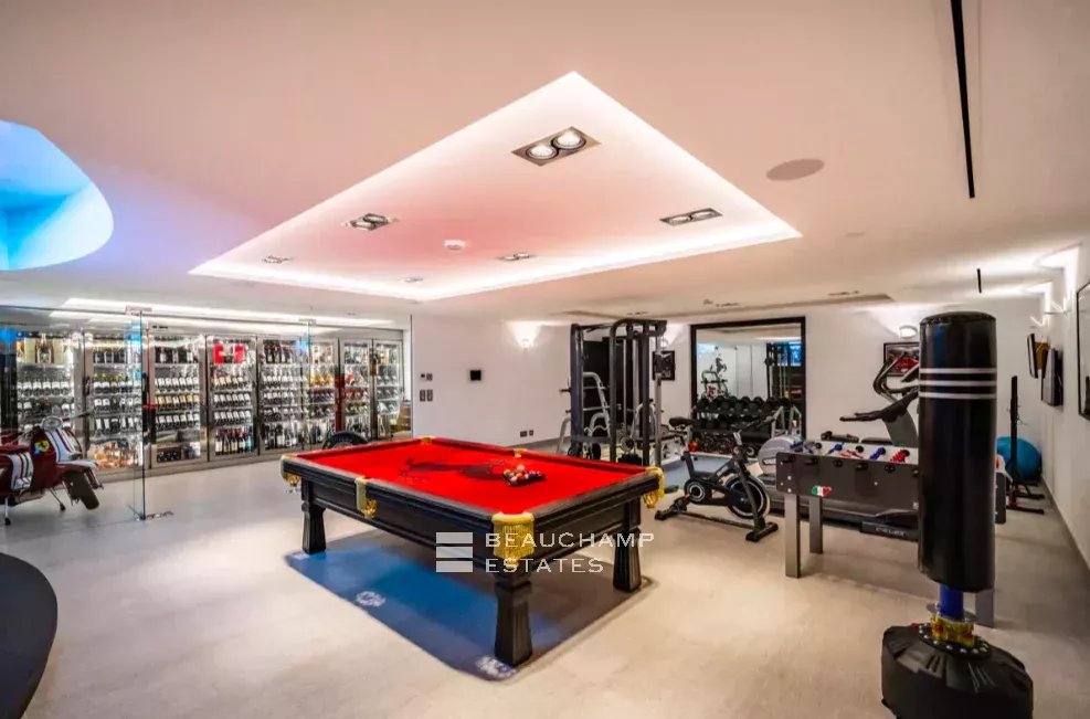 Au rez-de-chaussée, la villa offre un garage spacieux pour 8 voitures avec ascenseur, un home cinéma exceptionnel, une cave à vin et un espace fitness, deux autres chambres pour invités ou gardiens avec salles de bains, buanderie et nombreux rangements.