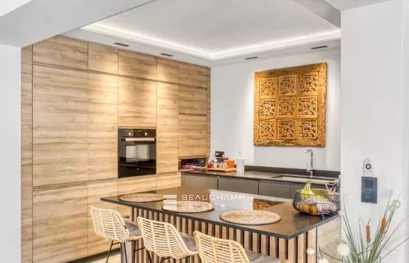 Entièrement rénovée, la villa se compose d’un vaste salon-séjour de 42 m² avec cuisine ouverte, baigné de lumière et ouvert sur l’extérieur. L’espace nuit comprend quatre chambres, trois salles de bains, dont une chambre de maître avec dressing et salle de bains privative.