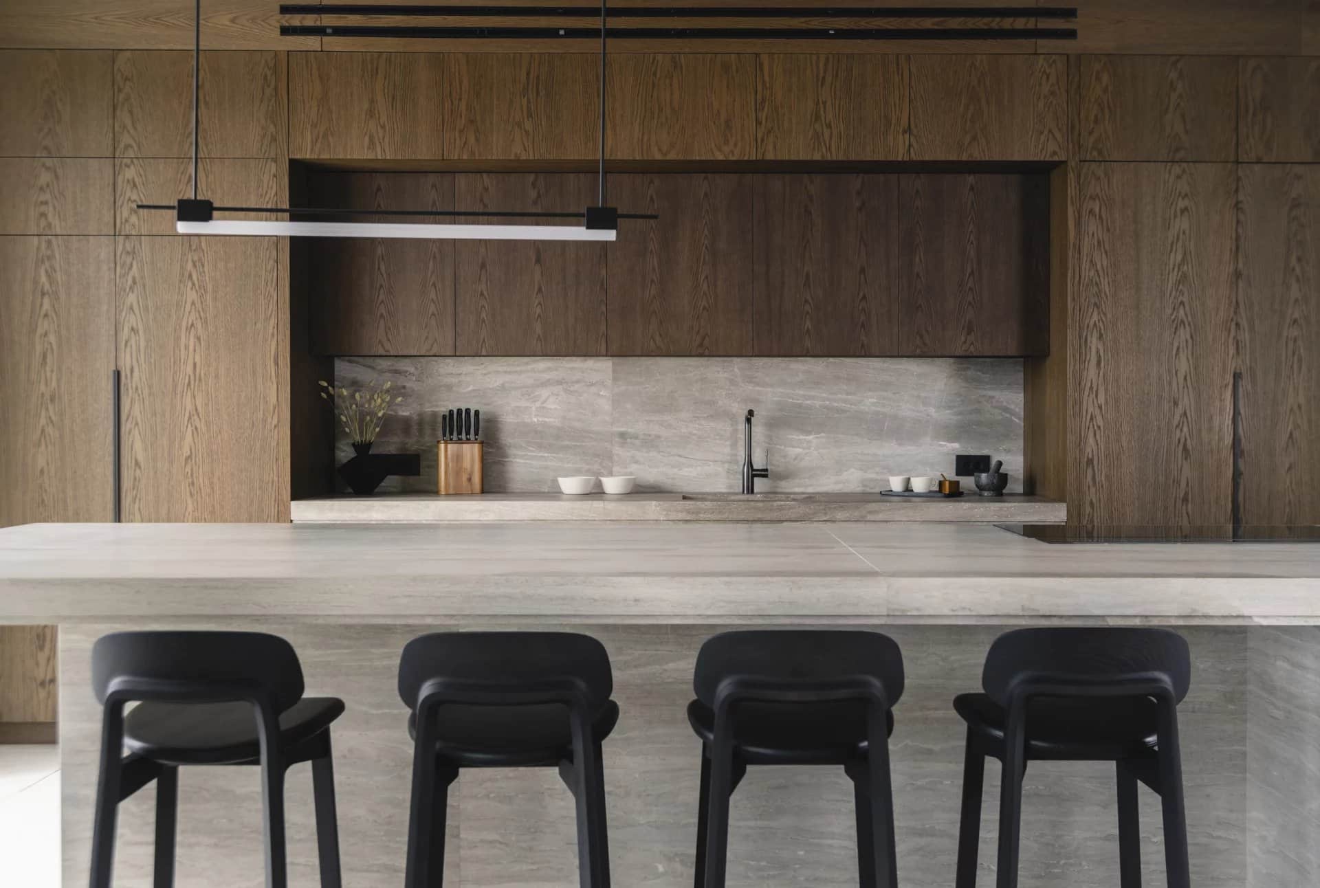 The main level offers an open-plan kitchen with direct terrace access, a sea-facing living room, a guest WC, and a separate chef’s kitchen. Outdoor spaces include a 94 m² infinity pool, shaded lounges, and multiple dining areas.