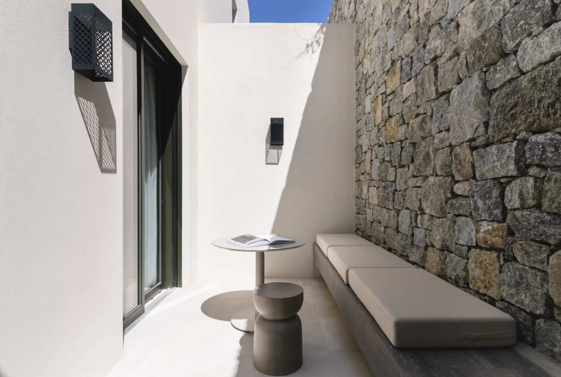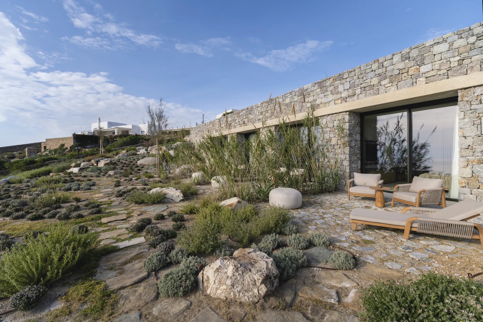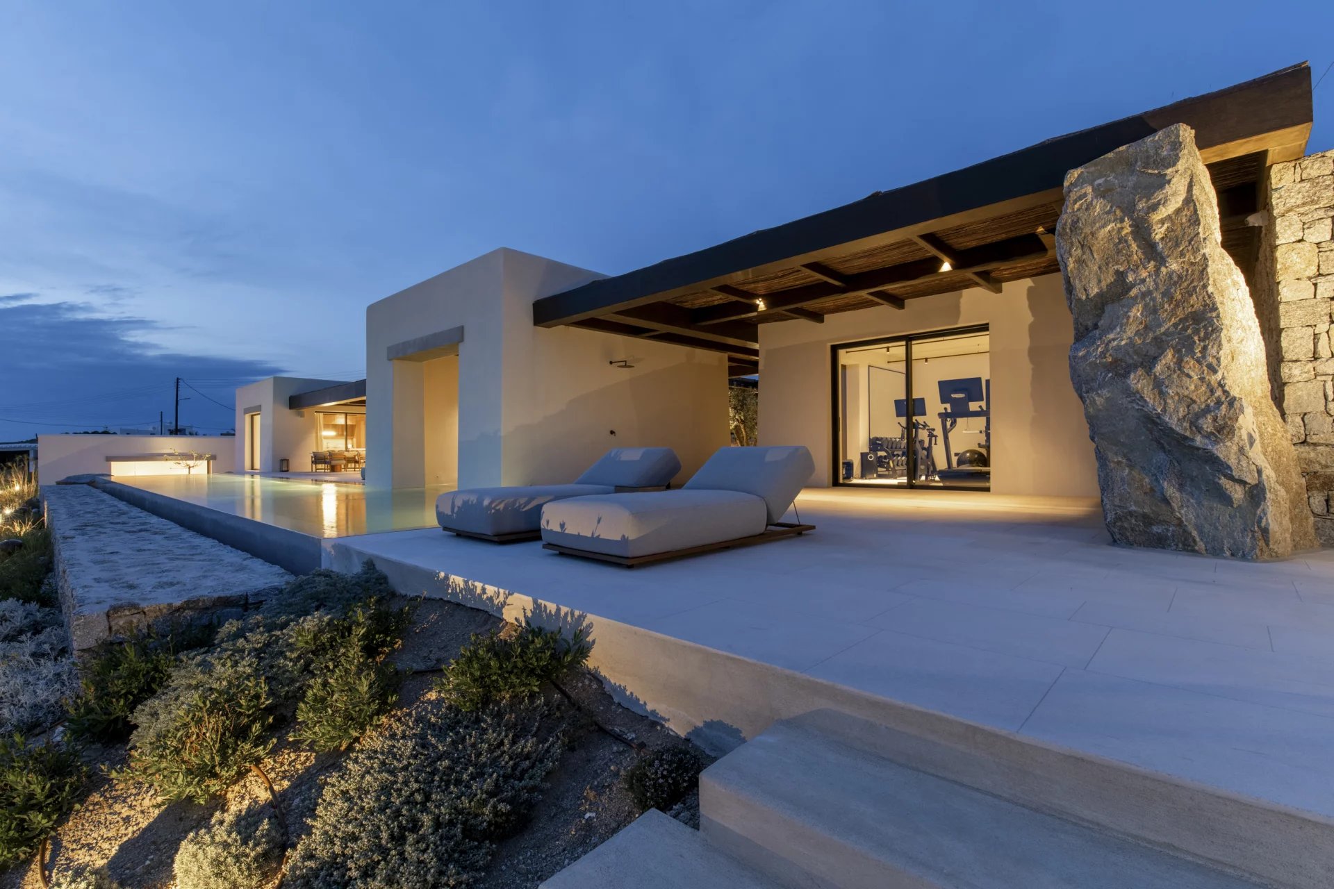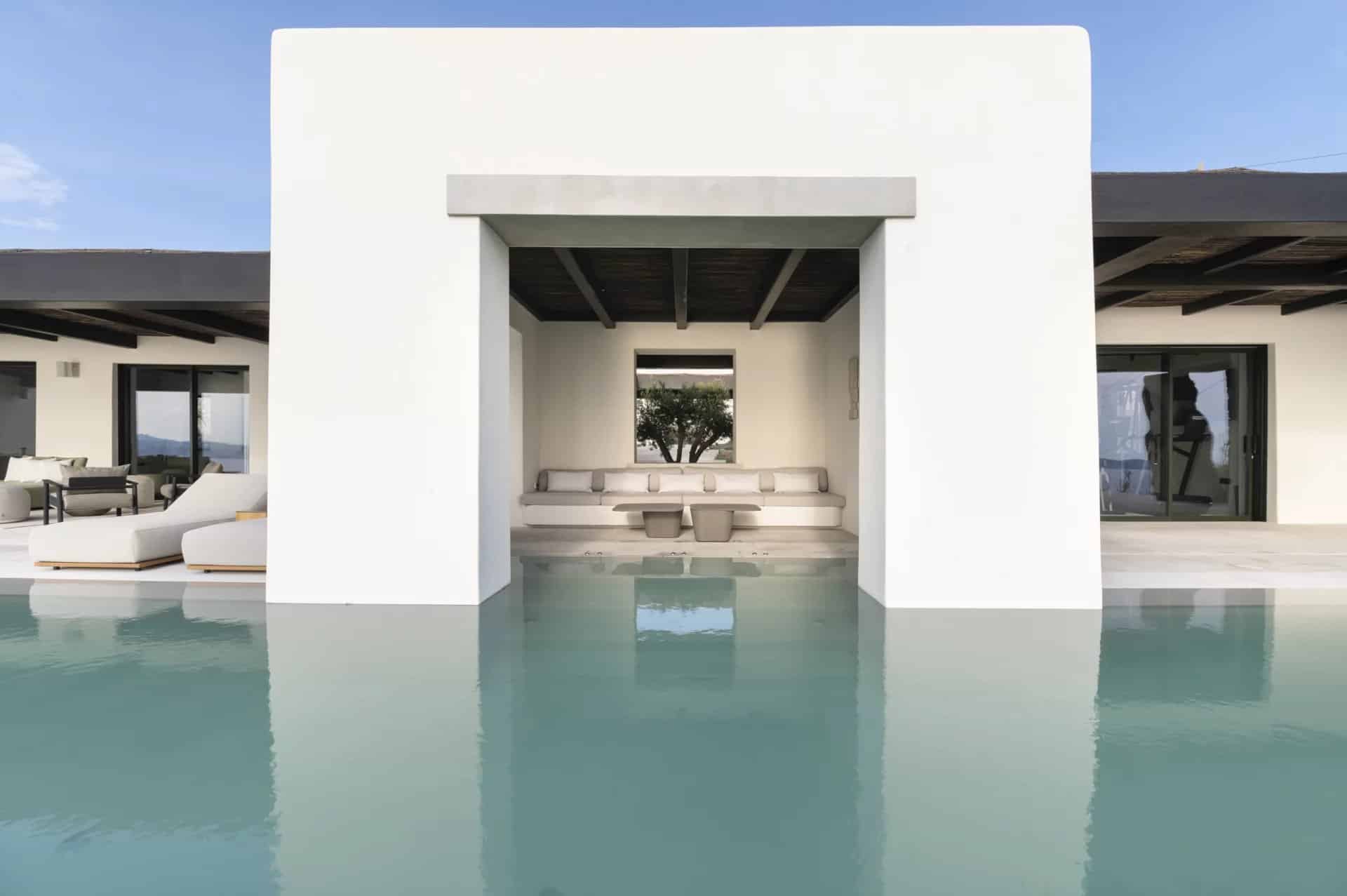 Villa Farina was designed with a deep respect for the island’s landscape and architectural heritage. Inspired by the simplicity of Cycladic white volumes, open-air courtyards, and sheltered terraces, the architecture promotes natural light, ventilation, and panoramic views. Minimal intervention preserves the natural topography, while westward orientation captures views over Delos, Rhenia, Tinos, and Syros.