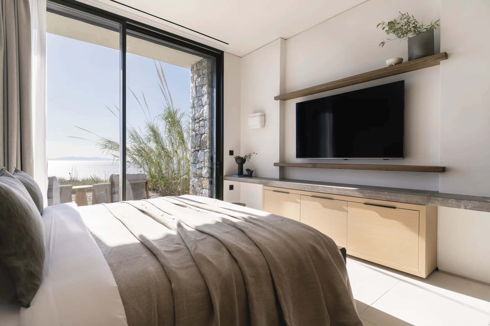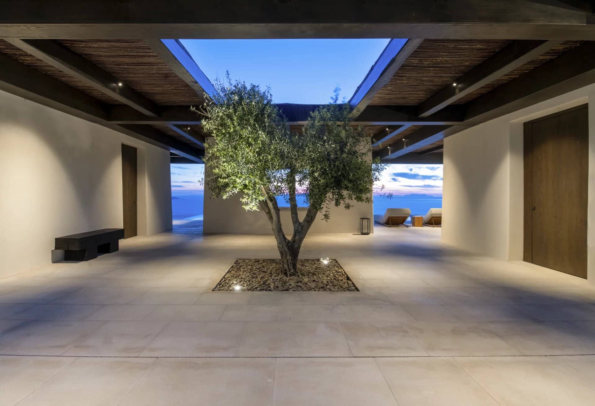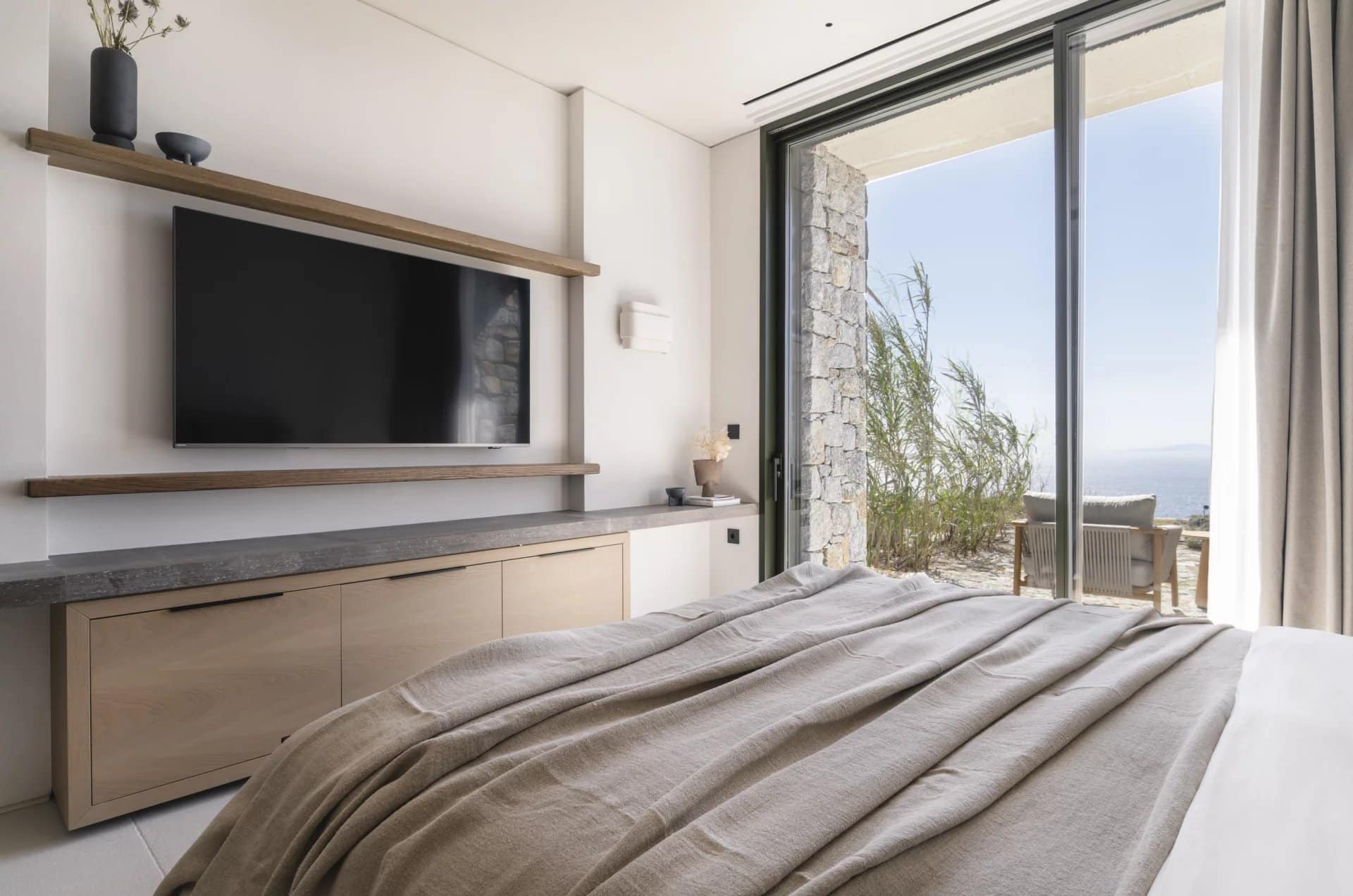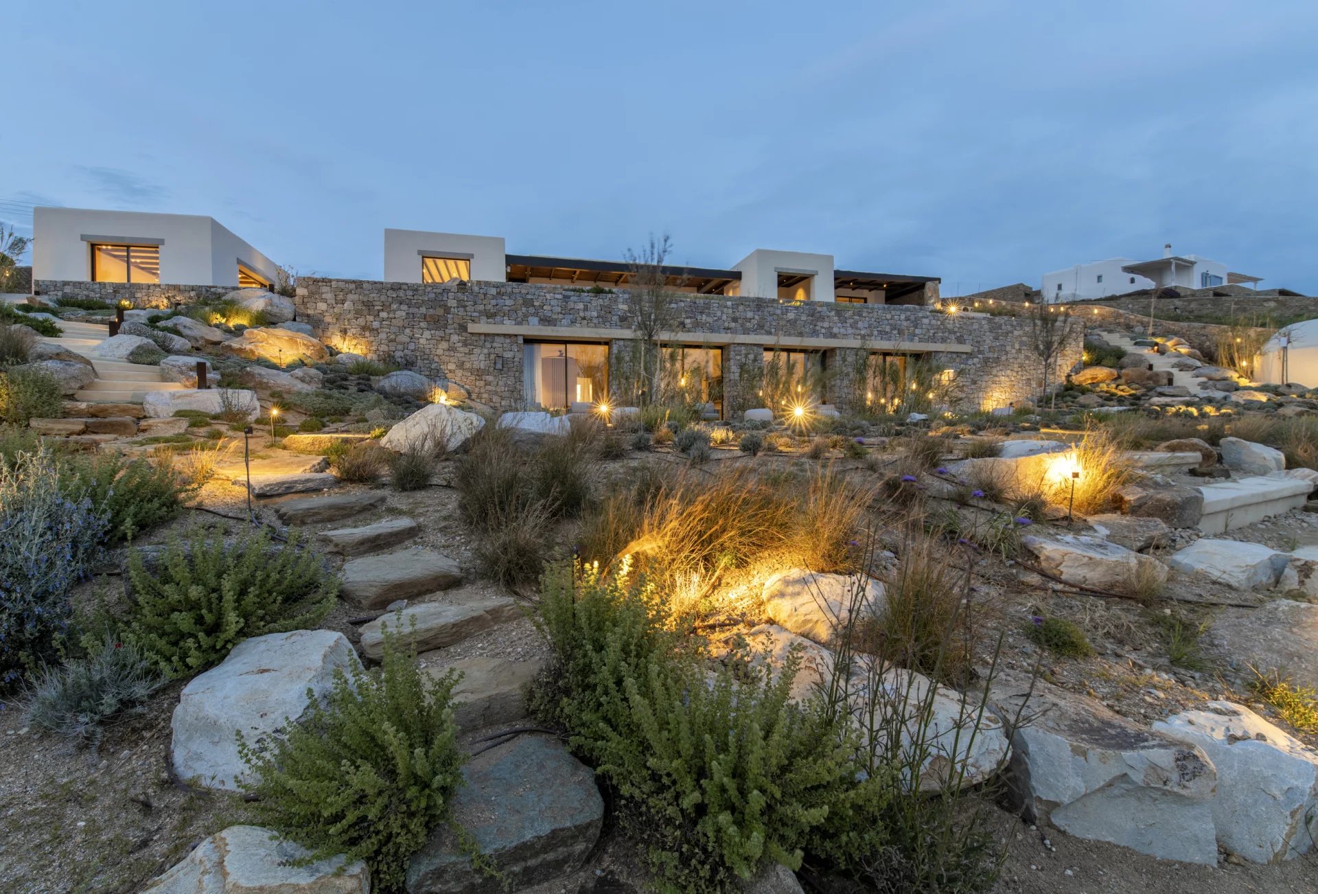 Villa Farina was designed with a deep respect for the island’s landscape and architectural heritage. Inspired by the simplicity of Cycladic white volumes, open-air courtyards, and sheltered terraces, the architecture promotes natural light, ventilation, and panoramic views. Minimal intervention preserves the natural topography, while westward orientation captures views over Delos, Rhenia, Tinos, and Syros.
