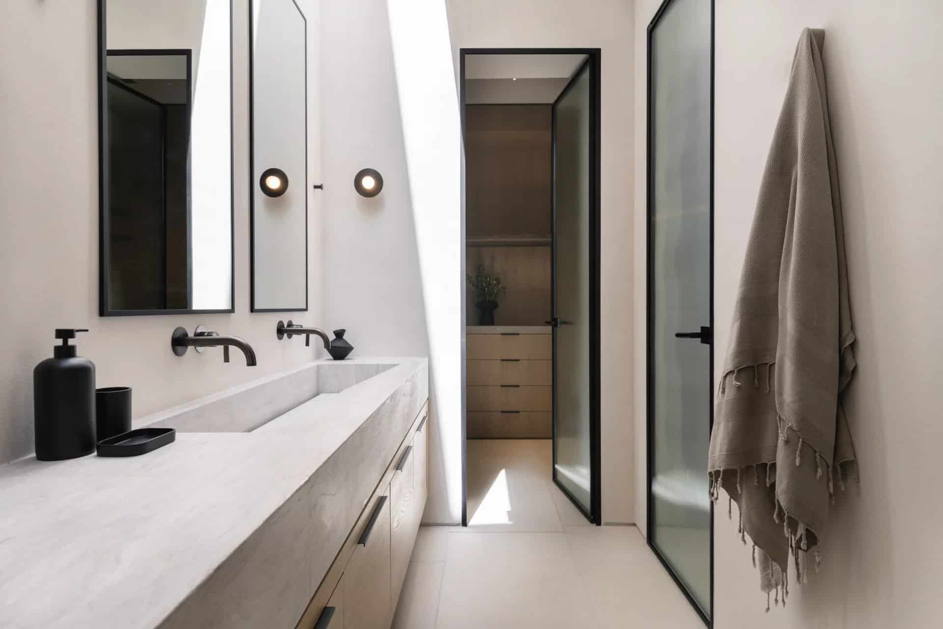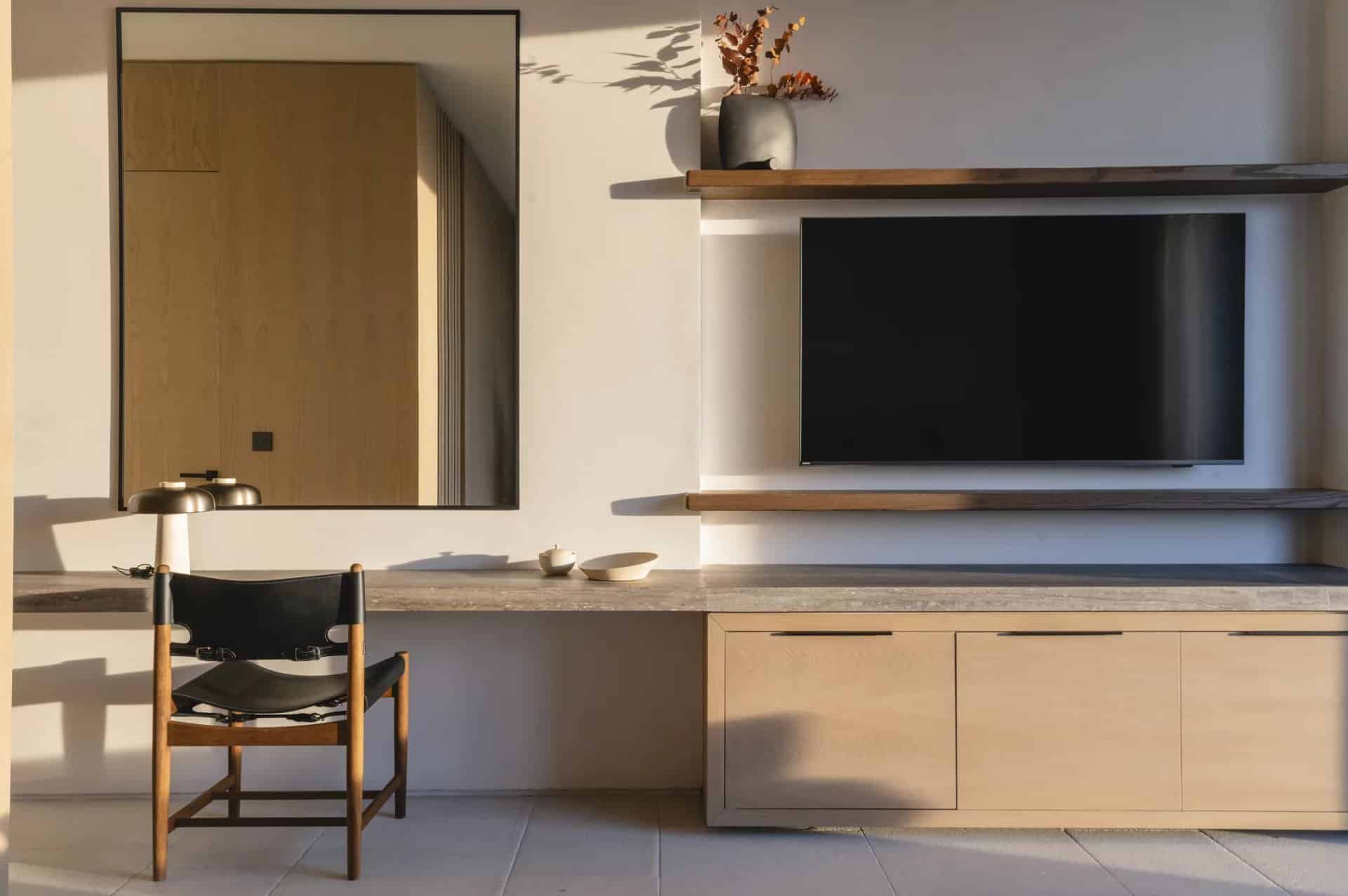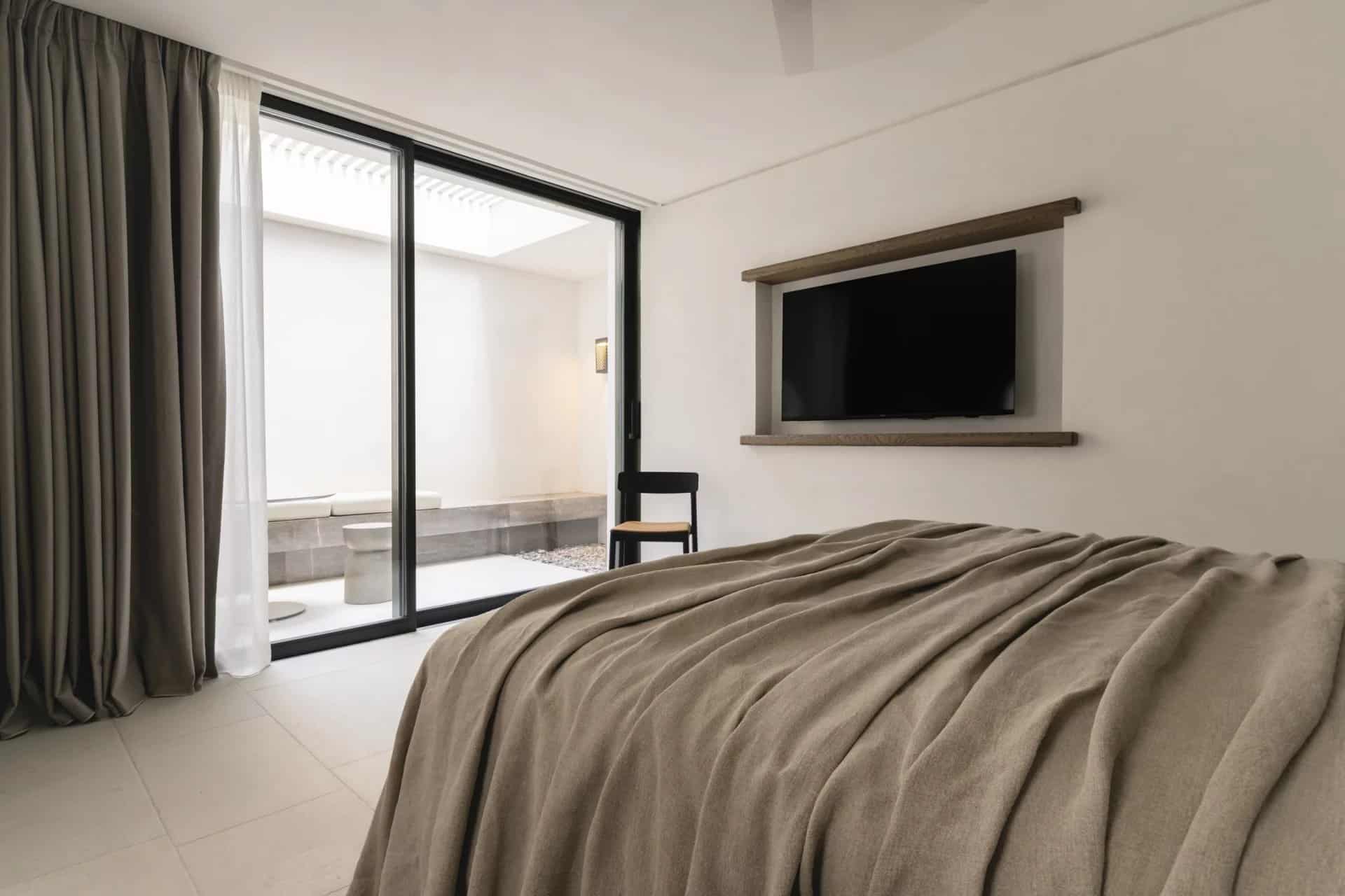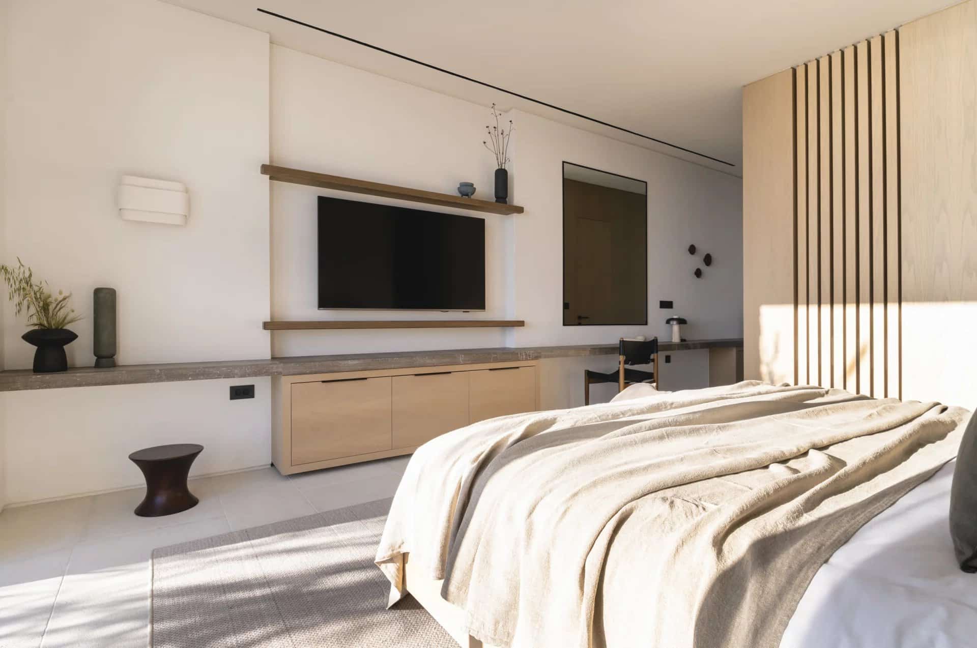 Villa Farina was designed with a deep respect for the island’s landscape and architectural heritage. Inspired by the simplicity of Cycladic white volumes, open-air courtyards, and sheltered terraces, the architecture promotes natural light, ventilation, and panoramic views. Minimal intervention preserves the natural topography, while westward orientation captures views over Delos, Rhenia, Tinos, and Syros.